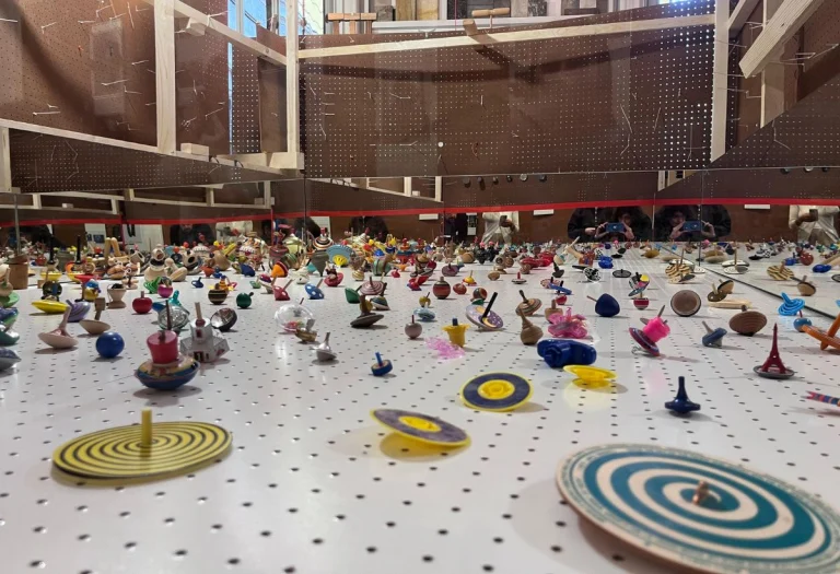 El corazón de la muestra, sin embargo, está en los juegos. Trompos, mecanismos ópticos, artefactos cinéticos: objetos aparentemente simples que esconden una complejidad técnica y conceptual. Como apunta la curaduría, incluso el trompo —uno de los protagonistas— encarna esa dualidad: cualquiera puede hacerlo girar, pero dominarlo requiere precisión, práctica y conocimiento.