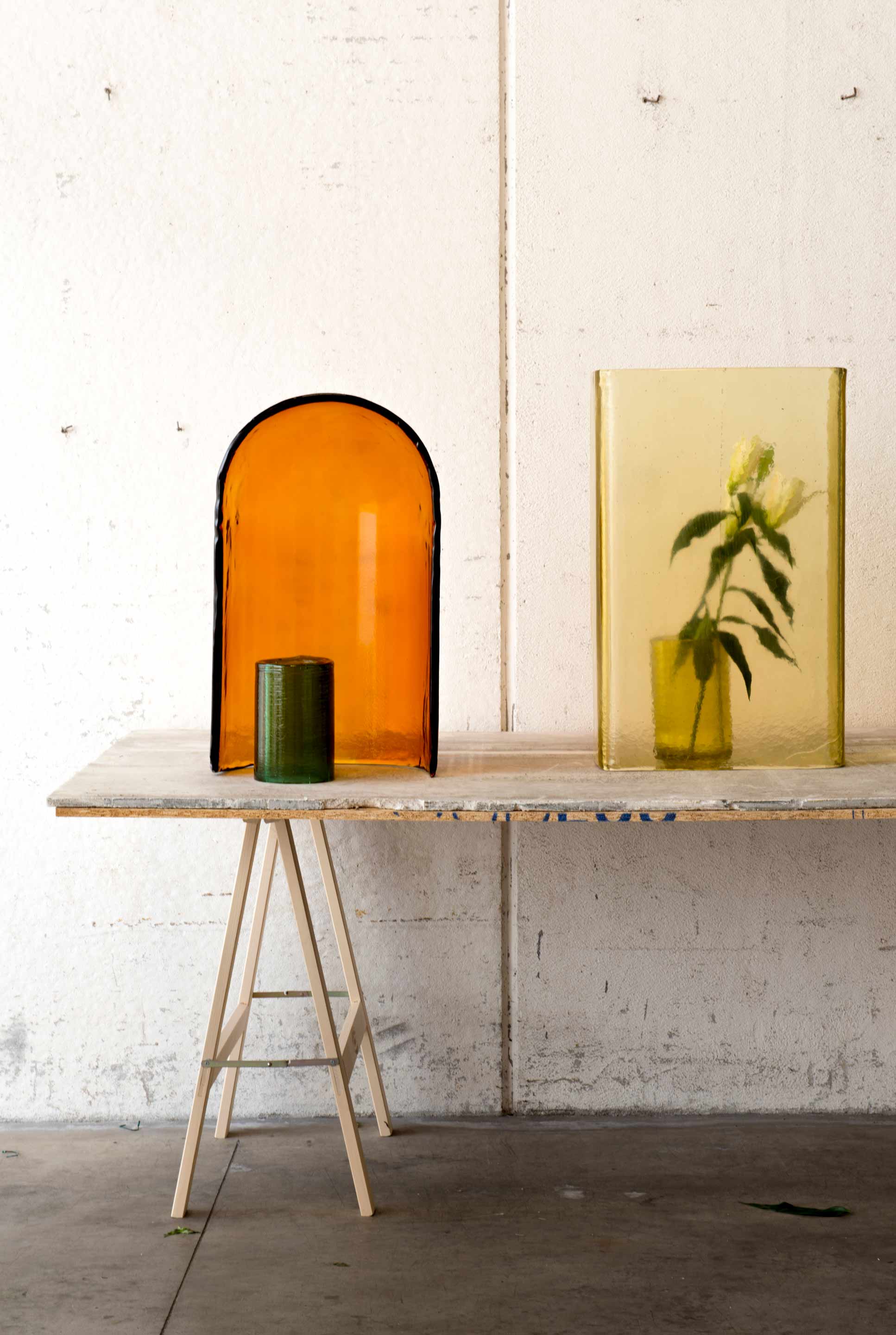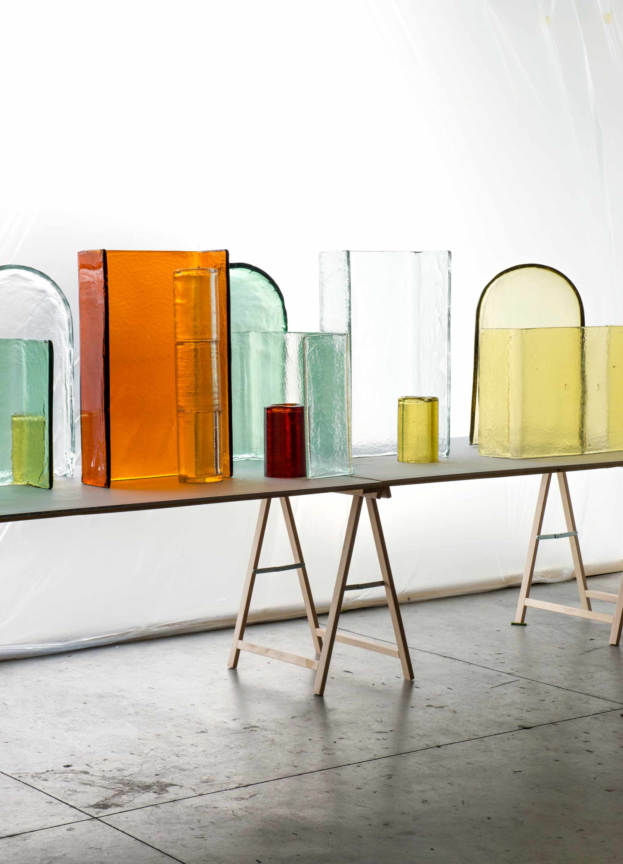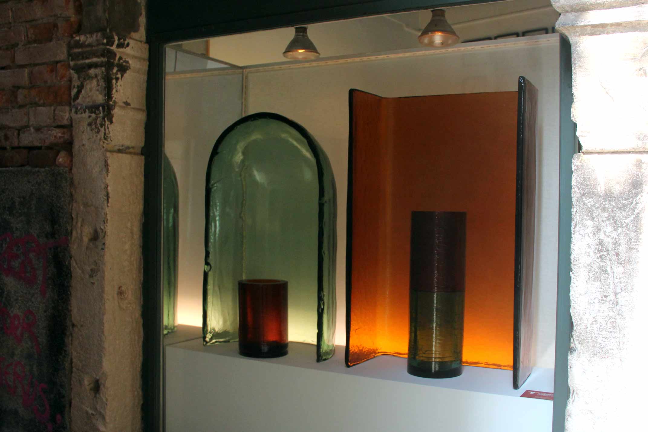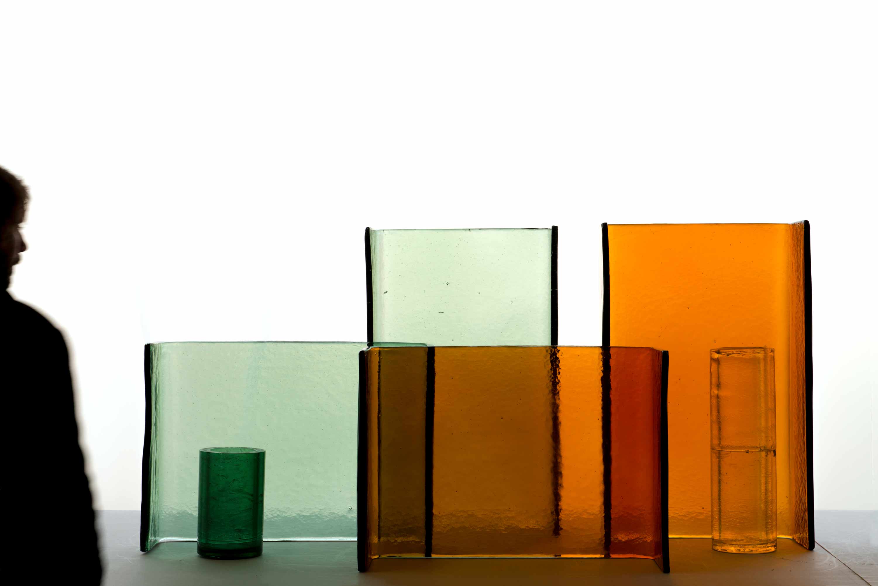 Alcova para la firma Wonderglass consiste en elementos de vidrio coloreado –cristal, ámbar claro, verde y ámbar– en formas simples planas o semicirculares que están dispuestas como un conjunto, haciendo que la transparencia y el brillo de los diversos elementos de color interactúen; algunos elementos cilíndricos pequeños y modulares que se adaptan a las piezas más grandes completan el trabajo.