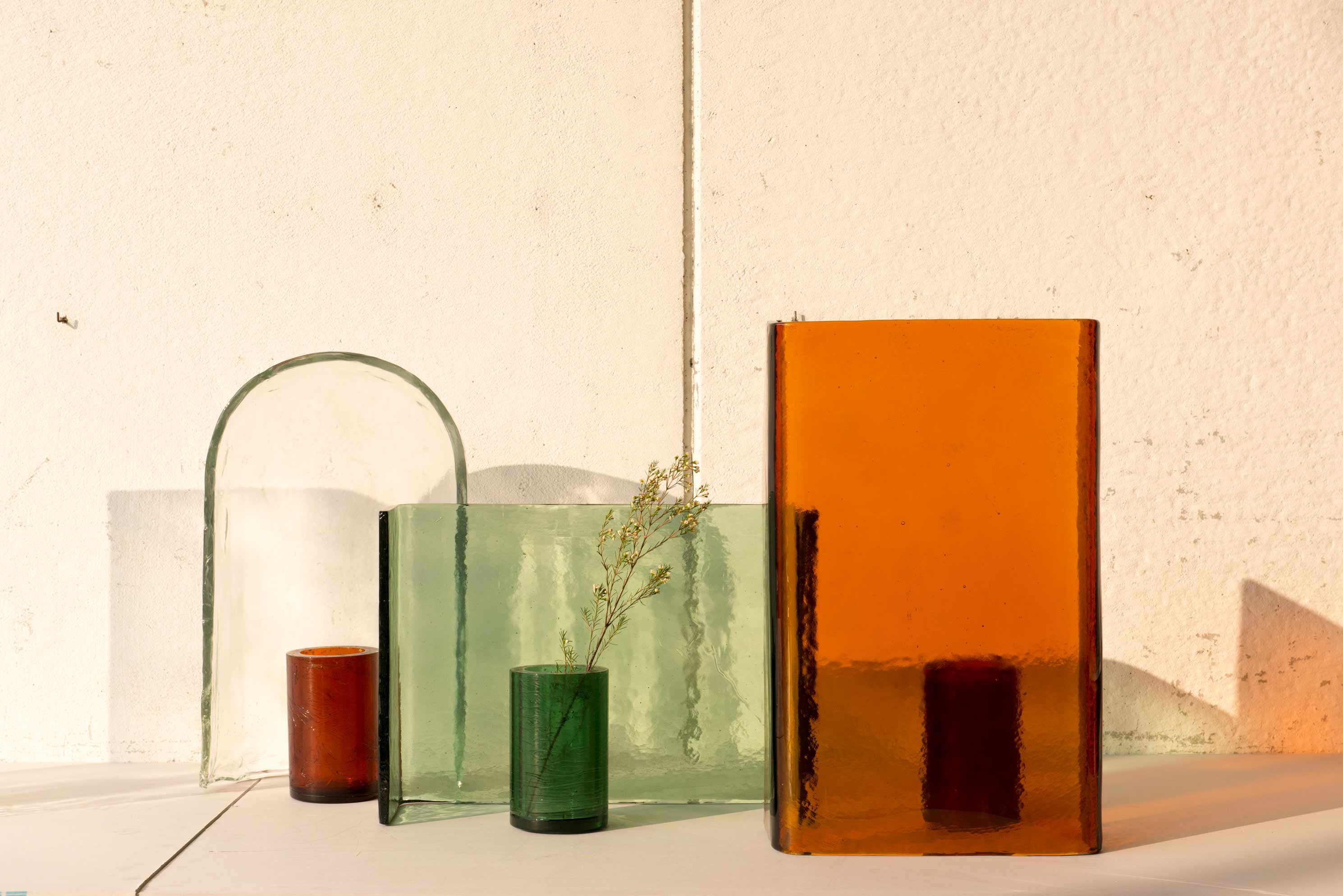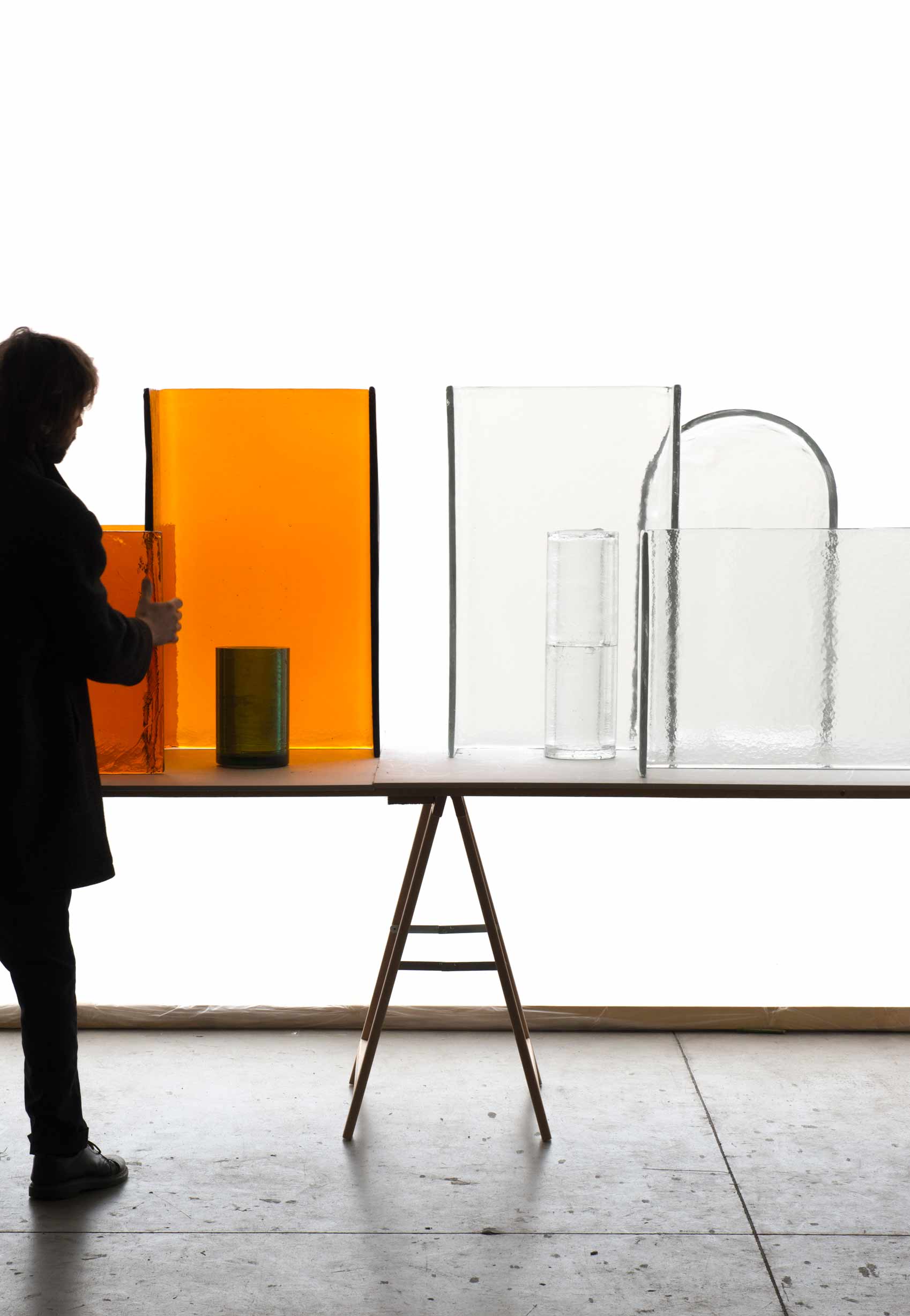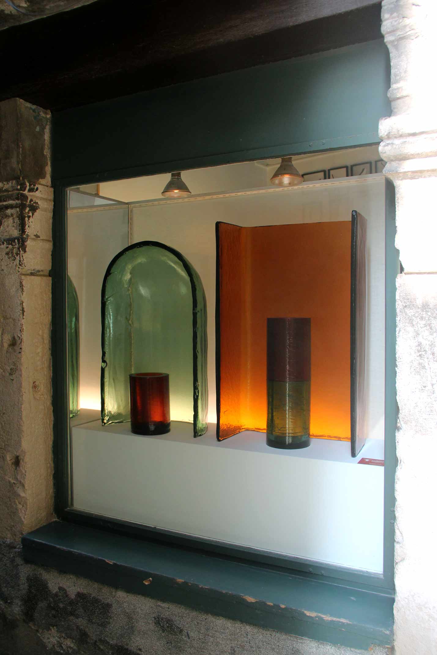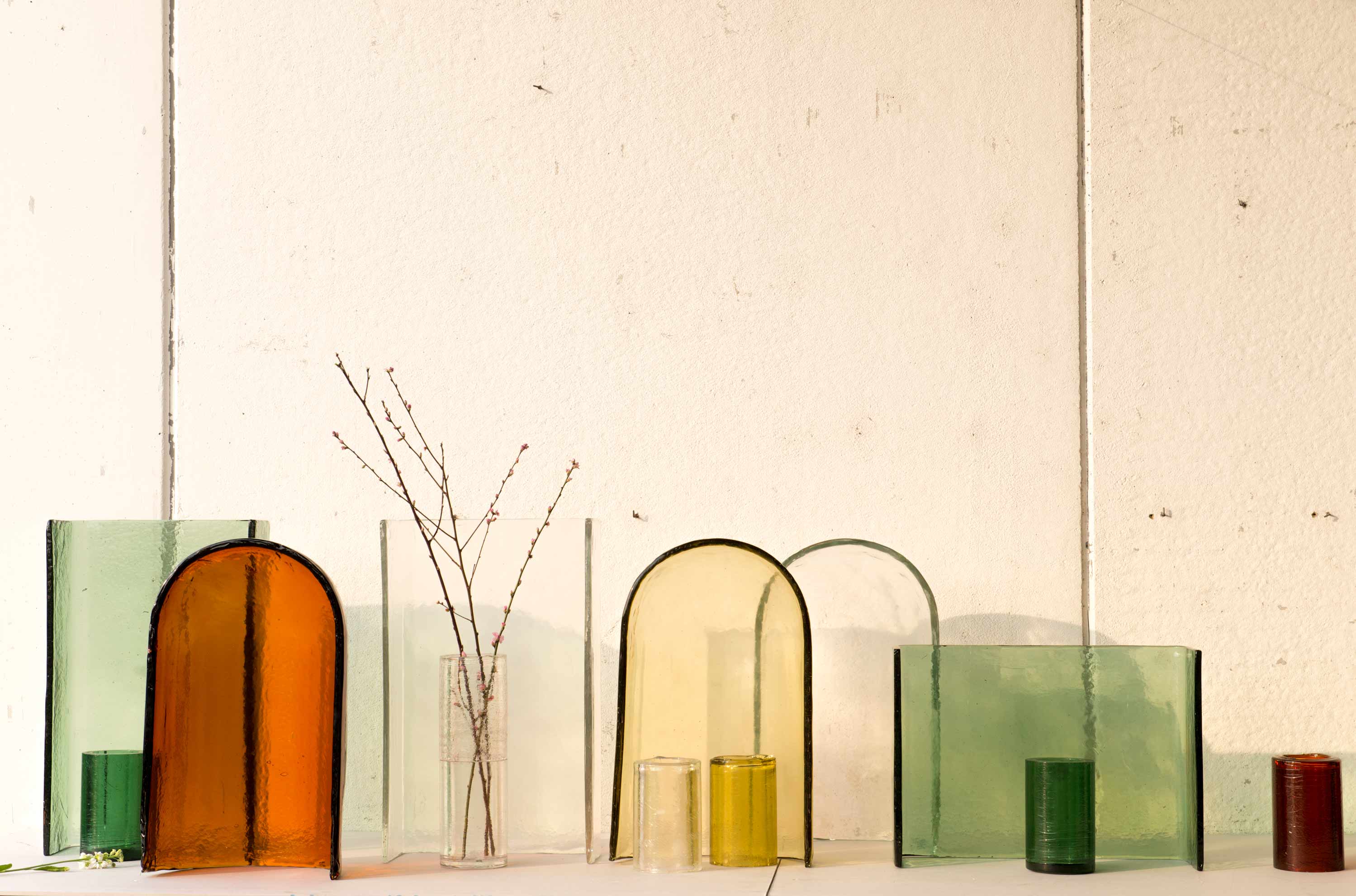 Alcova para la firma Wonderglass consiste en elementos de vidrio coloreado –cristal, ámbar claro, verde y ámbar– en formas simples planas o semicirculares que están dispuestas como un conjunto, haciendo que la transparencia y el brillo de los diversos elementos de color interactúen; algunos elementos cilíndricos pequeños y modulares que se adaptan a las piezas más grandes completan el trabajo.