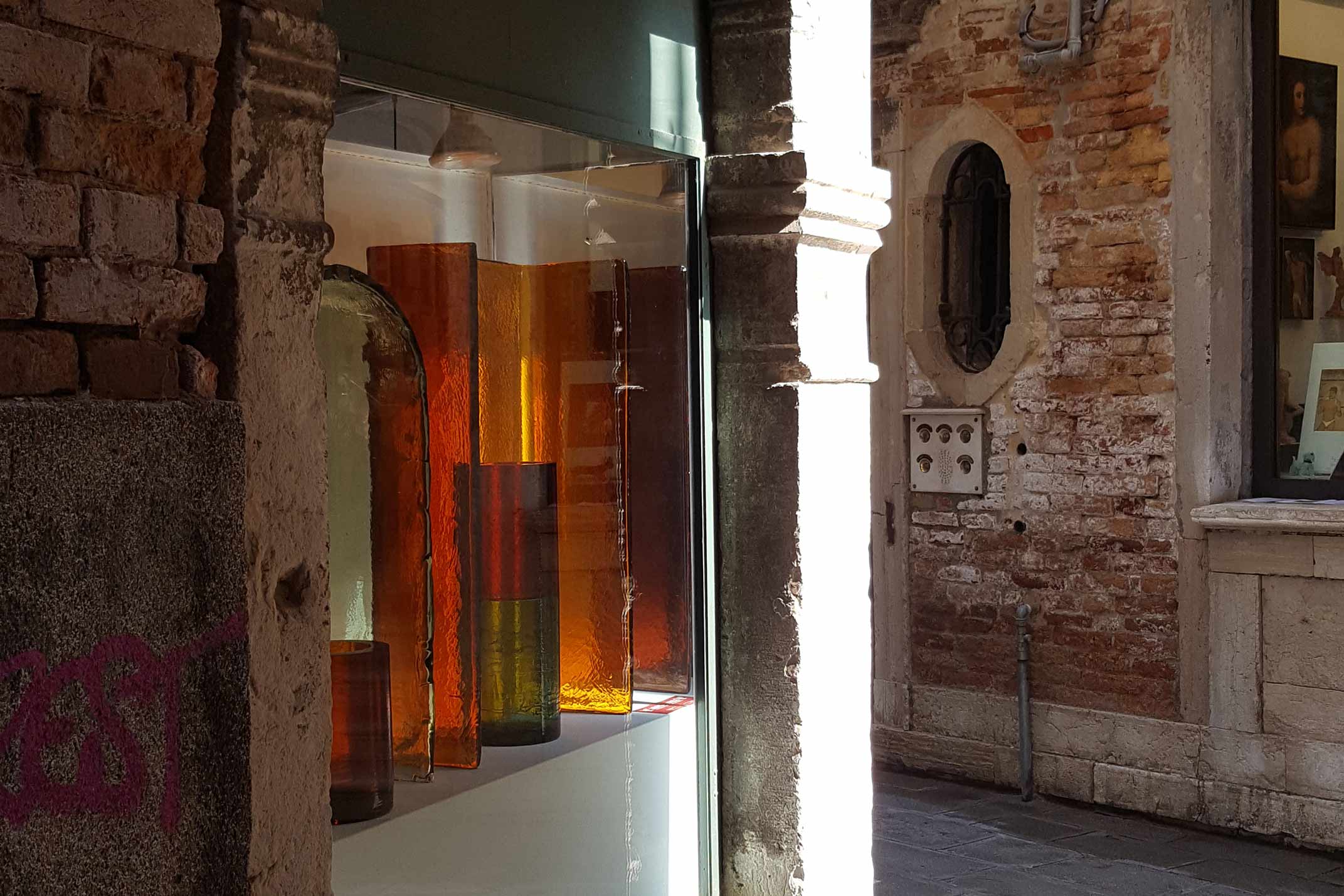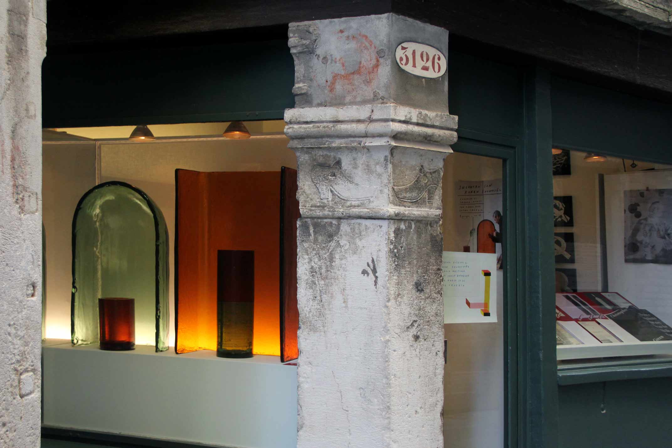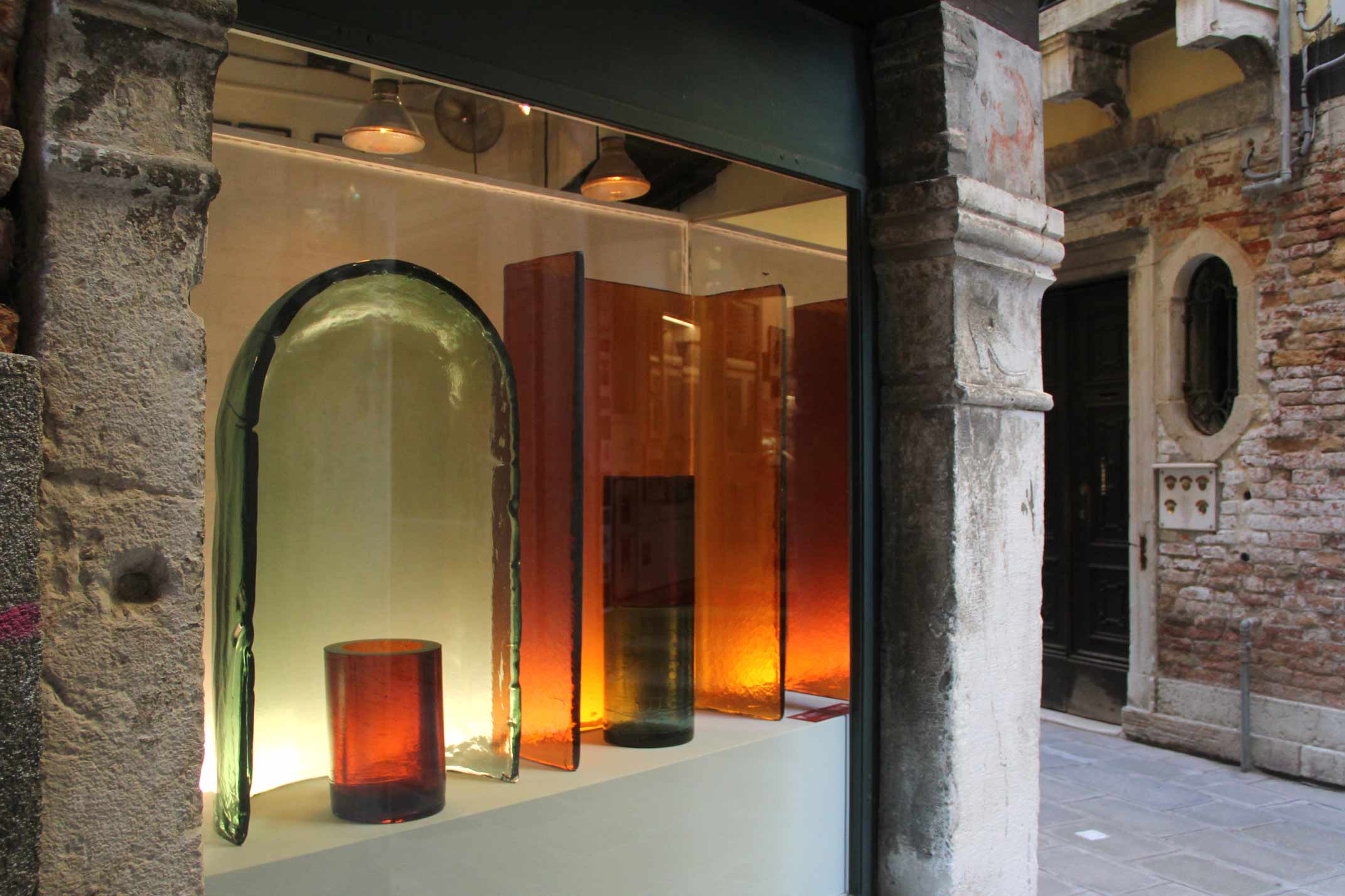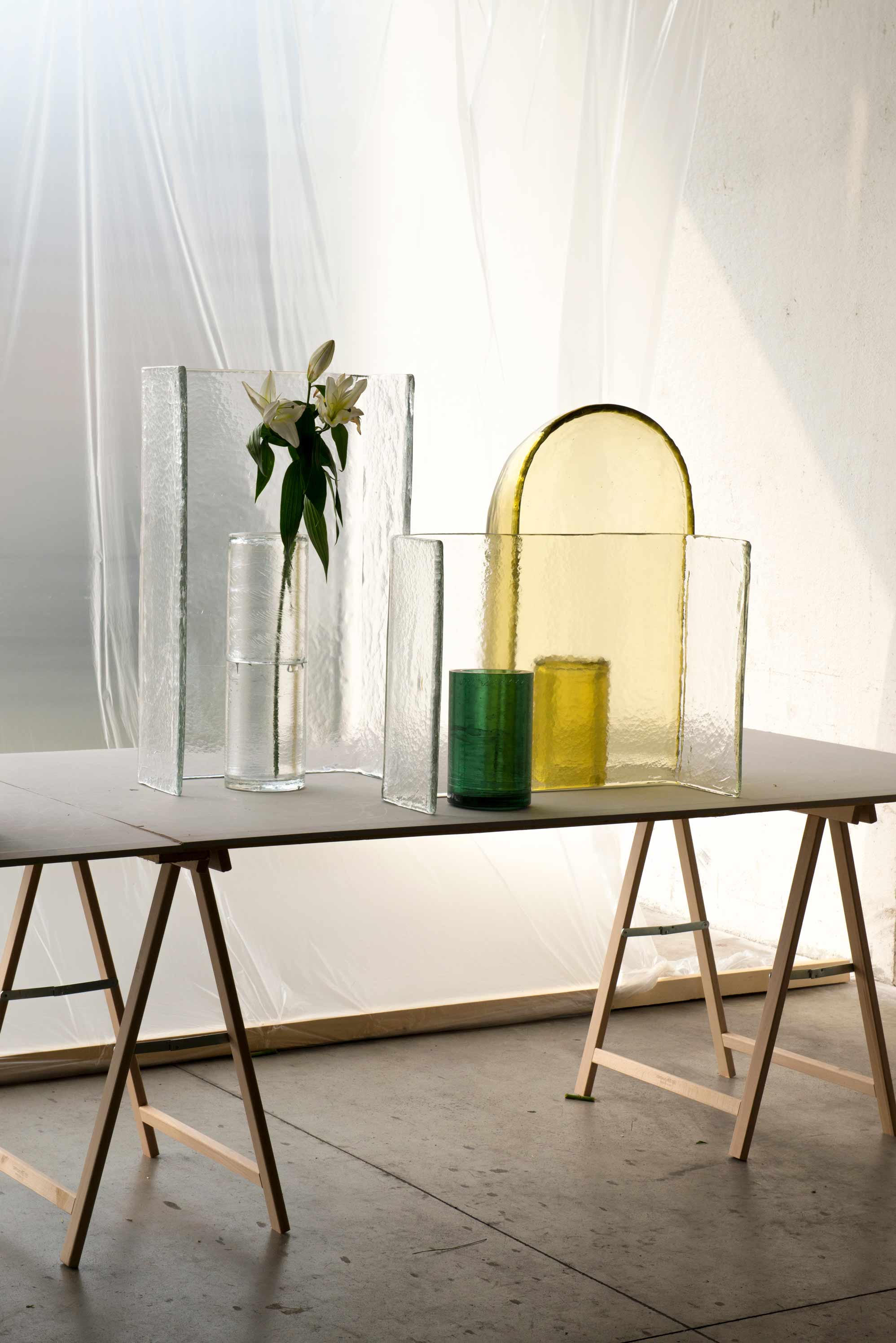 Alcova para la firma Wonderglass consiste en elementos de vidrio coloreado –cristal, ámbar claro, verde y ámbar– en formas simples planas o semicirculares que están dispuestas como un conjunto, haciendo que la transparencia y el brillo de los diversos elementos de color interactúen; algunos elementos cilíndricos pequeños y modulares que se adaptan a las piezas más grandes completan el trabajo.
