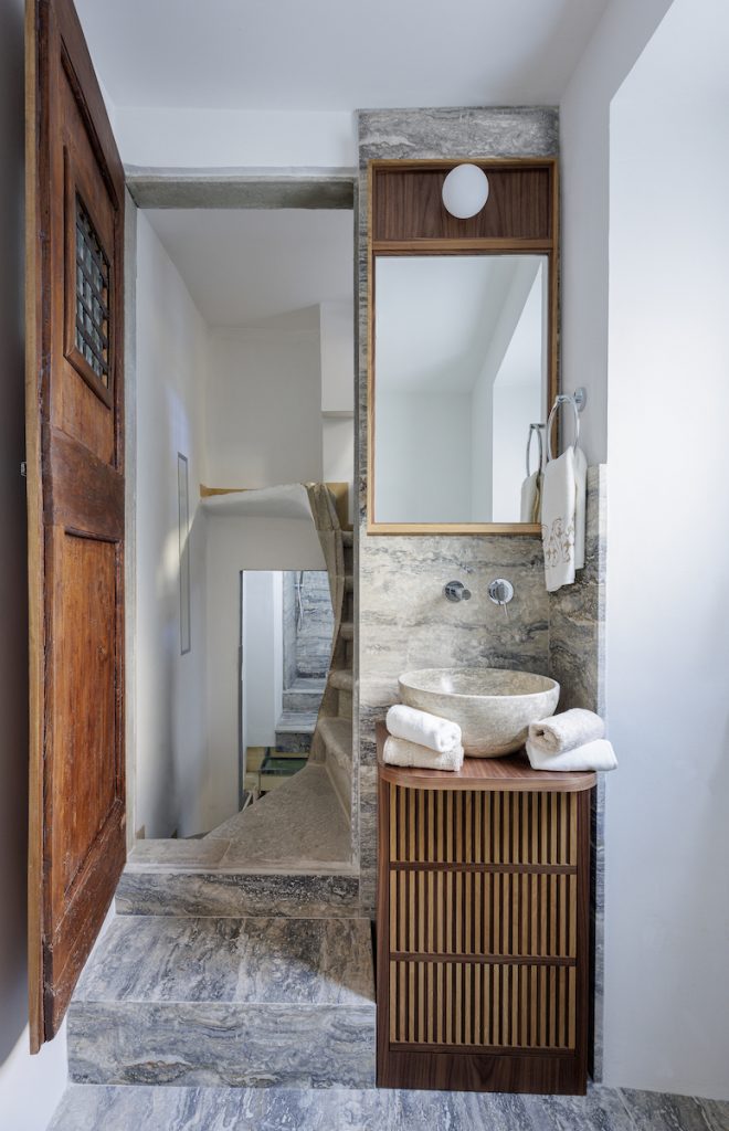 El comedor está iluminado por la lámpara colgante Skygarden, de Marcel Wanders para Flos, marca también representada por las dos IC Lights negras, del diseñador chipriota Michael Anastassiades en la zona de la cocina, producidas por Elmar en madera y latón con un diseño de los arquitectos, con una tapa de travertino de nogal realizada por un artesano local en cálidos tonos tierra mediterráneos, realzada por el rojo de los taburetes Archibald de Poltrona Frau.