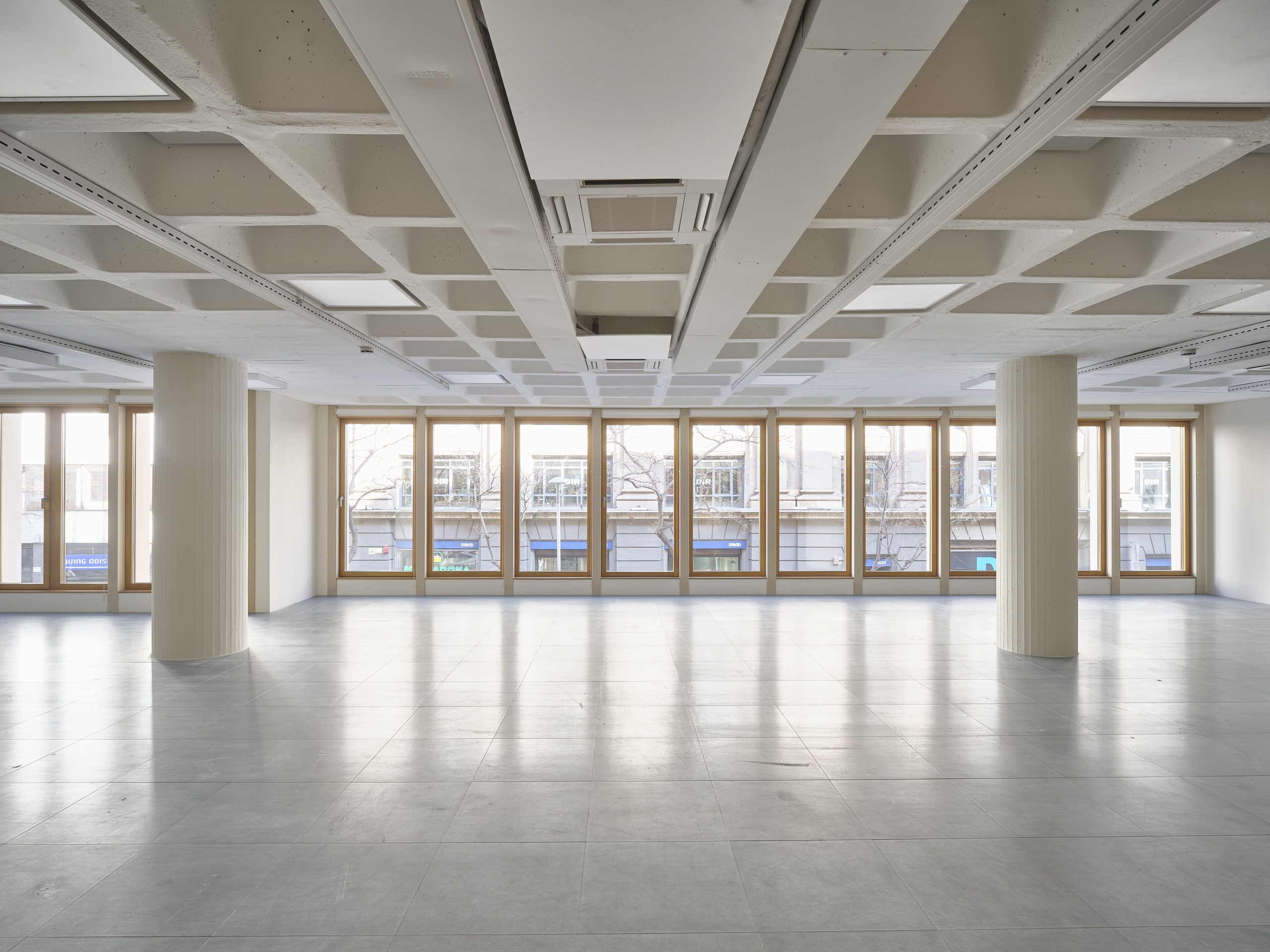La fachada principal incorpora piezas de hormigón arquitectónico prefabricado que reinterpretan la piedra de Montjuïc, recuperando la tradición material del Ensanche e integrándose armónicamente en el contexto urbano.