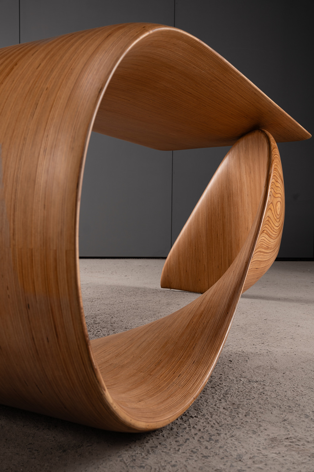 Cada mueble es una obra que refleja la visión del estudio: fusionar el arte con el diseño funcional, desafiando los métodos tradicionales de fabricación. En lugar de múltiples componentes ensamblados, LOOP presenta superficies autoportantes que se entrelazan de forma continua, generando una sensación de unidad y movimiento.