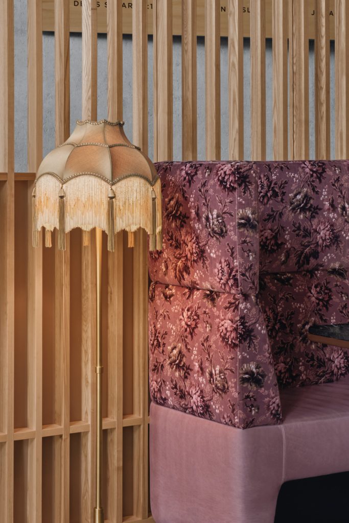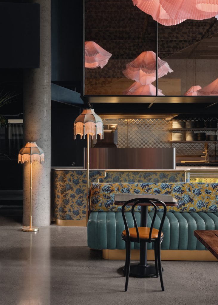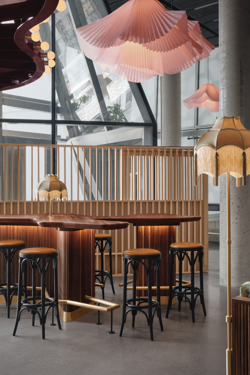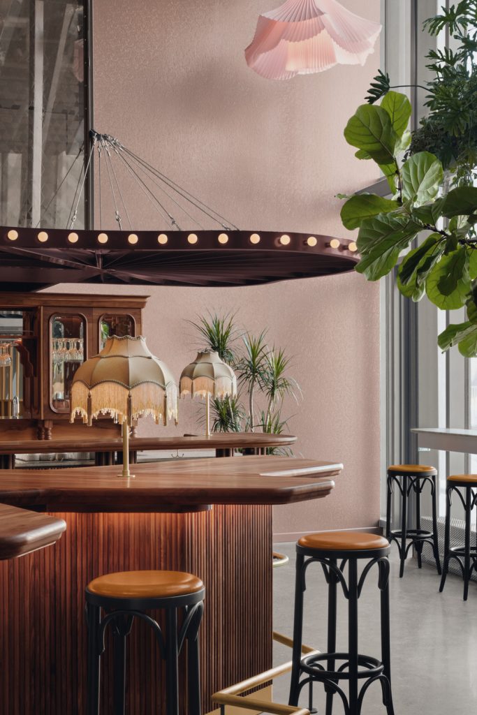 Los altos techos del espacio se redujeron a una escala más íntima y humana mediante la inserción de una marquesina sobre la zona del bar. Los elementos de diseño de la barra trasera incluyen vidrio biselado, espejos y retroiluminación que recuerdan a un vestuario teatral, y su dosel completa un ambiente de nivel del suelo caracterizado por indicios de una atmósfera similar a una casa de muñecas que atrae a los clientes del café.