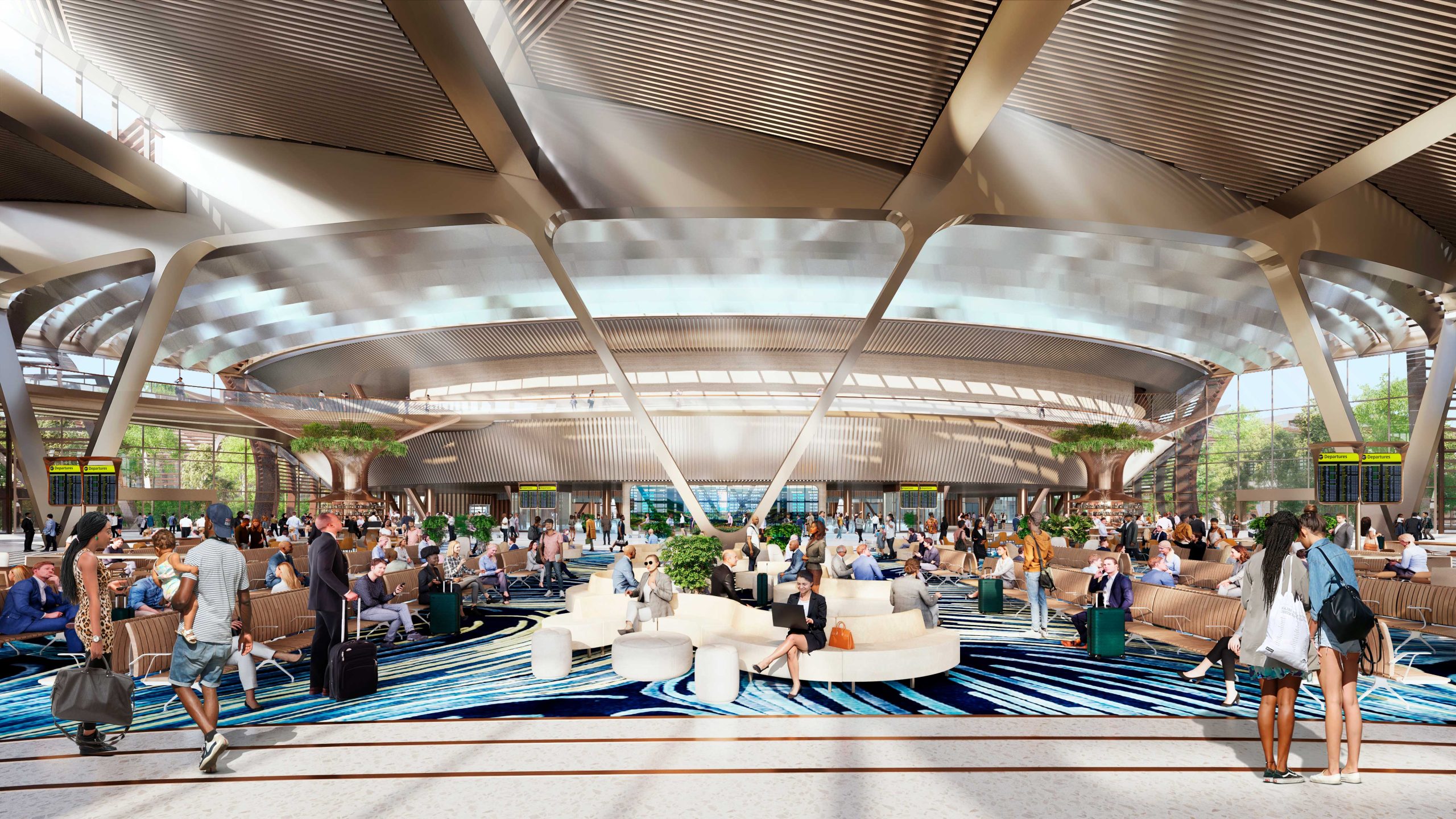 En su primera fase, el aeropuerto atenderá a 60 millones de pasajeros anuales, con una proyección de hasta 110 millones en etapas posteriores, cuatro pistas y estacionamiento para 270 aeronaves. El diseño responde a un modelo de tránsito intensivo: hasta el 80 % de los pasajeros serán de conexión, por lo que se integran hoteles airside, áreas de descanso, jardines interiores, espacios comerciales y una oferta amplia de hospitalidad.