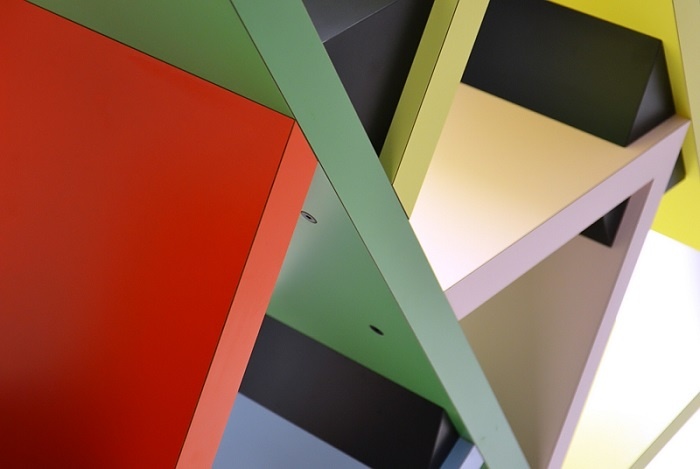 El tercer nivel de la estantería presenta un detalle que llama la atención por la composición antropomorfa que asemeja a un cuerpo. Se forma por un triángulo equilátero en su parte inferior, siguiéndole una pieza horizontal que en cada lado forma noventa grados con un rectángulo perpendicular y un tercer rectángulo en la parte central que sostiene un cuadrado.