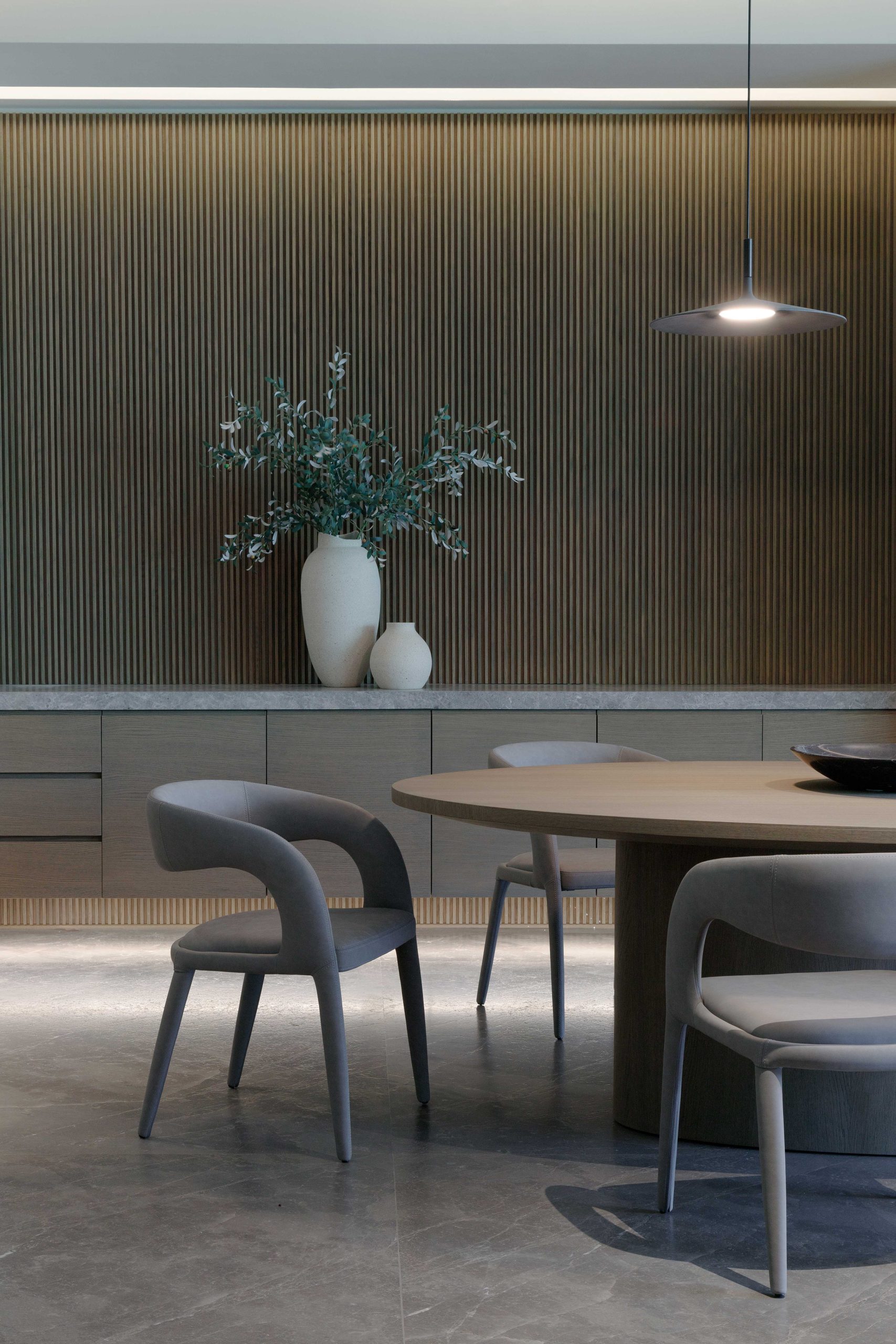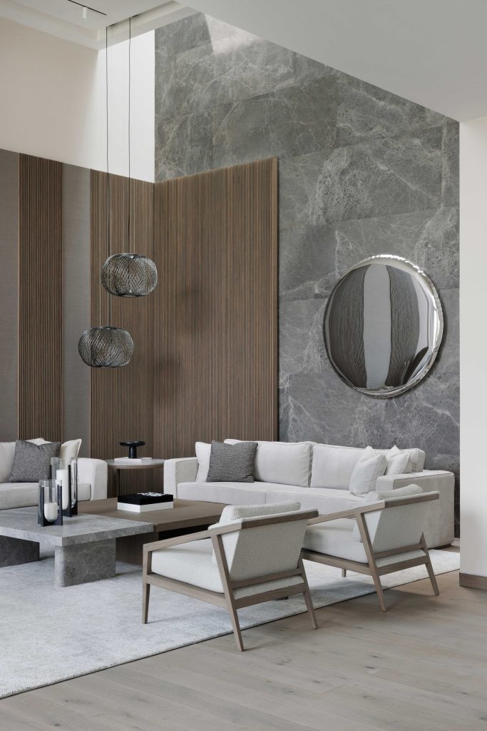 La combinación de texturas y acabados evita el contraste abrupto y apuesta por una lectura envolvente, donde cada material cumple una función estética y sensorial dentro del conjunto.