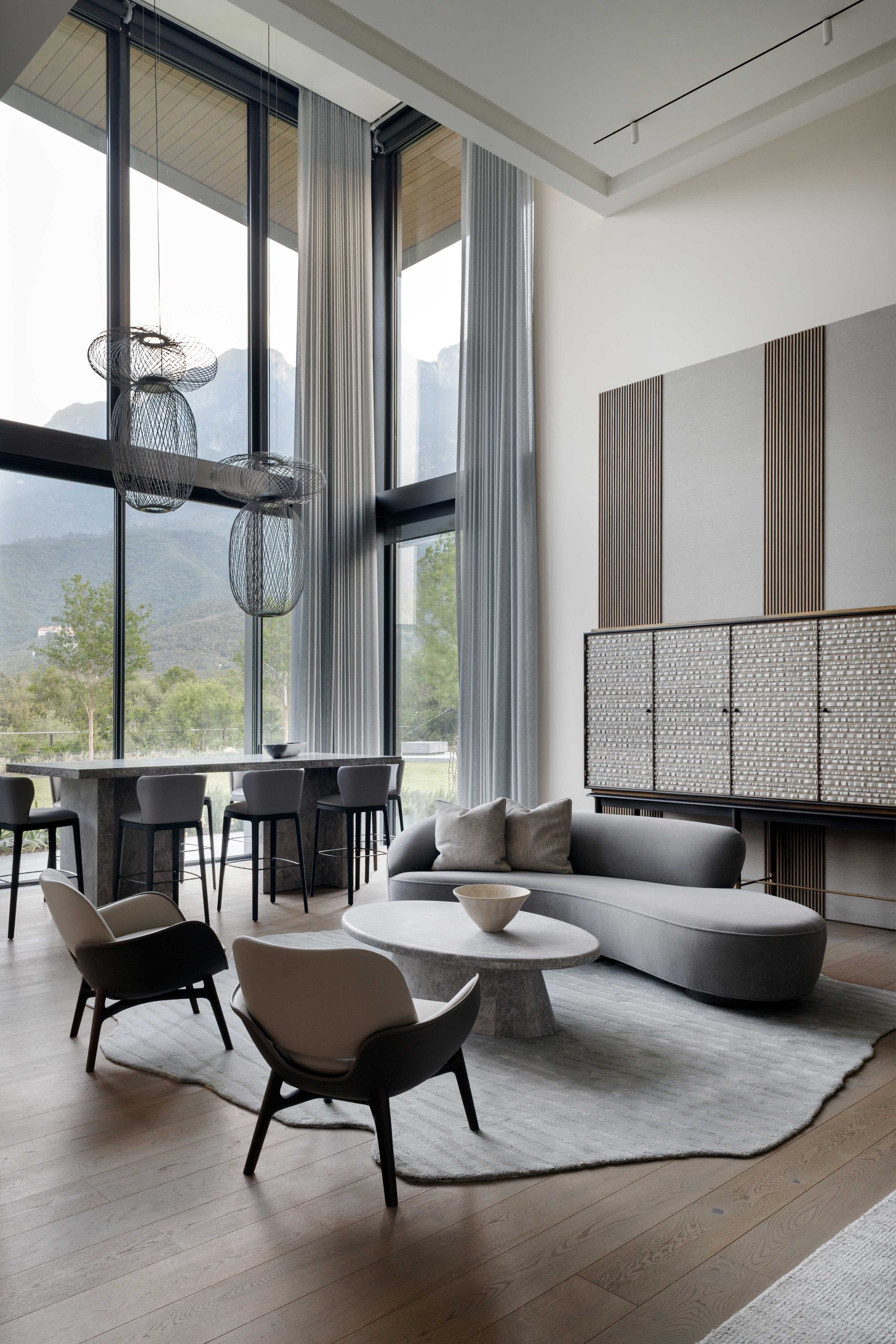 La segunda zona, más casual, incorpora líneas curvas y tonos aperlados que construyen una atmósfera relajada y sofisticada. Al fondo, el bar se define por una barra monolítica de mármol y cortinas traslúcidas de siete metros que enmarcan las vistas hacia la sierra.