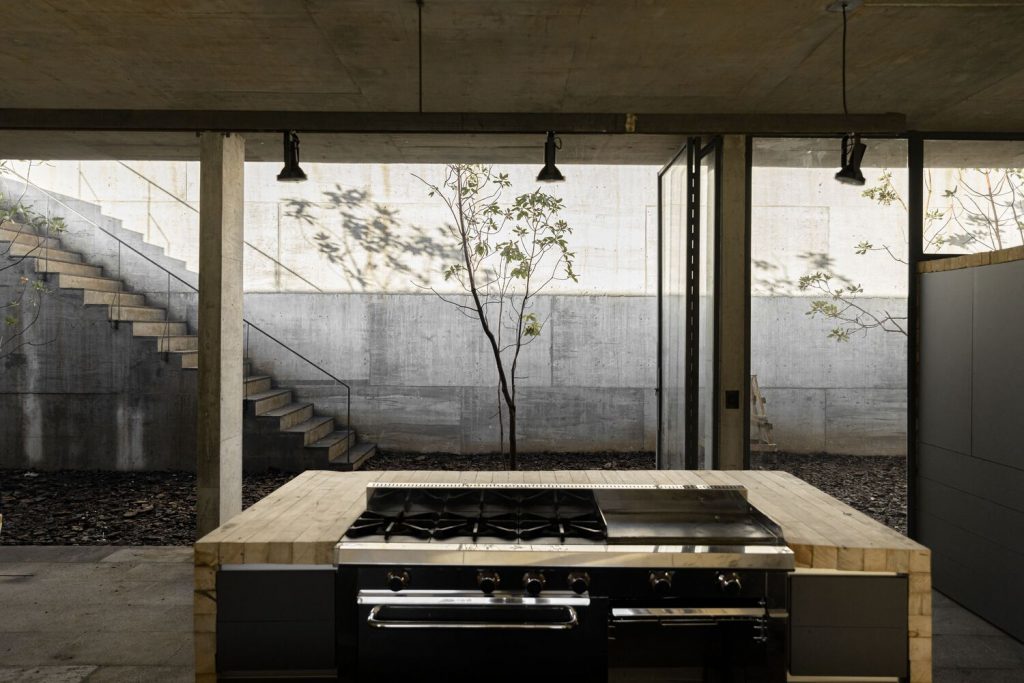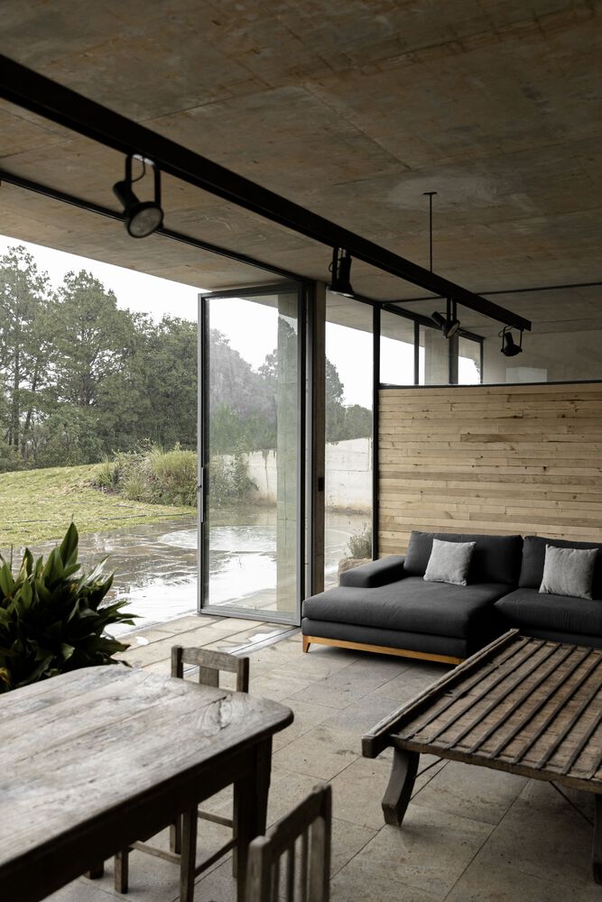 «La idea principal era que el proyecto tuviera vista al bosque, pero el cliente también quería dejar el campo de aguacates intacto», explican, y así llegamos a la decisión de hundir la casa en el terreno. Los aguacates ahora nacen por encima de la estructura oculta, la cual ve hacia las copas de los árboles del bosque. El cliente, practica aladeltismo, un deporte que consiste en realizar vuelos sin motor. Juntos, el par se interesó por lo que llamaron “la quinta fachada” — la vista desde el cielo. La intención de tener un impacto mínimo sobre esa perspectiva se volvió la característica que define al proyecto.