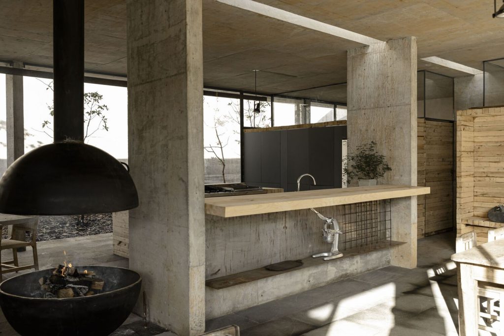 Como la mayoría de los proyectos que desarrolla el estudio de Pardo, la paleta de materiales de Casa Aguacates es sencilla. “Sobre todo porque es una casa de fin de semana, queríamos asegurarnos de que sería de bajo mantenimiento”, dice Pardo. Una estructura de concreto aparente se interrumpe sólo por muros revestidos de Chukum, un material natural de la región de Yucatán, y muros divisorios hechos con madera de pino, la misma que se utilizó para la cimbra durante el proceso constructivo. “De hecho, usamos el resto de la cimbra sobrante para construir una pequeña cabaña de servicio por encima de la casa,” cuenta Pardo, “y también funciona como una especie de mirador, porque tiene vistas panorámicas de todo el terreno.”