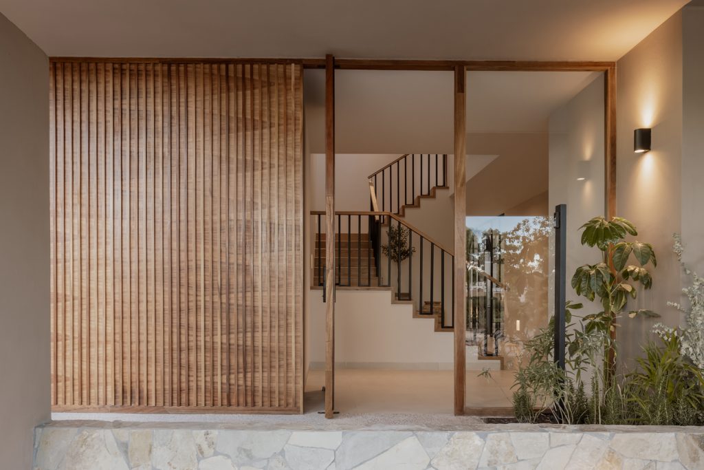 Desde la fachada encontramos colores neutros que destacan los elementos principales como los son la puerta de parota con detalles incrustados que le dan movimiento y un fijo de vidrio que nos dan algo de ligereza y pausa de los materiales sólidos, vigas de acero que encontramos en la techumbre de la cochera y la vegetación que aportan vida desde antes de entrar al conjunto.