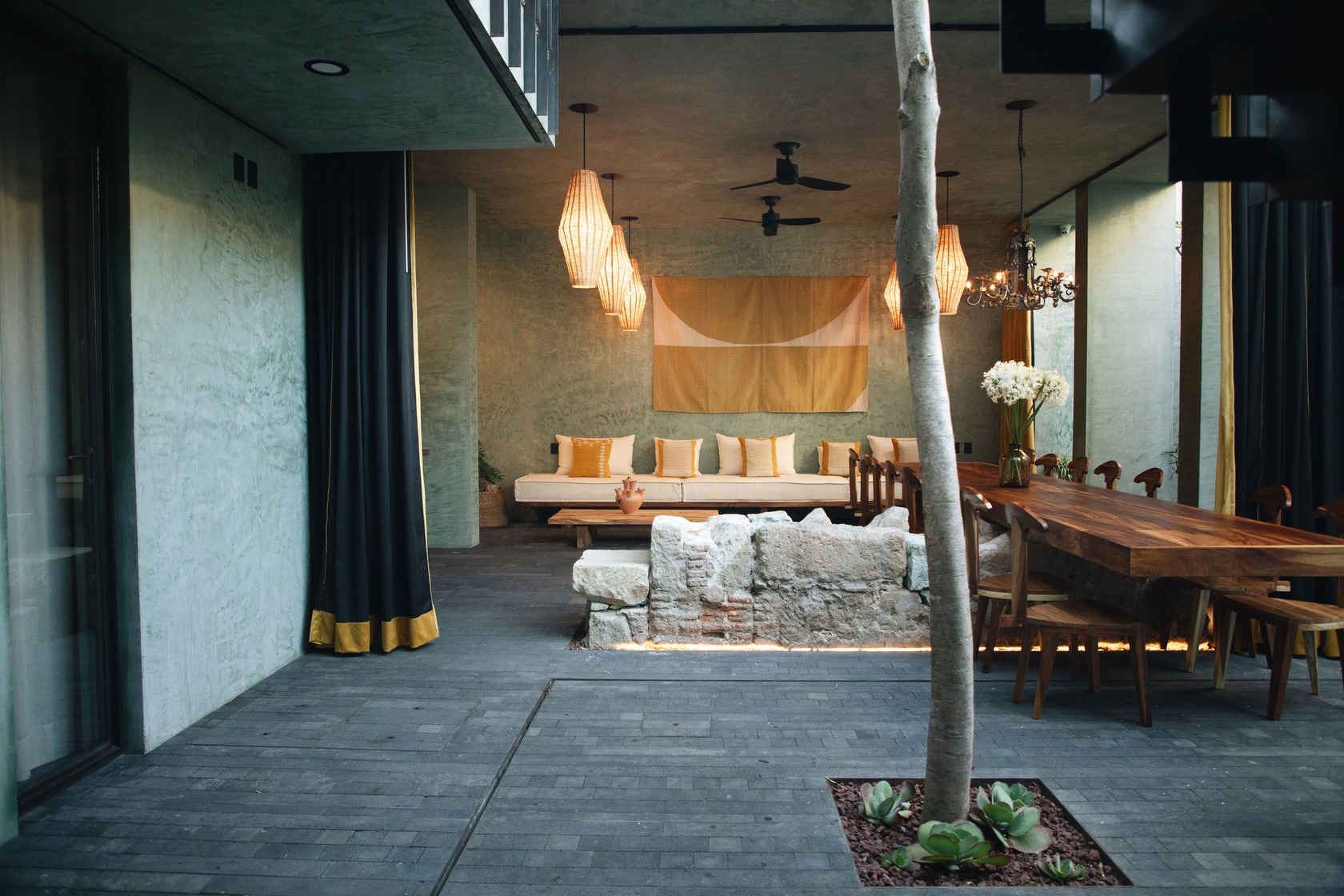 El proyecto integró criterios bioclimáticos que promueven el confort pasivo: ventilación cruzada mediante vanos históricos y una nueva arcada, muros pintados con tierras y cal, y carpinterías hechas con madera reciclada tratada con aceites naturales. Estas decisiones reducen el impacto ambiental y mantienen condiciones térmicas agradables en los más de 2,500 m² del recinto.