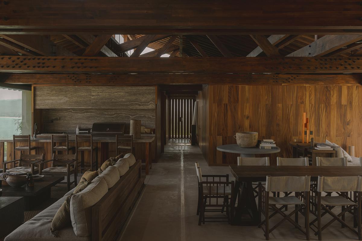 La estructura combina una armadura de madera Parota, columnas y pisos de concreto ocre que evocan la tierra, así como piedra y tejas de barro. El uso de estos materiales, cuidadosamente seleccionados, enaltece la simplicidad formal, permitiendo que el diseño hable a través de sus texturas, temperaturas y tonalidades.