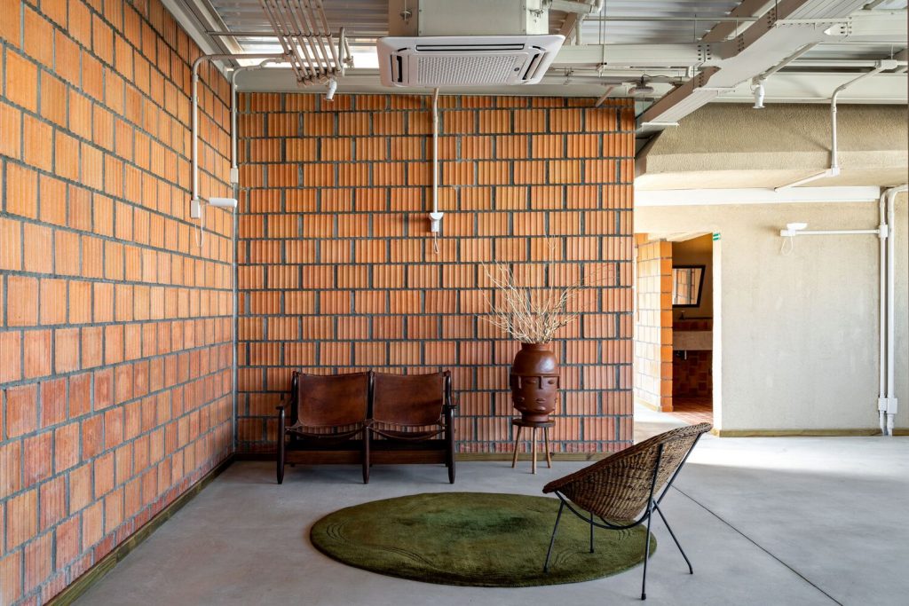 El objetivo era utilizar, en los nuevos muros, un tipo de ladrillo diferente a los bloques convencionales, con nervaduras más grandes, como se seleccionó en la investigación de referencia del proyecto. Una vez identificado un producto afín en el mercado de la construcción, se trabajó con el fabricante para aumentar la capacidad de carga del bloque y permitir su uso expuesto, sin revestimientos. Mismos que guardan también una relación con la tierra. En las fachadas se aplicó una capa exterior de tierra apisonada, con frisos horizontales y tonos y textura similares a los de los bloques de ladrillo. Como complemento, las paredes interiores preexistentes se recubrieron con pintura de componentes naturales y color tierra.