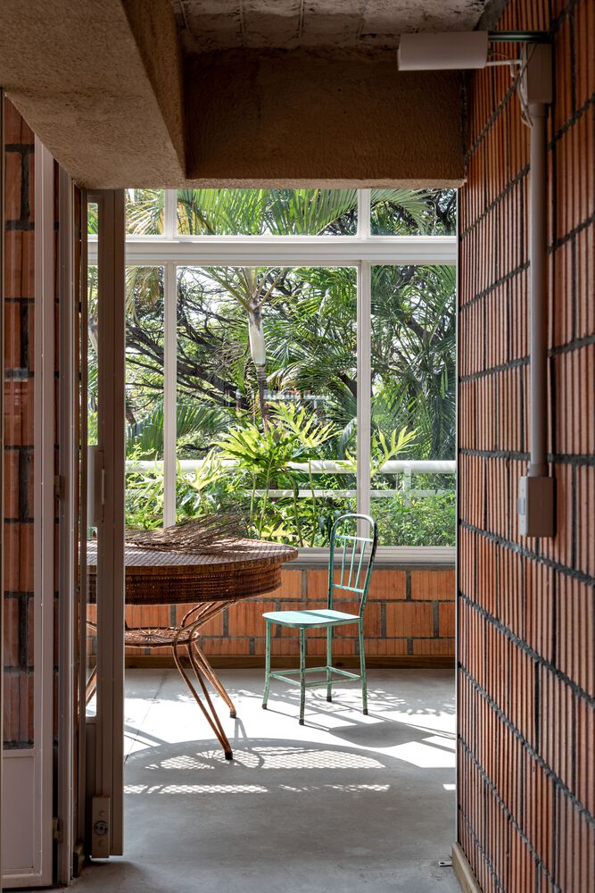 Casa Mãe Terra cuenta con gran iluminación natural en los interiores, lo que ha sido posible tanto por el rediseño de las ventanas como por la distribución de la luz a través de los vacíos de la nueva escalera metálica (suelo de chapa perforada y pasamanos de barras), insertada en la parte trasera del edificio. La planta superior, concebida para albergar diferentes zonas de reunión -algunas compartimentadas, otras de espacio abierto- y áreas para eventos, también está rodeada de fachadas de cristal que, replegadas en planta, están flanqueadas por jardineras con un denso paisaje.