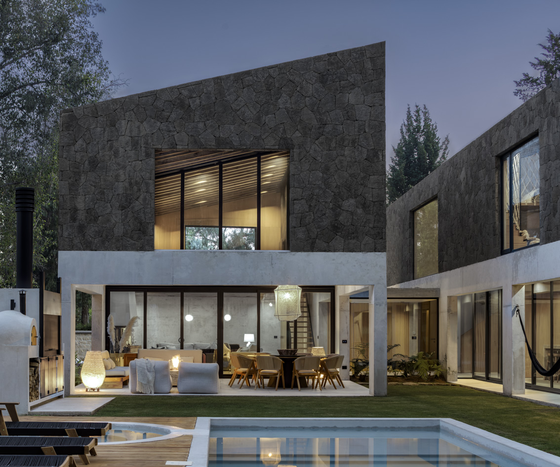 Casa NOAH apuesta por una estrategia tectónica que subvierte expectativas: el basamento de concreto aparente actúa como zócalo liso y ligero, mientras que la parte superior se reviste de piedra volcánica, otorgando peso visual y textura al conjunto. Al interior, esta lógica se invierte una vez más: la piedra se transforma en cálidos paneles de madera, generando atmósferas íntimas y acogedoras.