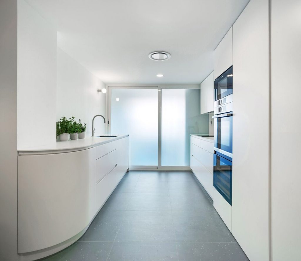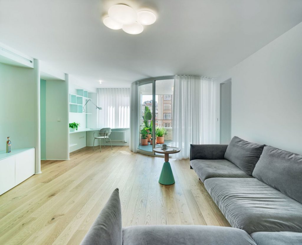 Es por ello que anulando la entrada “noble” se aprovechó la de servicio para acceder por la mitad de la casa y acortar recorridos. Como una suerte de espiral (o caracol), la casa se organiza en torno a un centro curvo que te desliza hasta las habitaciones. Este recorrido se realiza por un espacio comprimido en tono verde aguamarina que provoca un efecto expansor cuando “sales” a las habitaciones anexas. Imagina que vas buceando por una sima (el paso) y sacas la cabeza en un espacio abierto (las habitaciones), esa es la sensación. Pero no por ello queremos que vayas rápido, el camino también se disfruta.