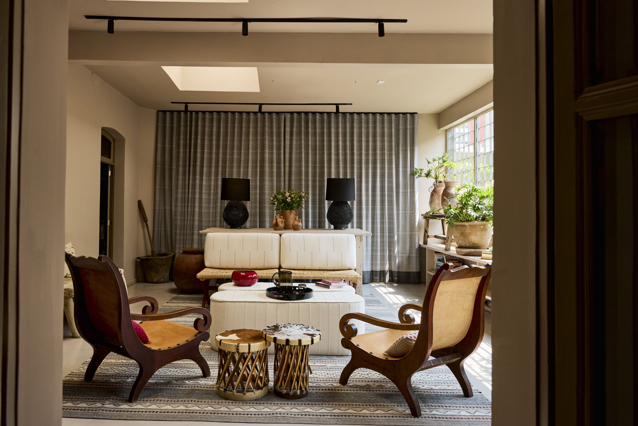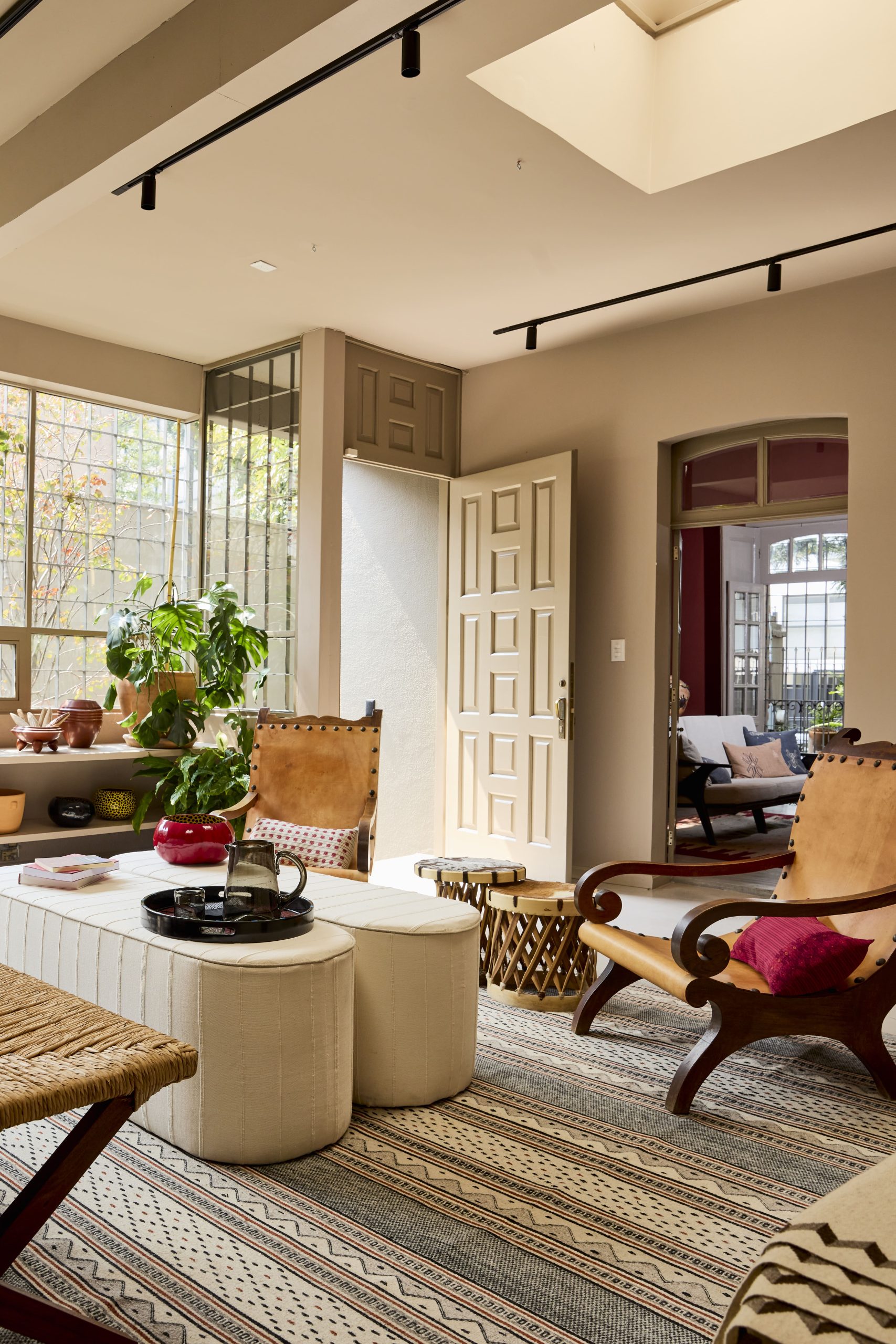 Los interiores de Casa Onora reflejan una atención minuciosa al detalle. El equipo de MYT+GLVDK retomó elementos tradicionales del Bajío, como la carpintería en maderas nobles, reinterpretándolos en clave contemporánea. Los pisos de microcemento aportan continuidad visual y una base neutra que realza la riqueza de las piezas exhibidas.