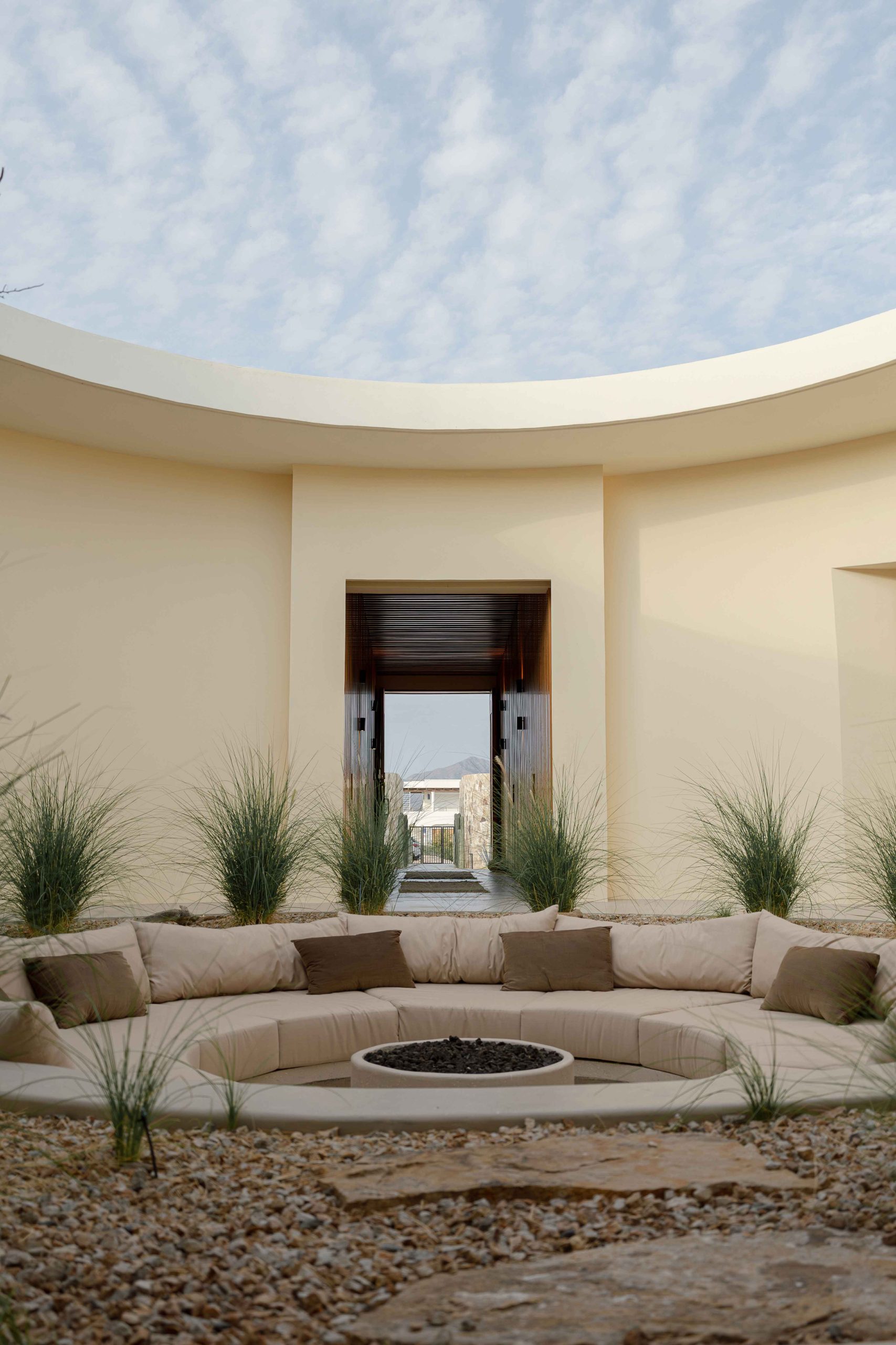 Patio central de Casa Suna, donde arquitectura y paisaje invitan a reunirse bajo las estrellas en un ambiente íntimo y silencioso.