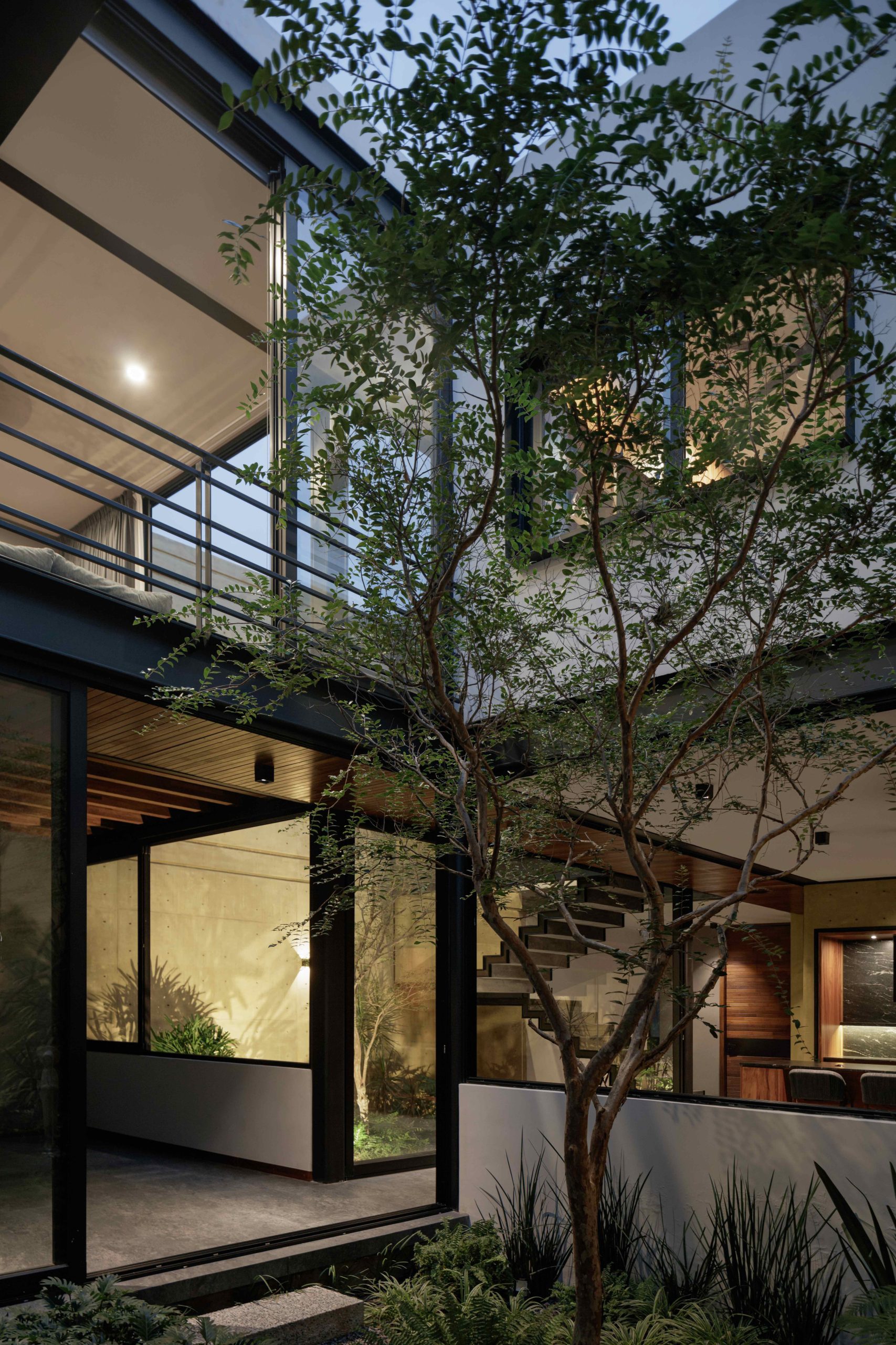El diseño de patios en Casa Zibu permite mantener ventilación e iluminación controlada, generando una atmósfera de tranquilidad incluso por la noche.