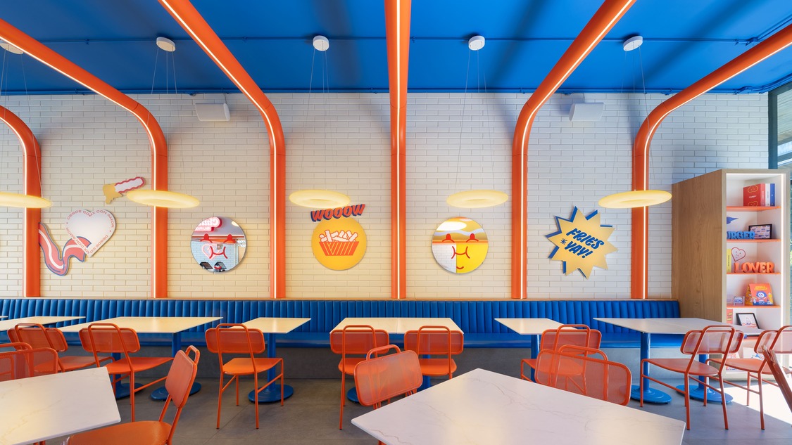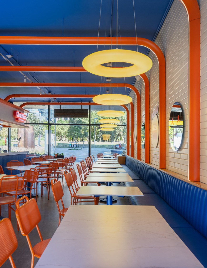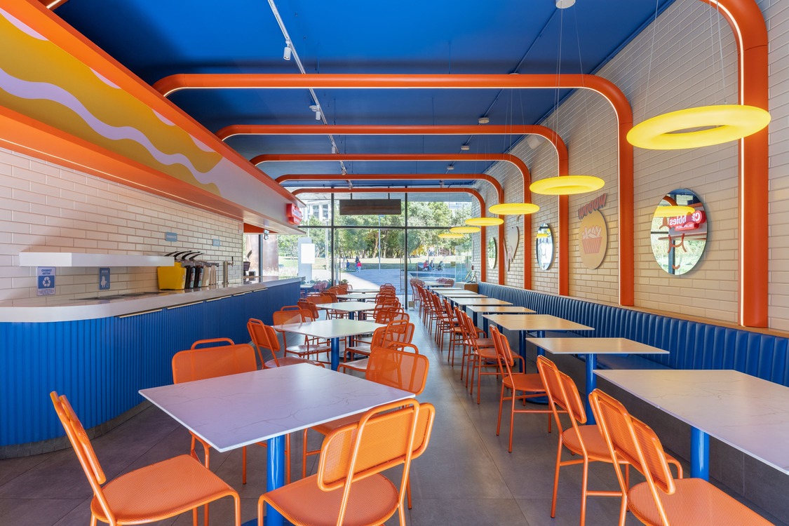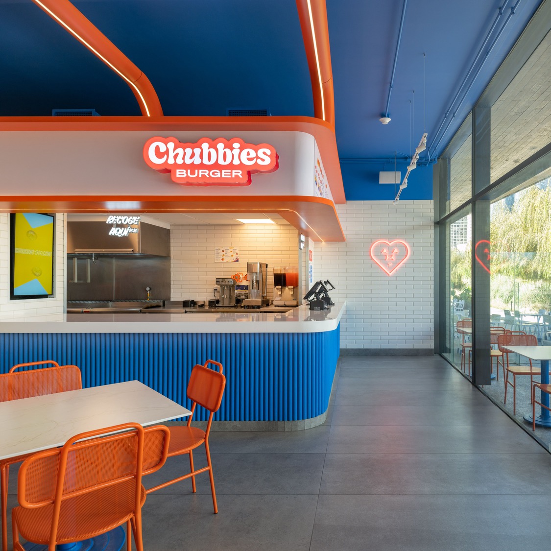 En Chubbies, cada color tiene un propósito. Los tonos naranja y azul, protagonistas en el diseño, generan un equilibrio visual entre energía y calma, mientras que los acentos amarillos en la señalética aportan contraste y claridad. Esta paleta cromática no solo guía a los comensales, sino que refuerza la identidad vibrante de la marca.