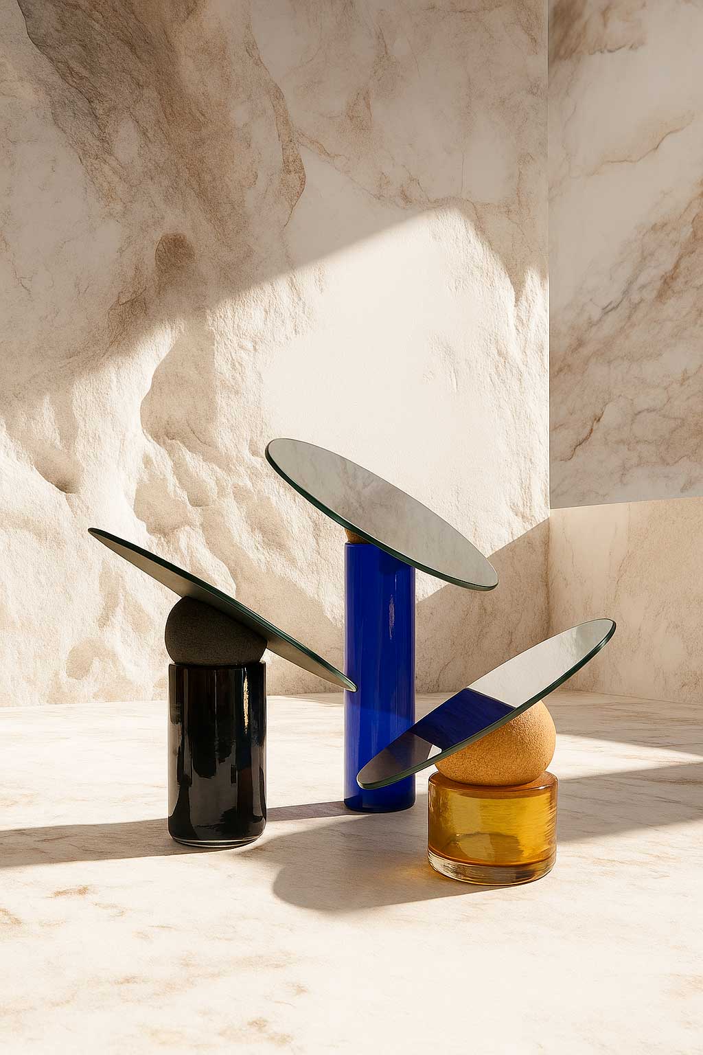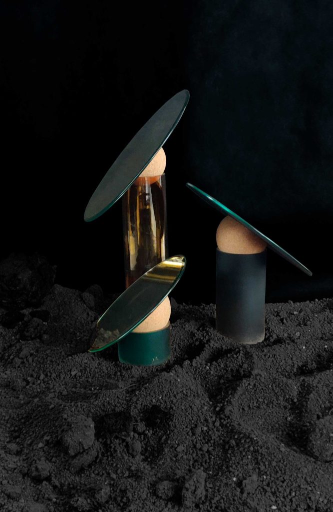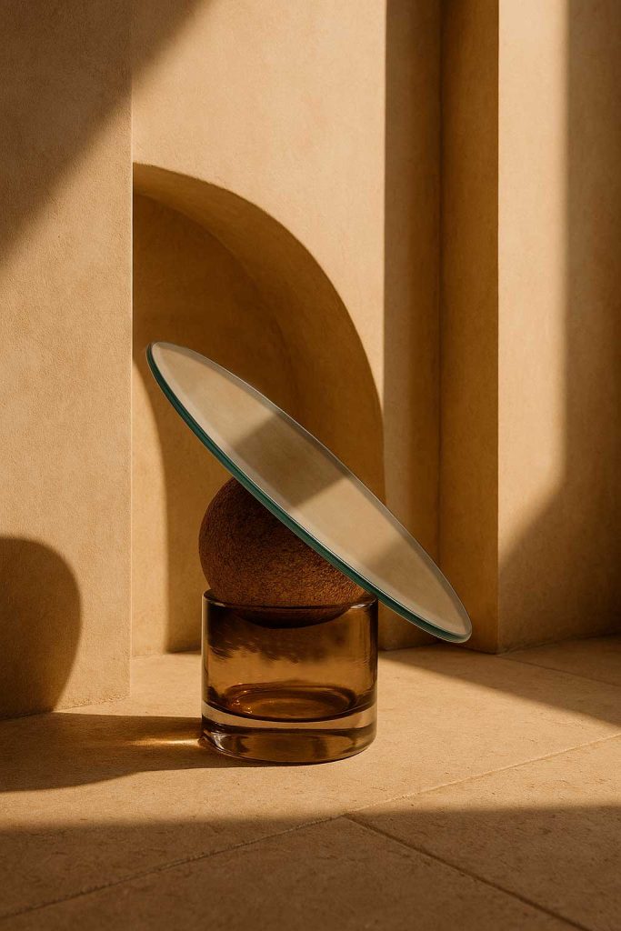 La colección Astra se compone de espejos decorativos y escultóricos que combinan un socle de vidrio soplado artesanalmente, una esfera de corcho y un espejo redondo biselado. Inclinables según el uso, estas piezas permiten integrar pequeños objetos en su base, desdibujando los límites entre objeto funcional y pieza escultórica. El vidrio, el corcho y el espejo dialogan desde su origen europeo, reforzando la coherencia material del conjunto.