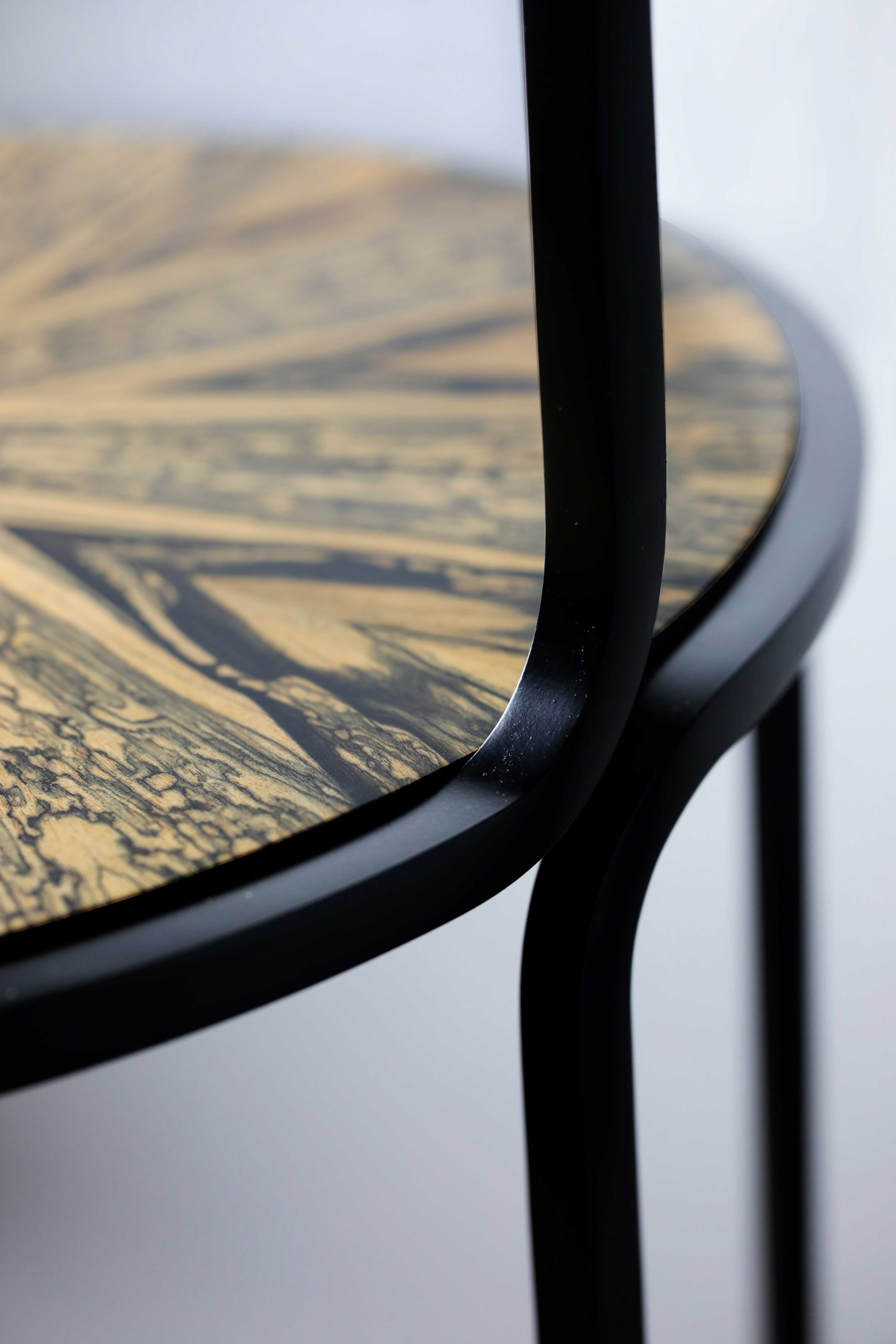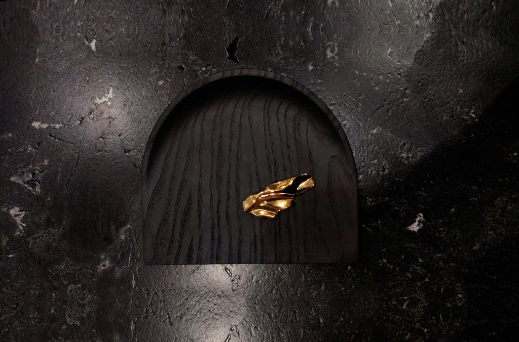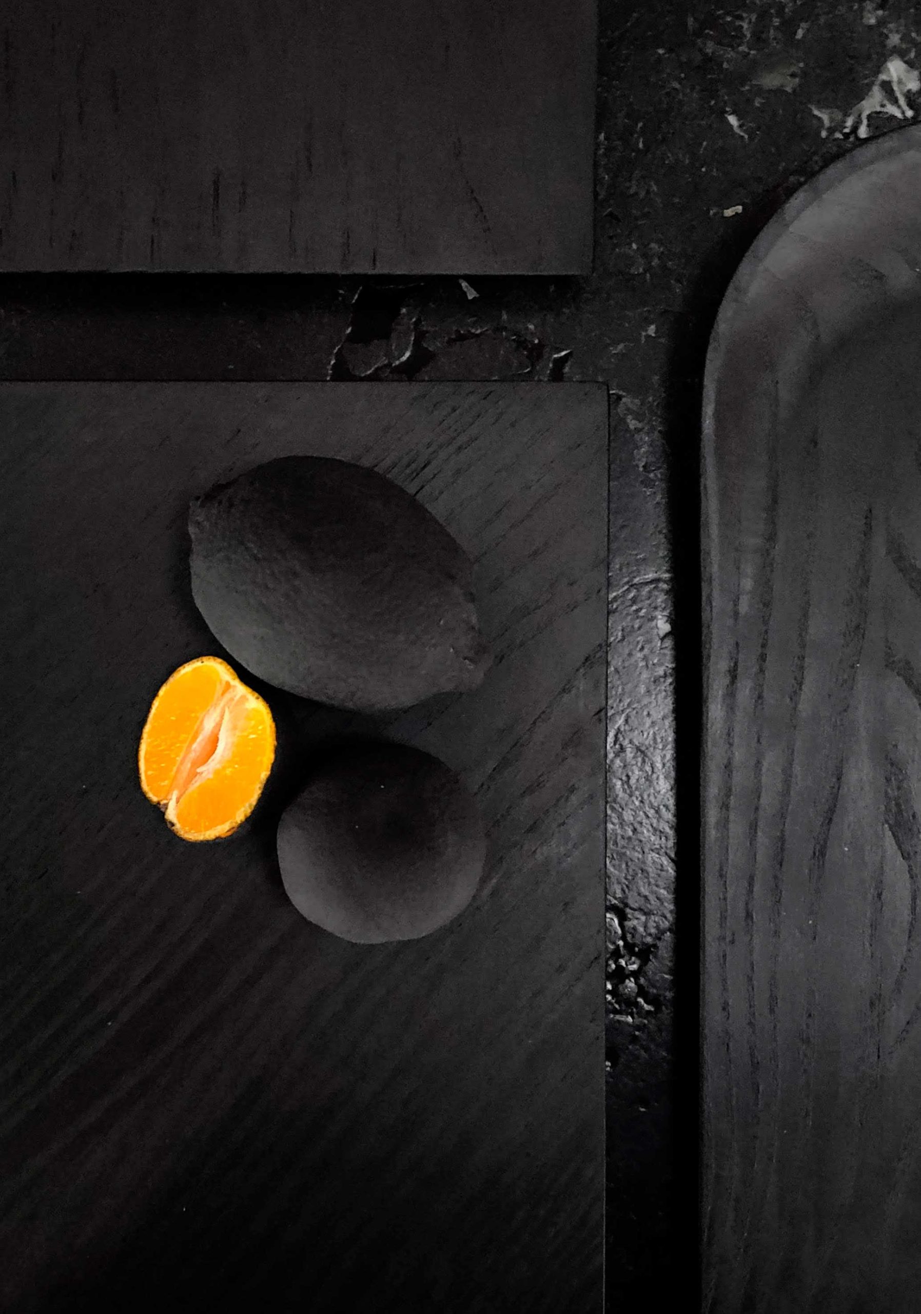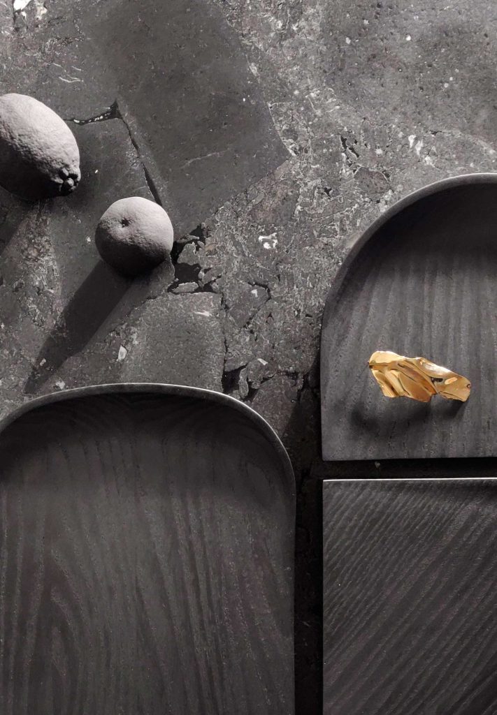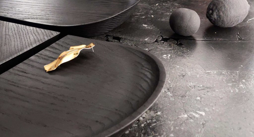 La colección Creux se compone de bandejas de madera de fresno teñido en negro, donde curvas, círculos y elipses conviven con líneas más tensas y definidas. Esta combinación genera una geometría equilibrada que realza las vetas naturales del material. La elección de tintes sin VOC refuerza el compromiso de la diseñadora con procesos responsables y duraderos.