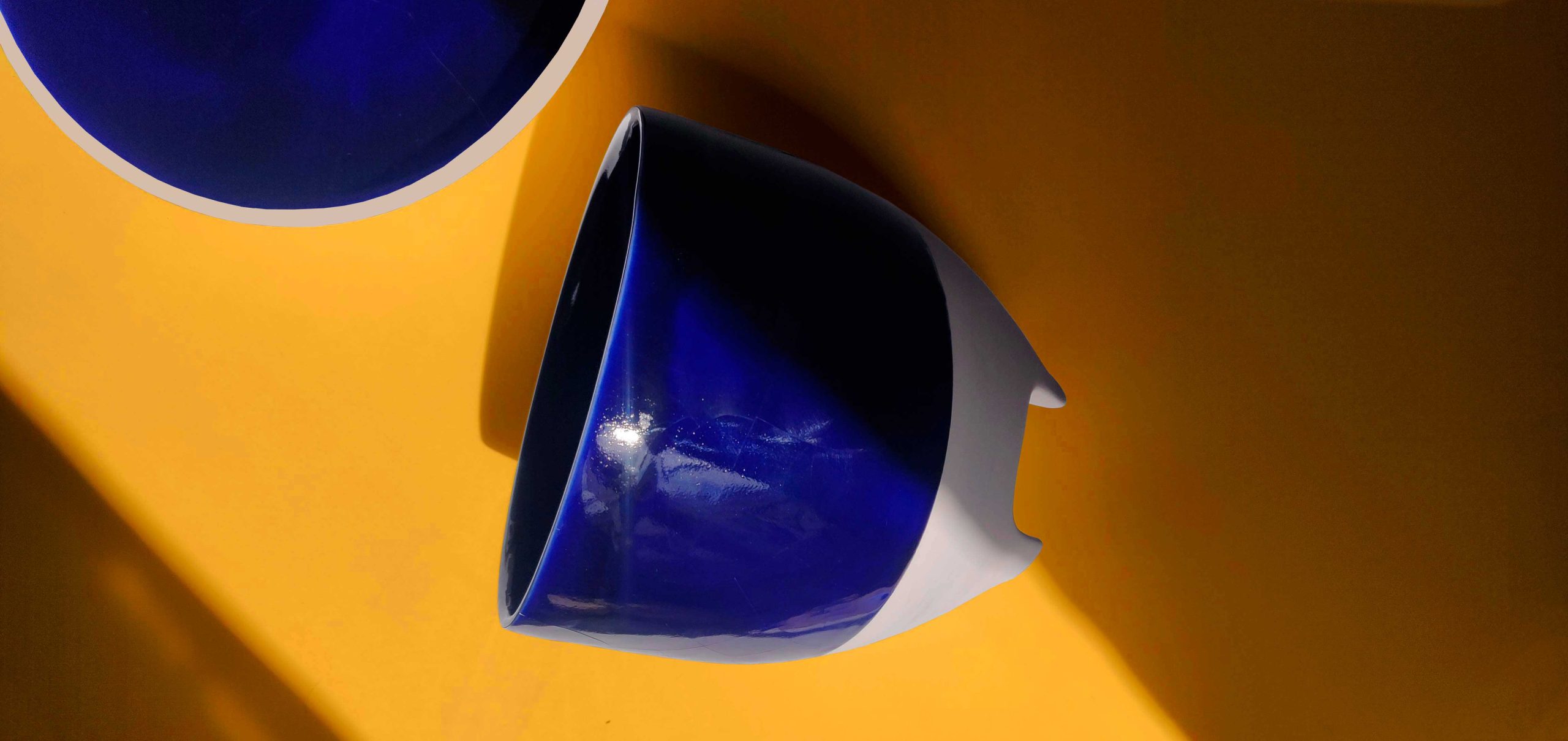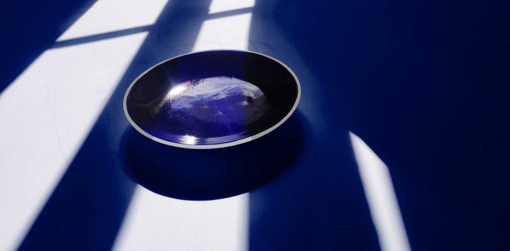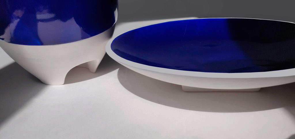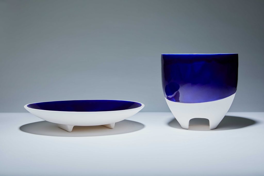 Inspirada en el espíritu minimalista de las sandalias japonesas del mismo nombre, la colección Geta explora la simplicidad como lenguaje. Compuesta por piezas de porcelana parcialmente esmaltadas en azul cobalto, Geta se sostiene sobre dos delicados apoyos que enfatizan la pureza de la forma. La serie revela un equilibrio preciso entre funcionalidad cotidiana y una presencia visual contenida pero contundente.