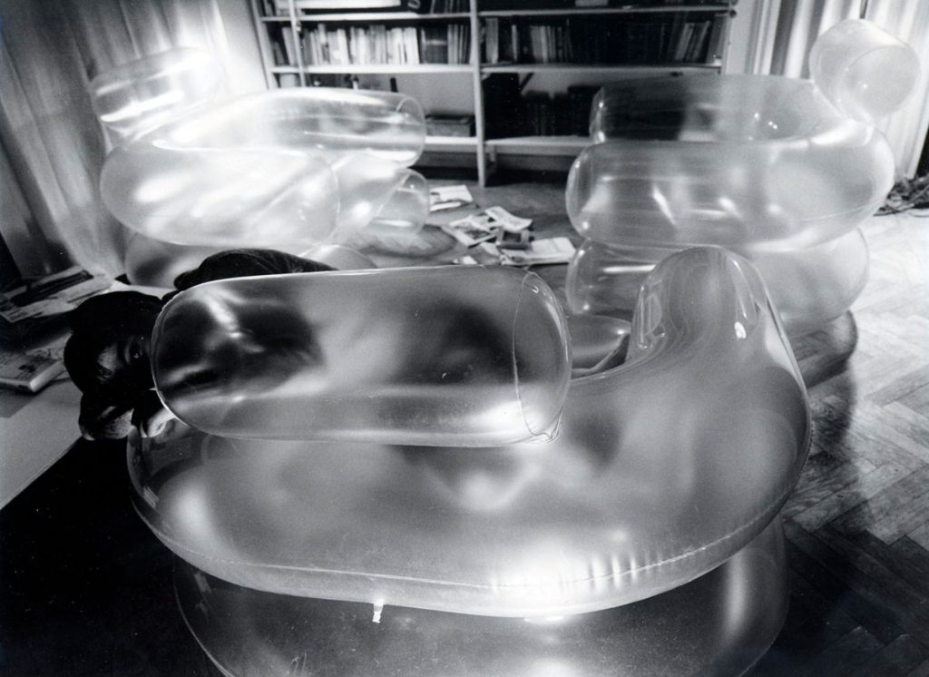 De Pas, D'Urbino, Lomazzi, poltrona gonfiabile "Blow" in PVC trasparente, Zanotta. 1967. (immagine tratta dal catalogo della mostra)