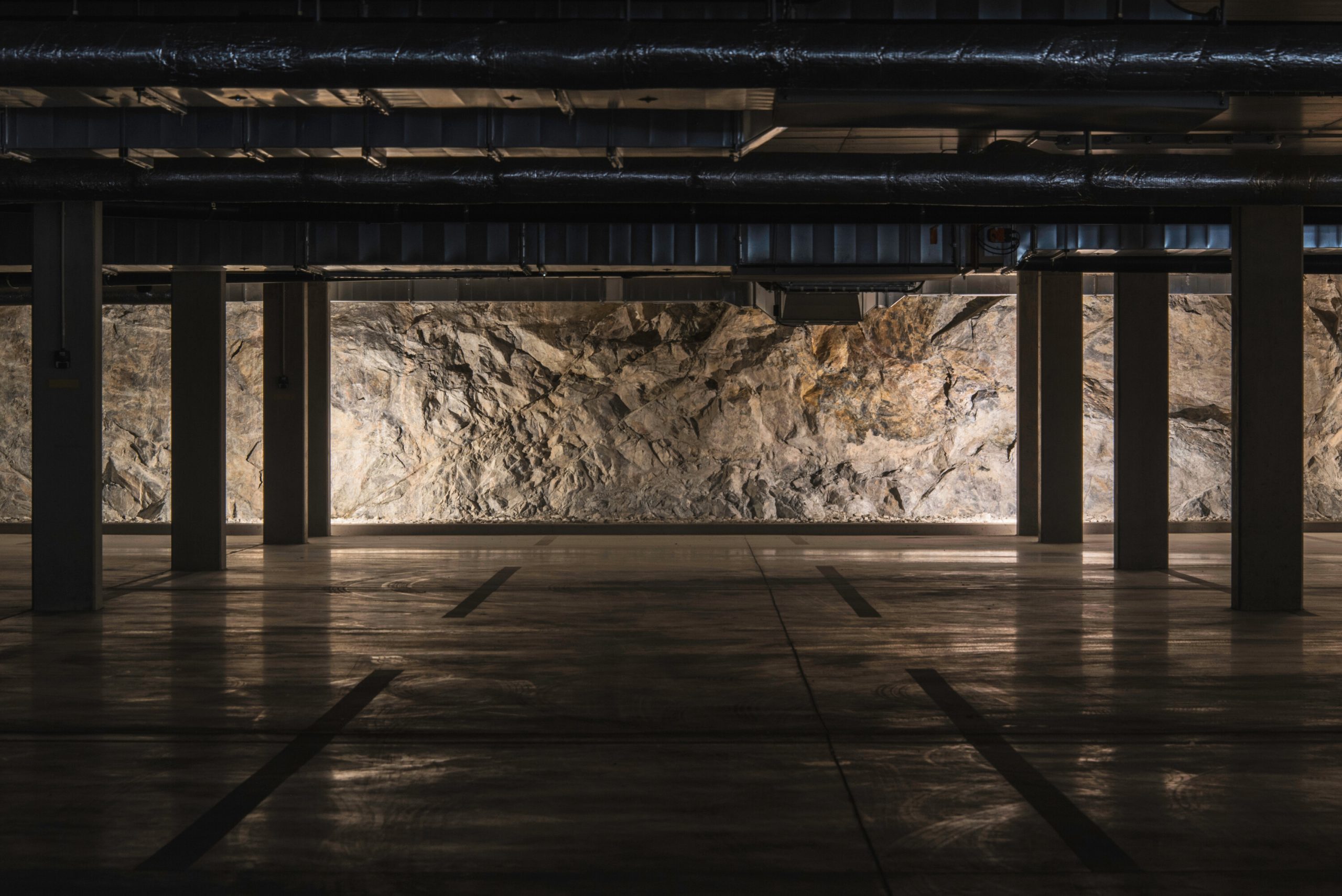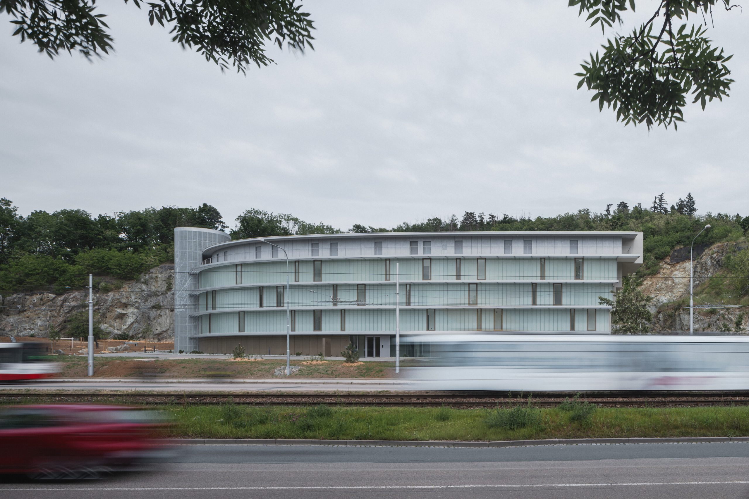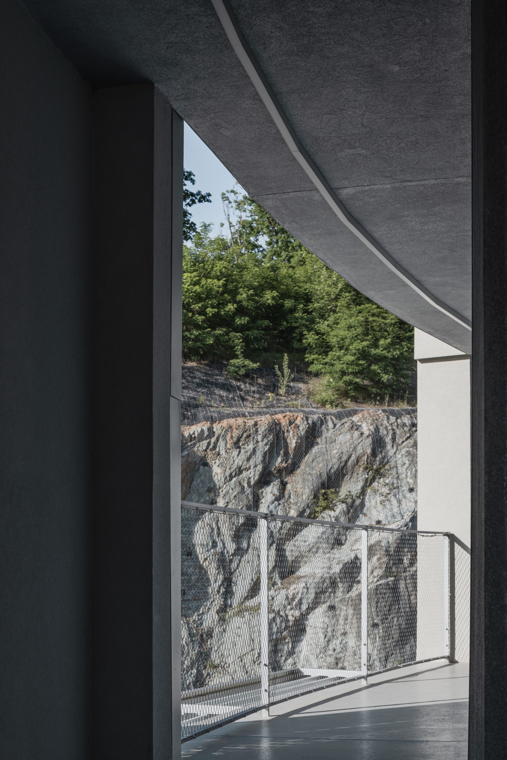 El diseño del edificio responde directamente a la compleja morfología del terreno. La fachada principal actúa como barrera acústica hacia la calle, mientras que el patio interior se integra de manera orgánica con las antiguas paredes de roca de la cantera, caracterizadas por pendientes abruptas y terrazas naturales.