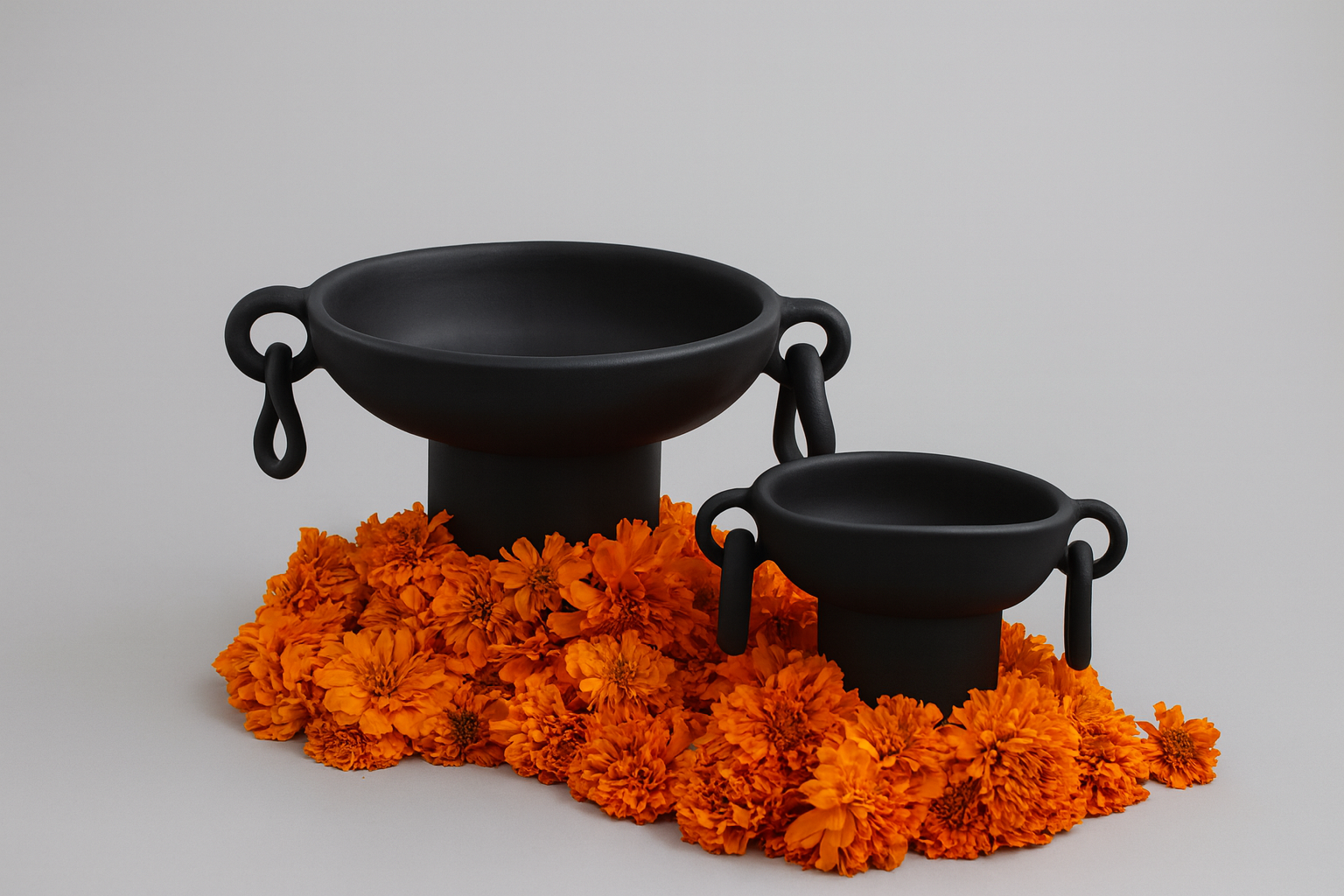 El altar combina tres lenguajes que conviven con naturalidad: el arte, representado por la obra pictórica de Velarde; el diseño, materializado en las piezas de resina negra de Barón & Vicario; y la tradición mexicana, expresada en la flor de cempasúchil. Su fuerza radica en la pureza de los elementos y en la repetición de un gesto visual contundente, donde el negro profundo contrasta con el naranja vibrante y los tonos ácidos de la pintura, creando una atmósfera de quietud y energía a la vez.
