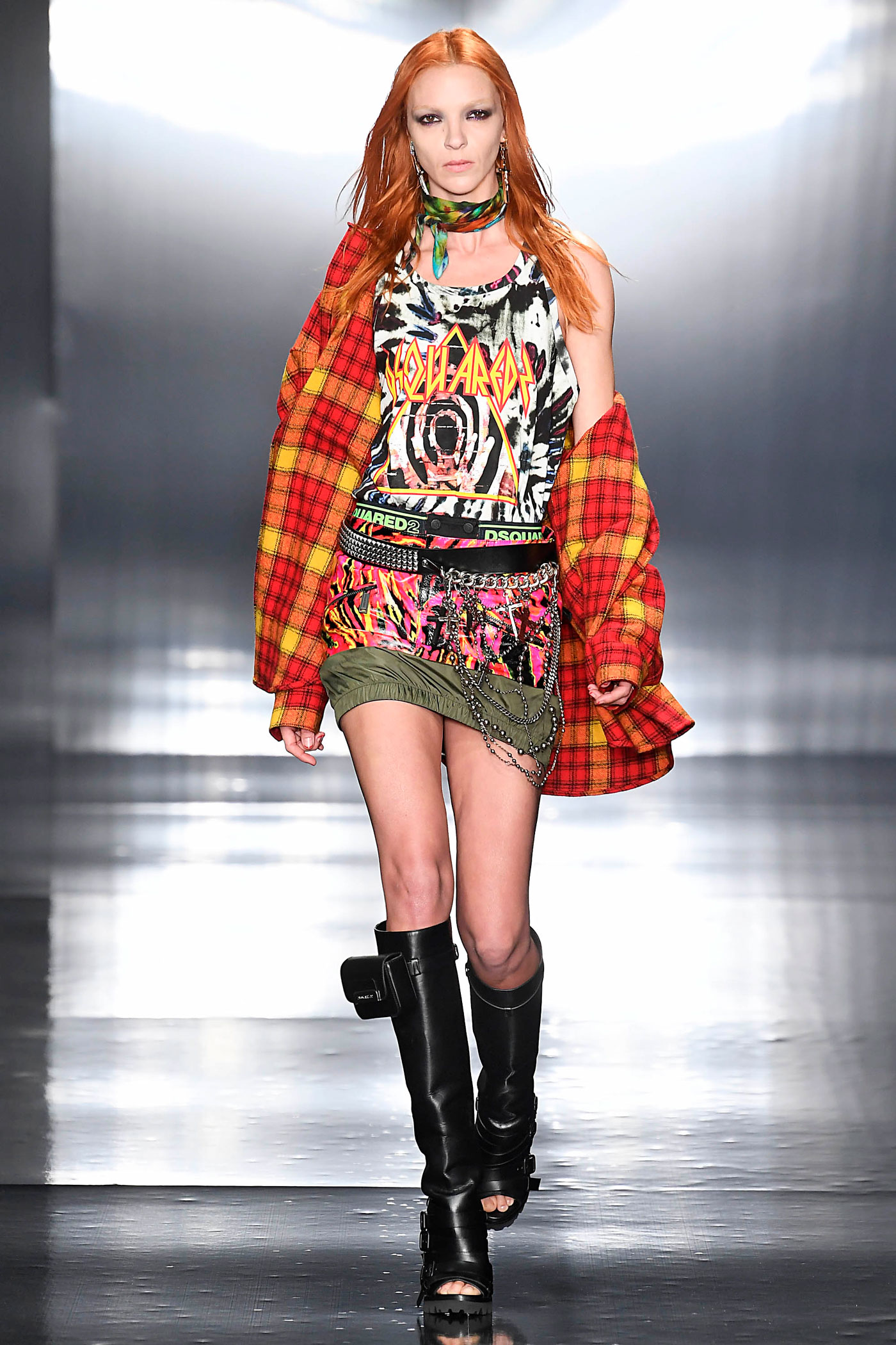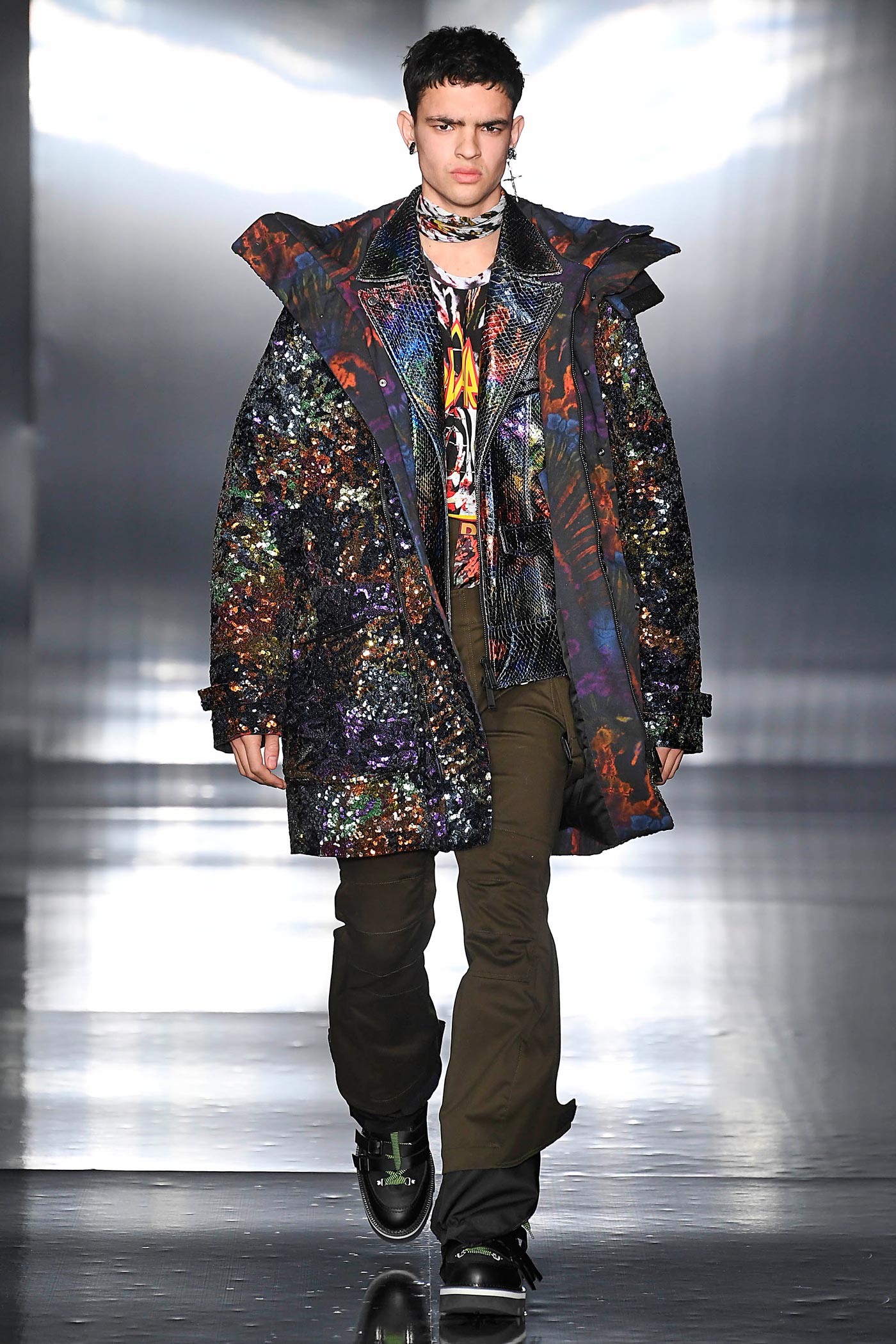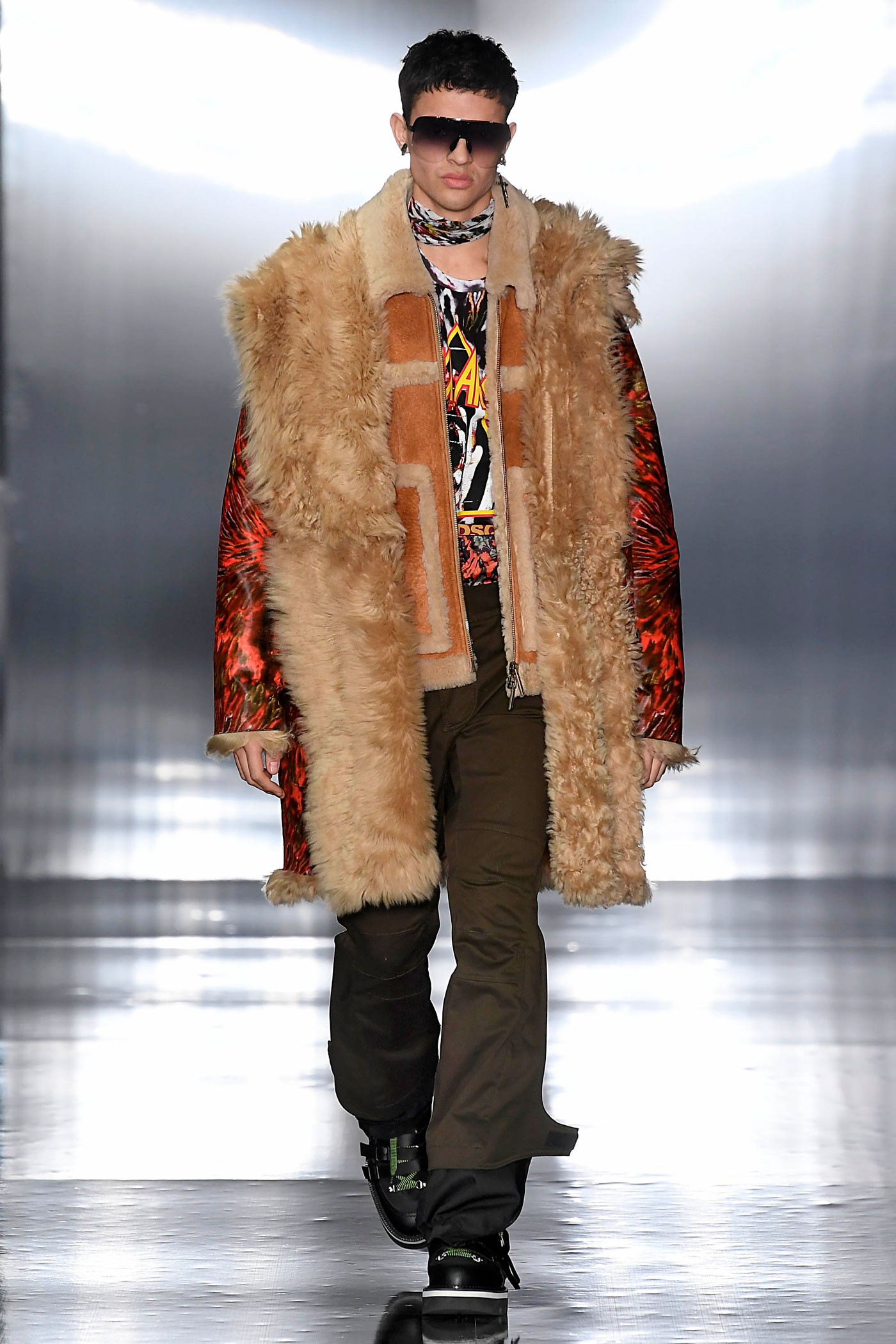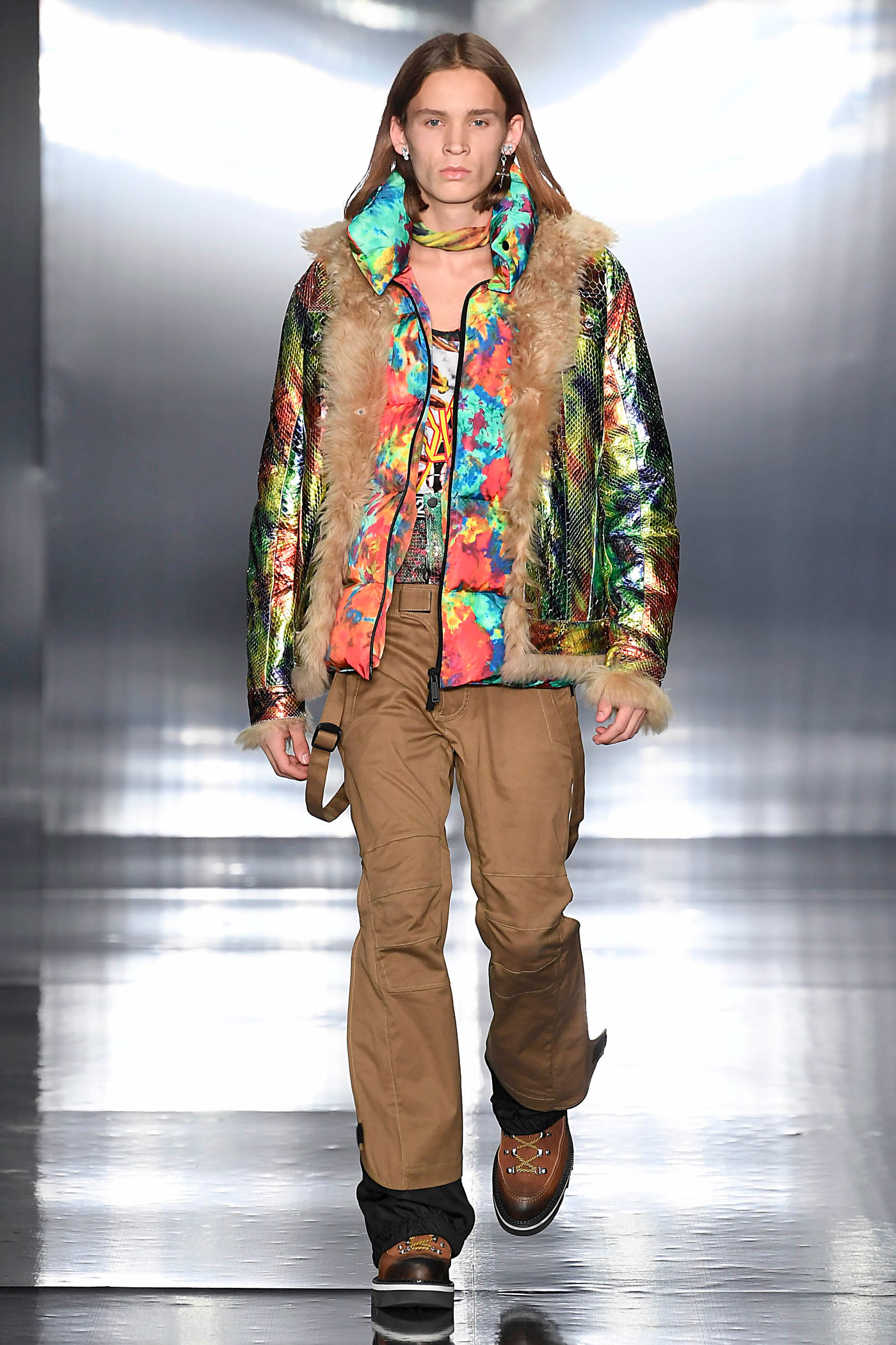 Los pantalones y las chaquetas a juego se elaboran con patrones mixtos de tintes en diversos tejidos, diseños y colores: anoraks holográficos, charol, metálicos y lentejuelas bordadas. El ambiente de rock retro domina las parkas de gran tamaño, forradas de peluche. Las camisetas de tirantes largos hechas de franela a cuadros, están forradas de vellón con una silueta masculina sobredimensionada que también se superpone a los mini vestidos para mujer.