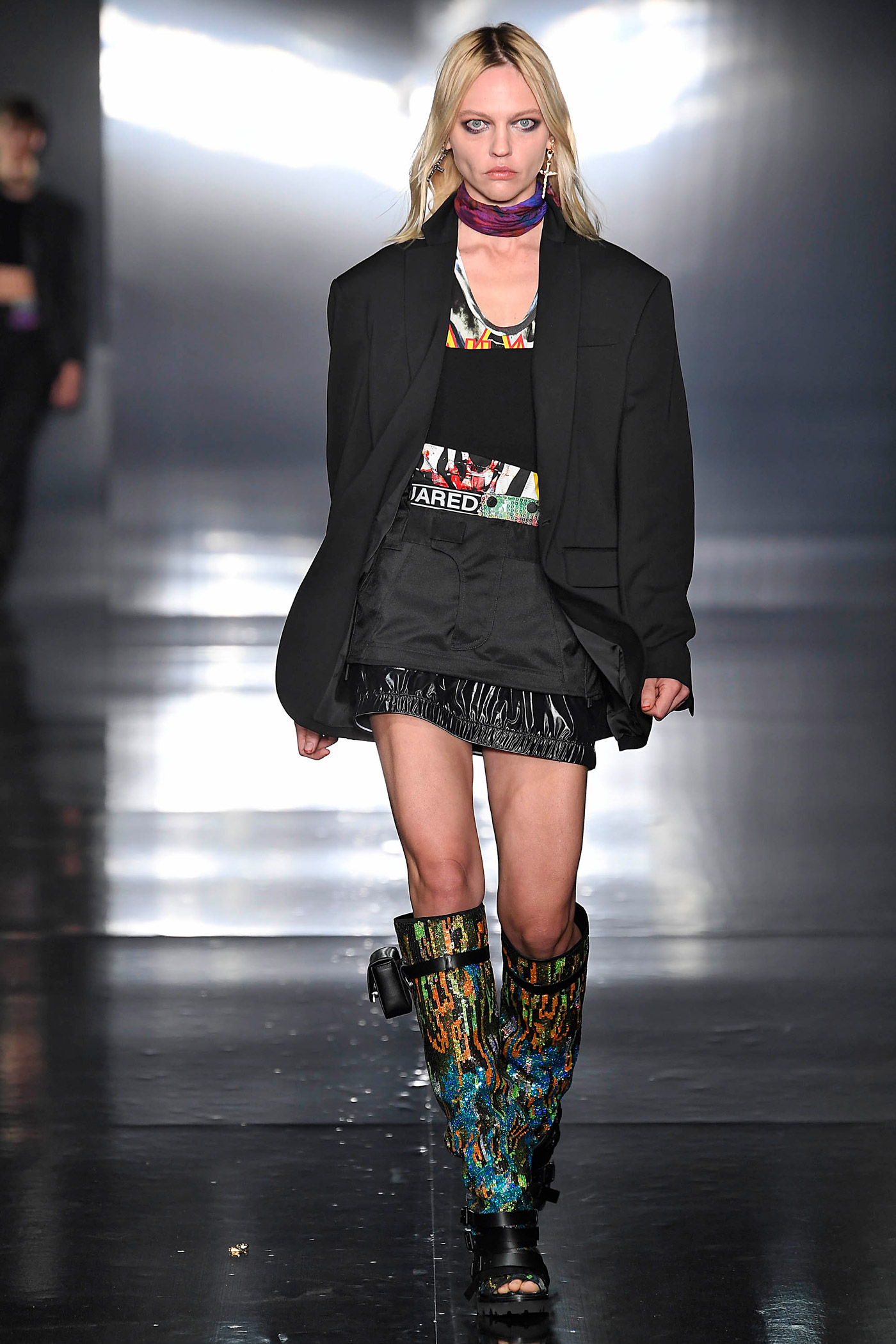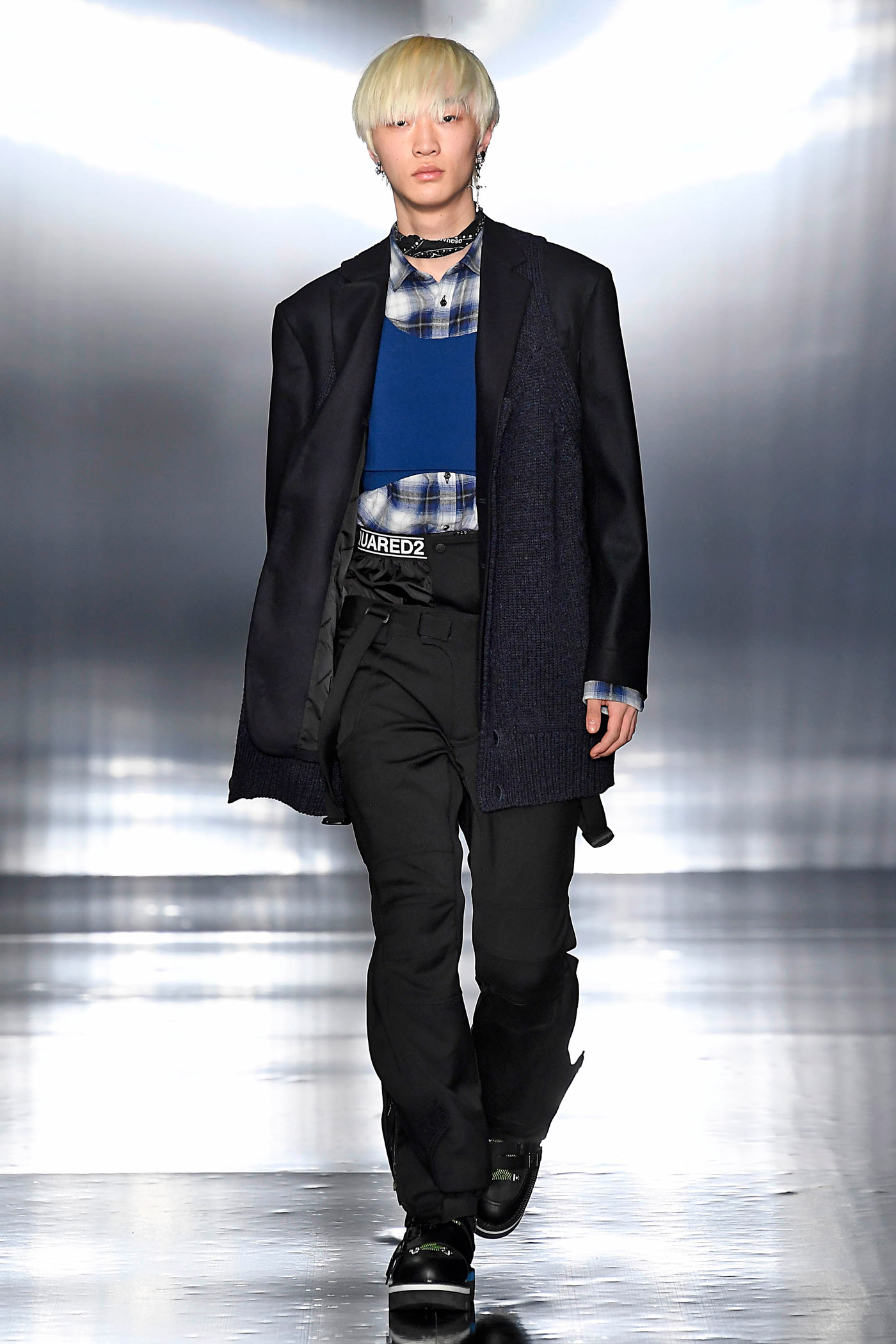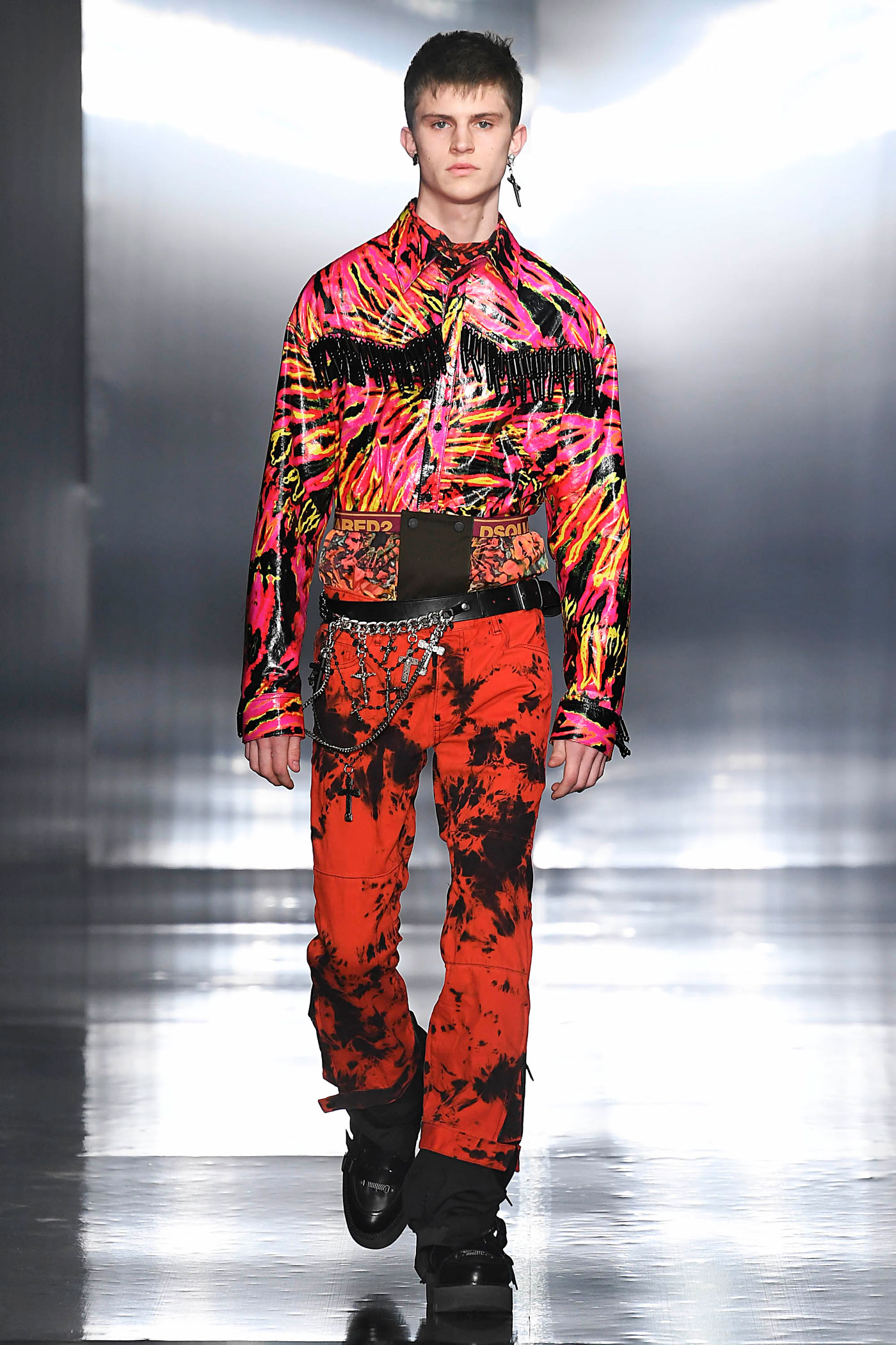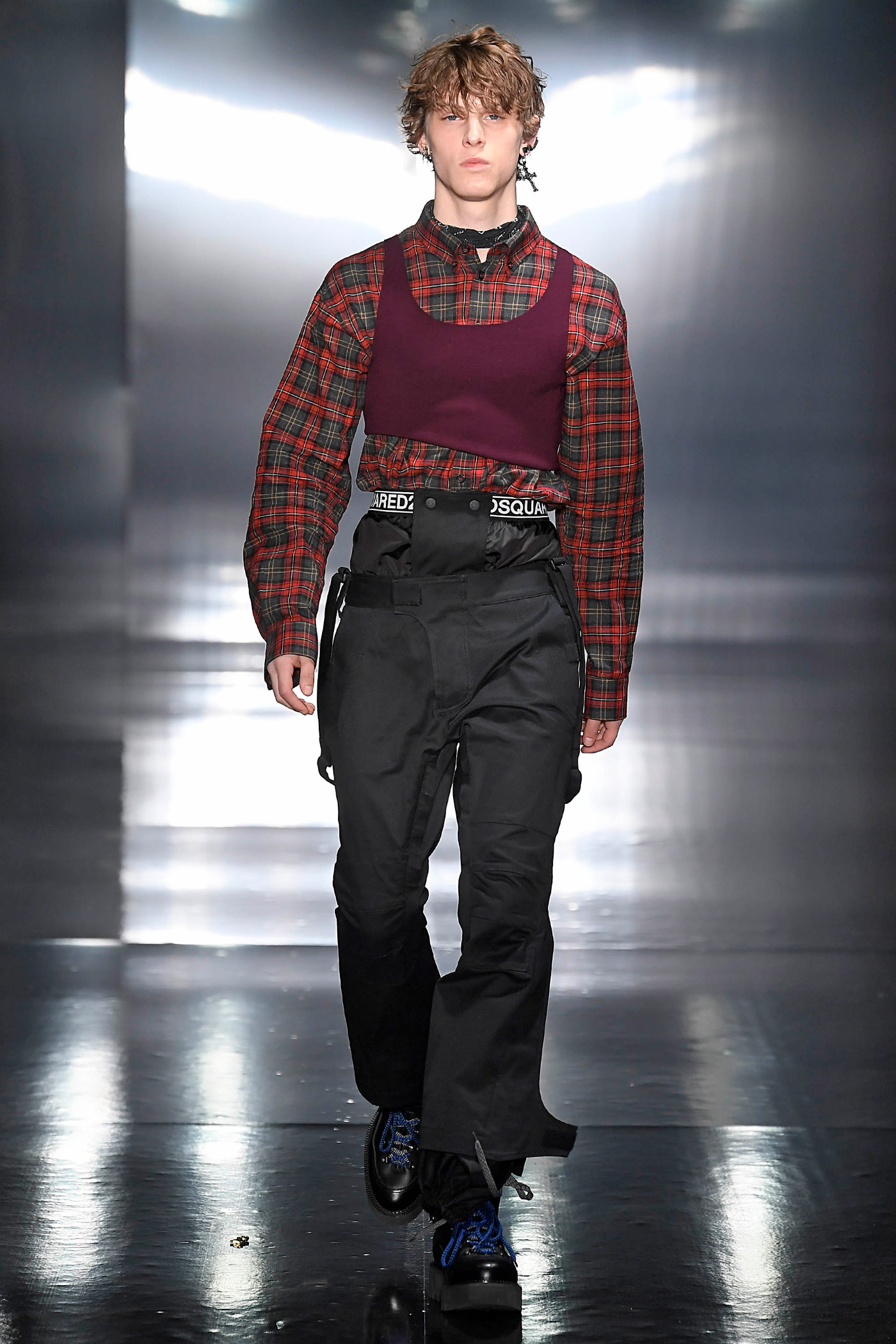 Los pantalones y las chaquetas a juego se elaboran con patrones mixtos de tintes en diversos tejidos, diseños y colores: anoraks holográficos, charol, metálicos y lentejuelas bordadas. El ambiente de rock retro domina las parkas de gran tamaño, forradas de peluche. Las camisetas de tirantes largos hechas de franela a cuadros, están forradas de vellón con una silueta masculina sobredimensionada que también se superpone a los mini vestidos para mujer.
