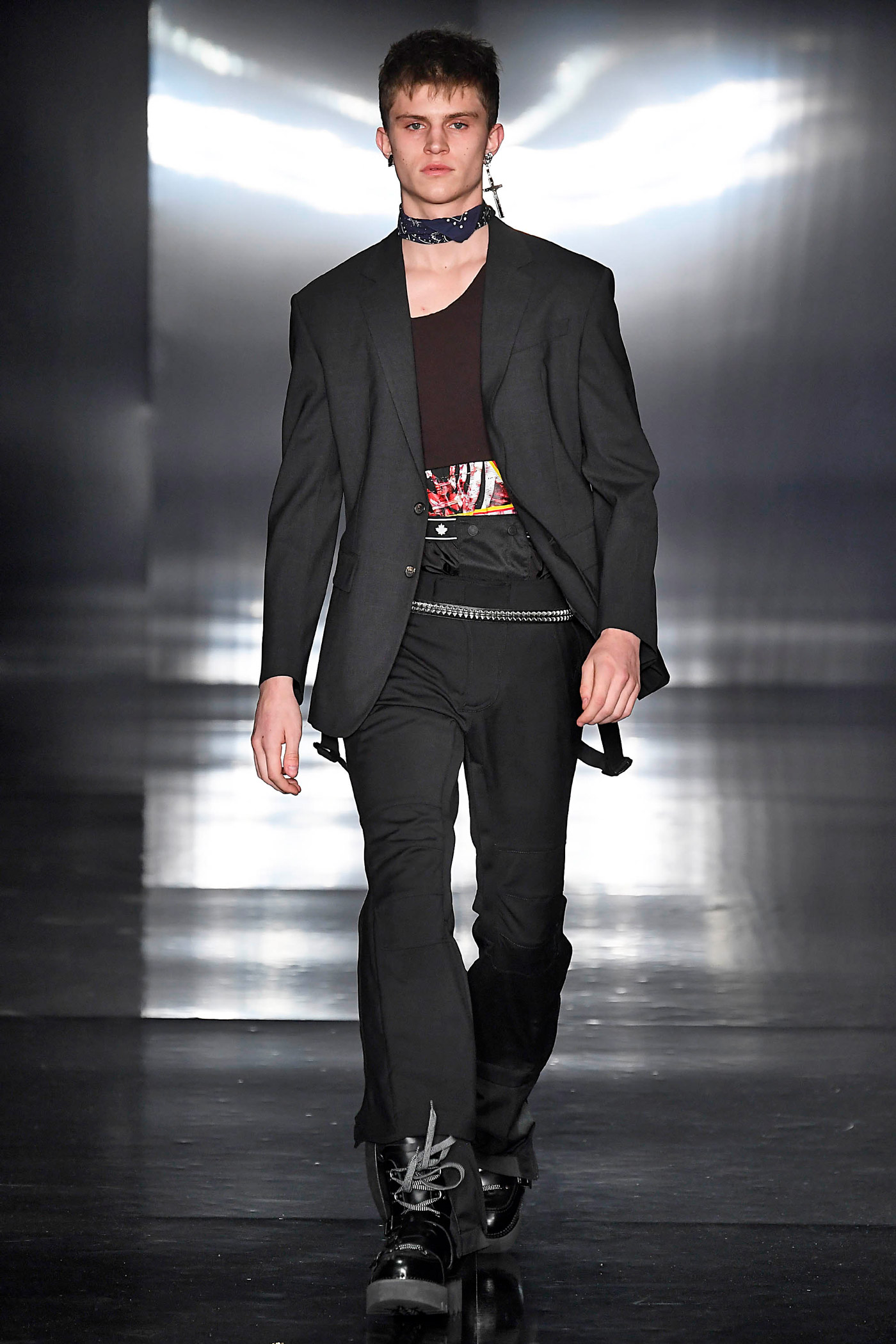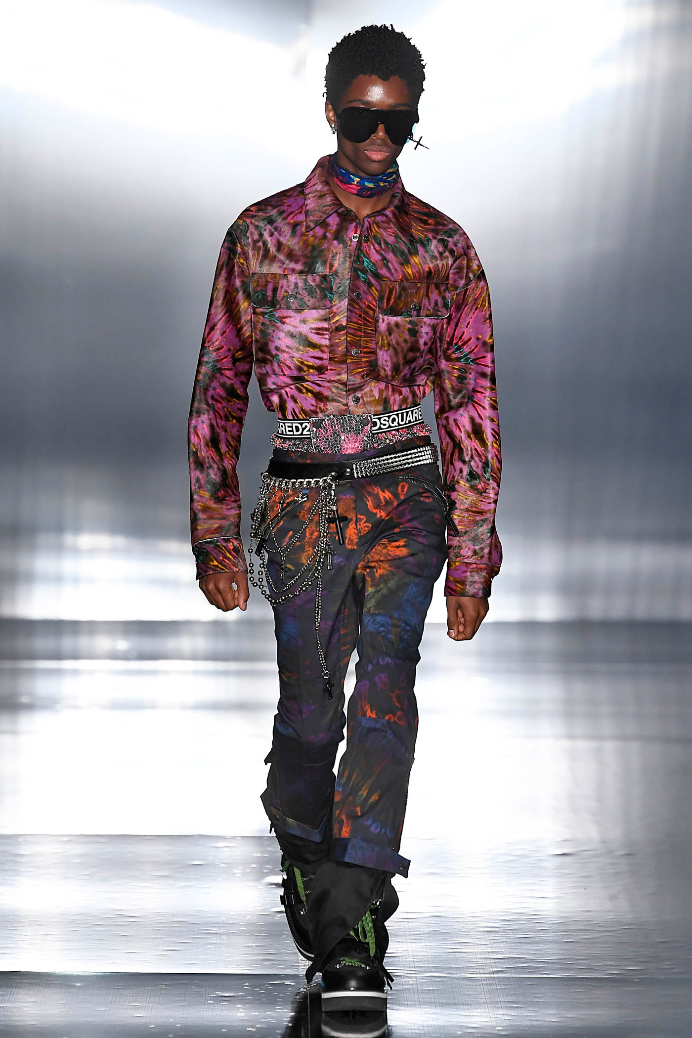 Los looks de pasarela están diseñados para expediciones aventureras, es el caso de la colección Otoño/Invierno 2019 de Dsquared2. Una exploración oscura e invernal sobre tonos y patrones psicodélicos contrasta con la nieve blanca y austera de los casquetes montañosos. Un pantalón de esquí da forma a una silueta rockera.