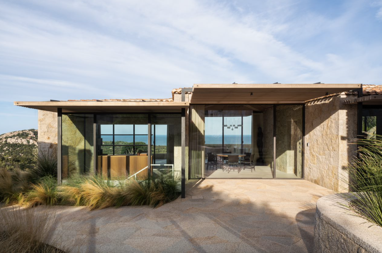 Sobre una parcela inclinada, esta villa se extiende con su programa arquitectónico basado en la experiencia de sus diseñadores al conocer el lugar. «Cuando fuimos a visitar el sitio con el cliente por primera vez, nos llamó la atención la luz, la belleza de las rocas de granito que se destacan de manera impresionante contra el paisaje, oponiéndose a la línea del mar. Nos reunimos en el espacio abierto entre las ruinas existentes, y se nos ocurrió que el proyecto debía partir de ahí, desde el diseño de la plaza y los caminos naturales que siguen la morfología del lugar», destacan Massimo Alvici y Junko Kirimoto, fundadores de Alvisi Kirimoto.