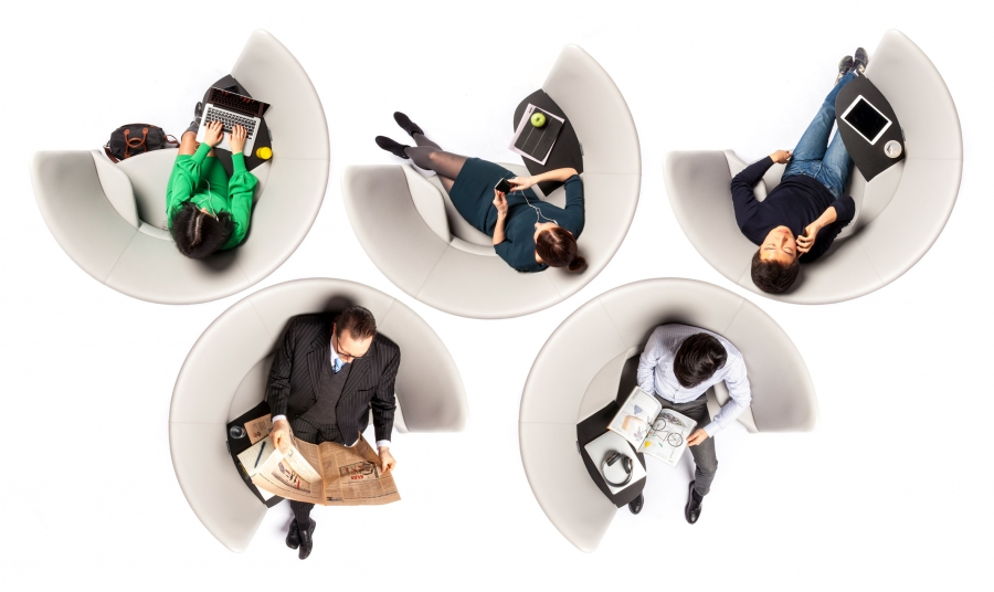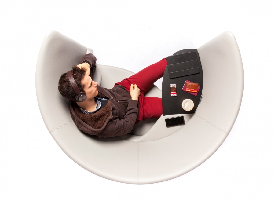 Su forma curvada incorpora un asiento amplio y cómodo, un punto de carga USB integrado, una fuente de alimentación de red opcional y una mesa que se puede utilizar como escritorio informal. Foster + Partners consideró instalarlas en espacios públicos, como salas de aeropuertos o recepciones de edificios.