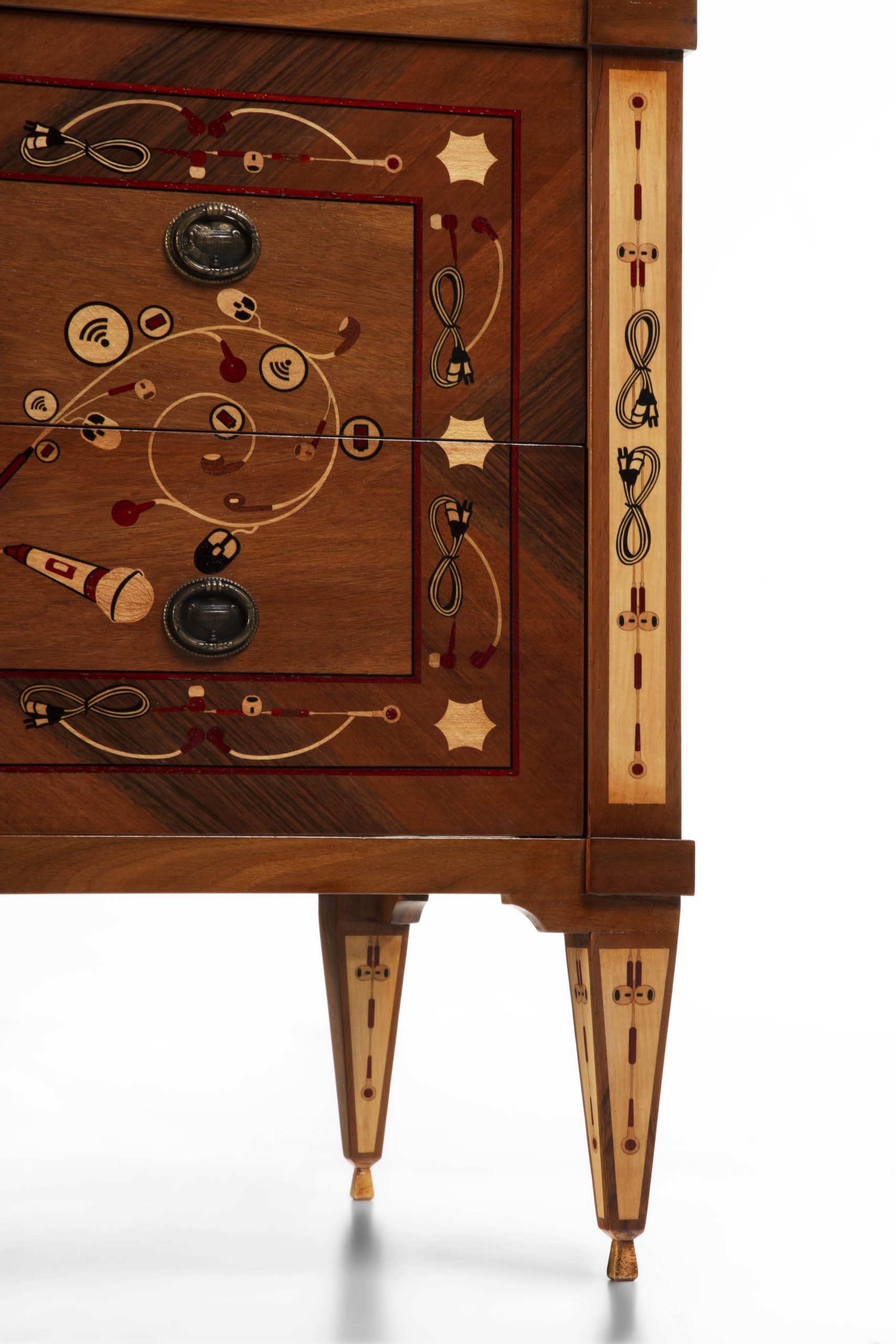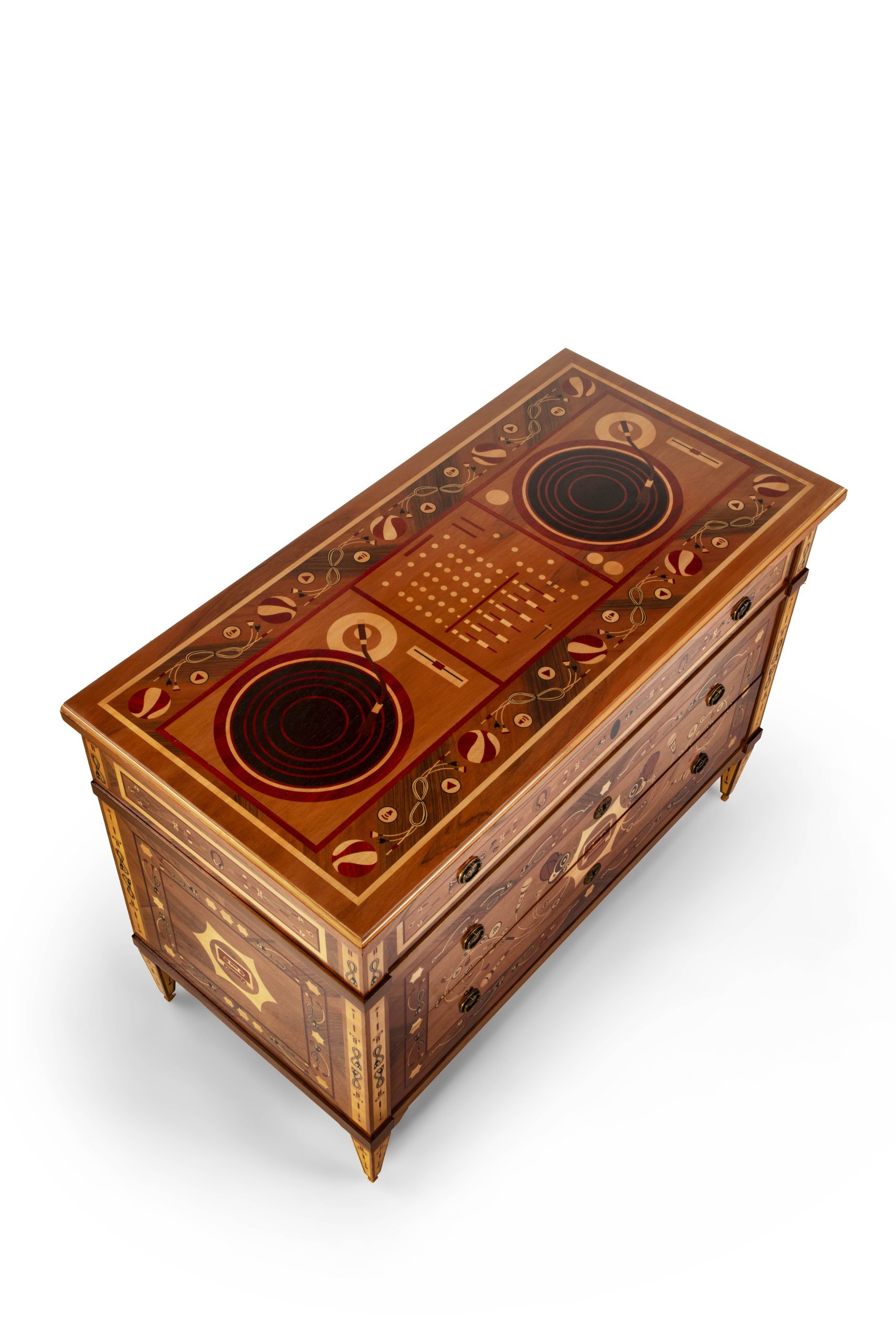 Entre marquetería lombarda y símbolos urbanos, Gigi XVI Hip-Hop transforma un arquetipo del siglo XVIII en una pieza contemporánea cargada de ironía y precisión formal.
