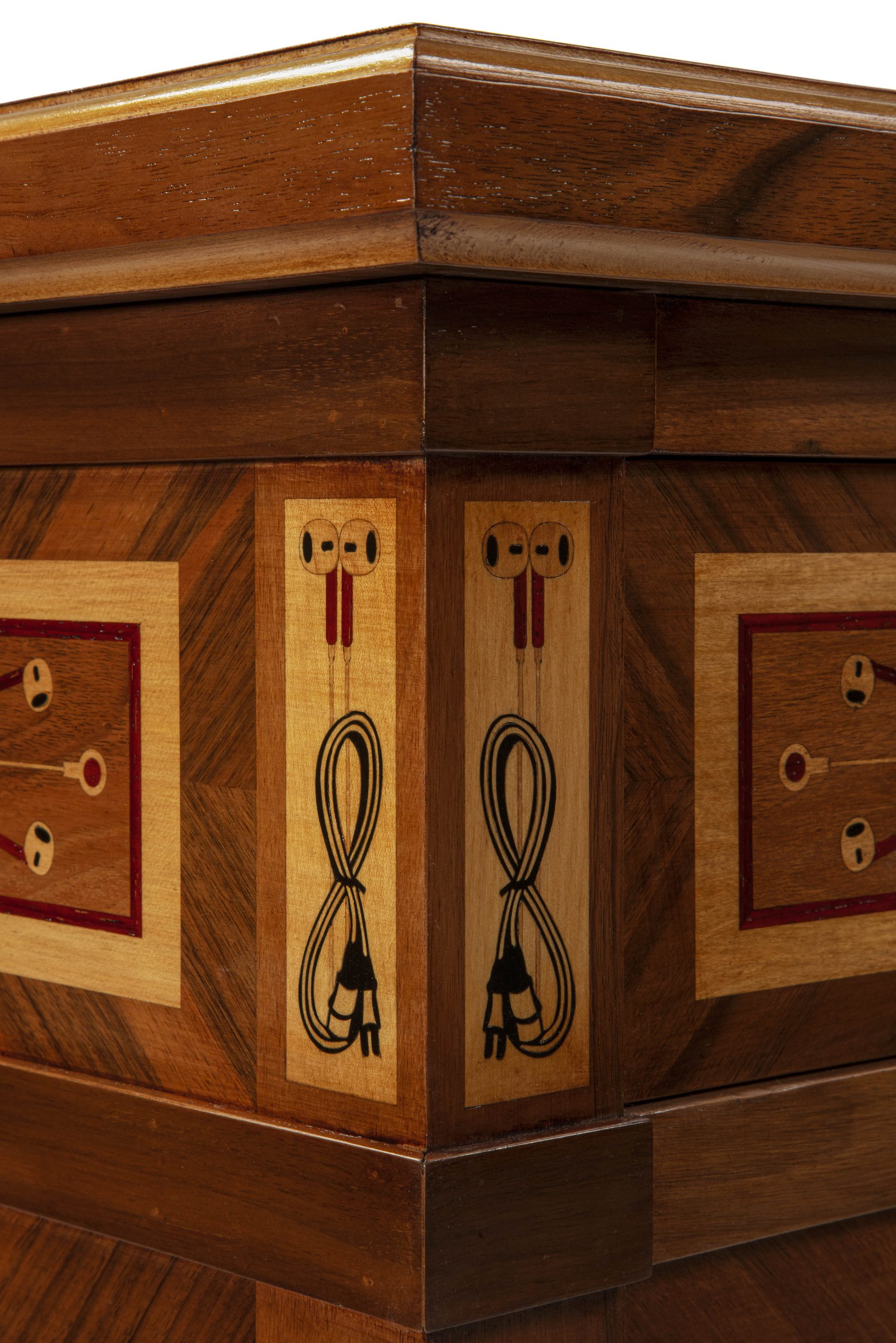 “El punto de partida es un arquetipo reinterpretado a través de nuevas incrustaciones, preservando y potenciando la centralidad de la madera y la marquetería”, señala. En ese sentido, la pieza no niega la historia: la absorbe y la traduce.