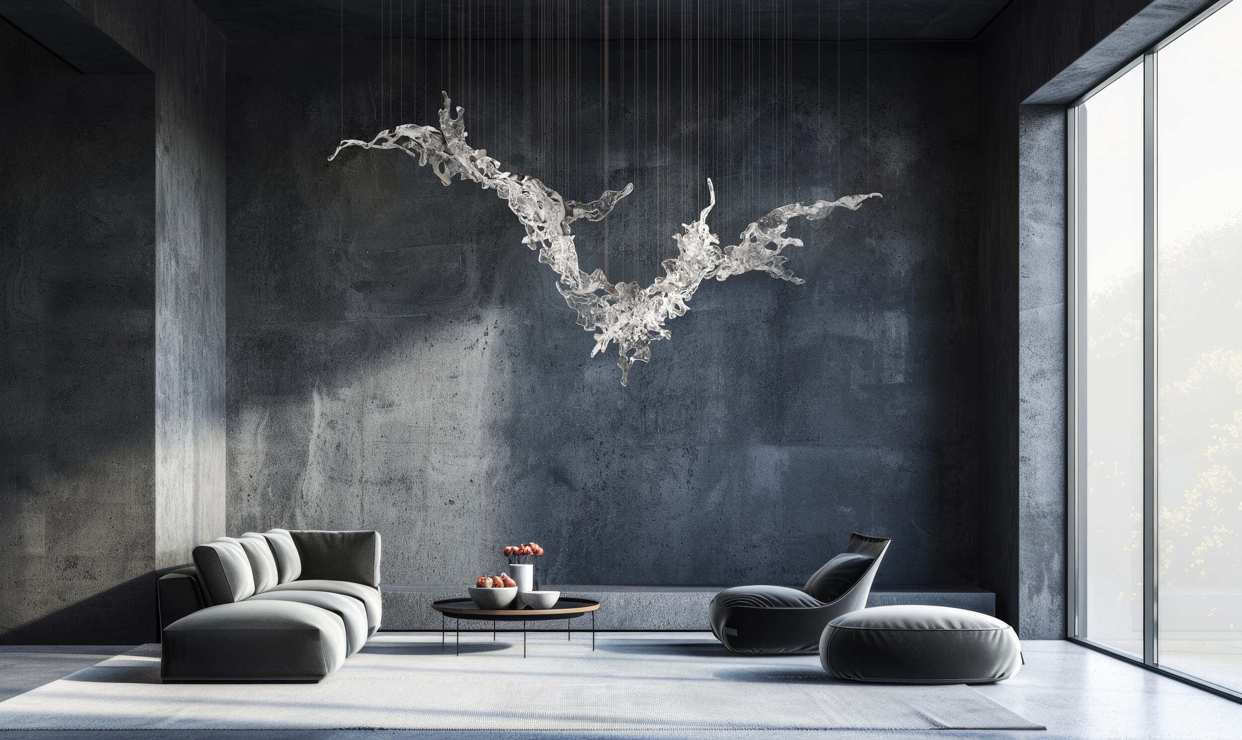 En Relief, tres esculturas de vidrio transparente —círculo, rectángulo y triángulo— cuestionan los límites entre objeto y escultura. Con superficies que evocan paneles acústicos, las piezas contrastan una estética industrial con un exigente proceso artesanal: el vidrio, calentado a 1,600 °C, se vierte en moldes de acero antes de ser pulido cuidadosamente. El resultado es un juego óptico donde luz, sombra y textura generan la ilusión de un relieve montañoso cambiante.