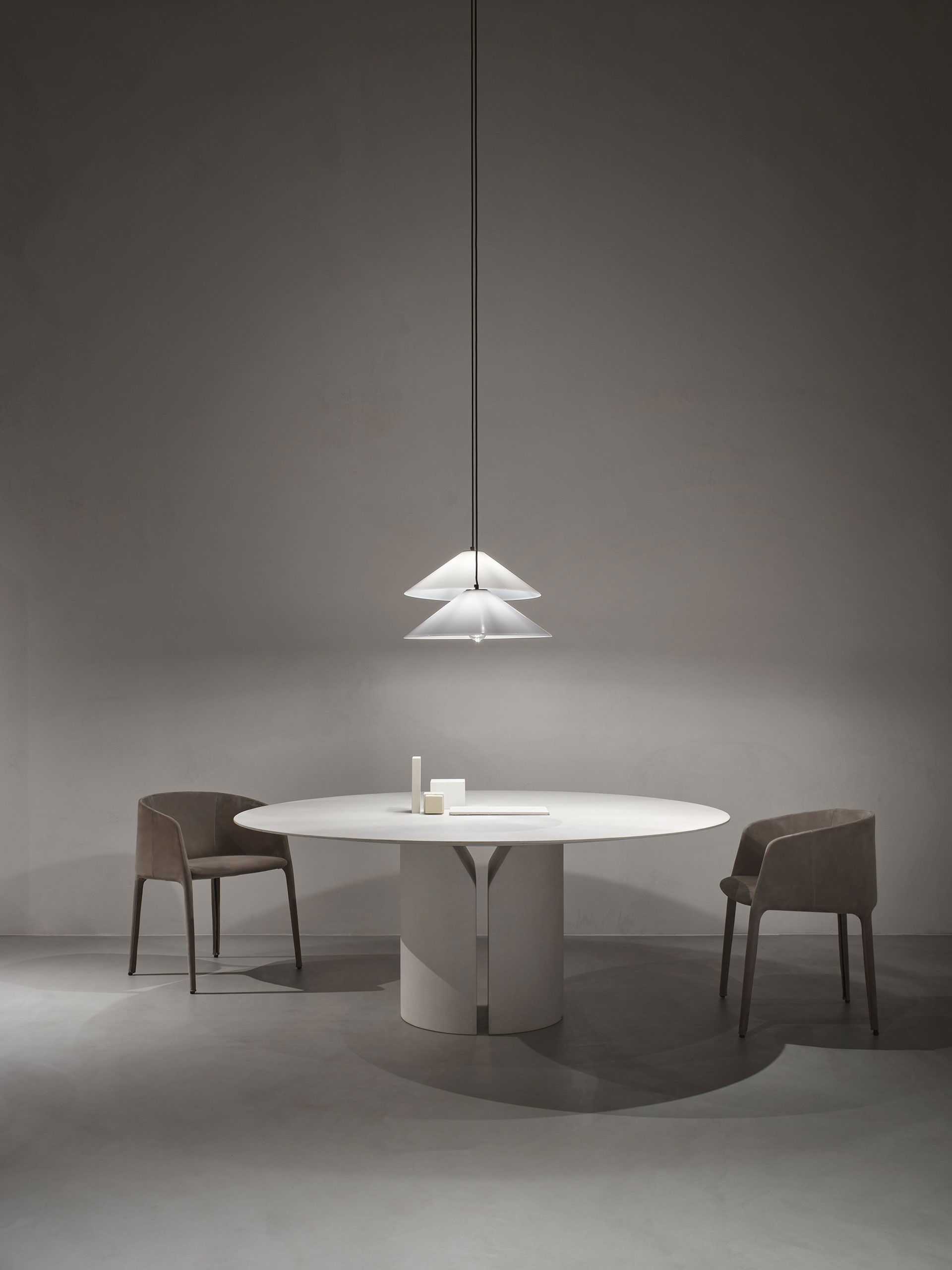 La sencillez de las formas dialoga armoniosamente con la solidez del material en un juego de contrastes: la cubierta de la mesa es delgada y ligera y parece flotar sobre la base.