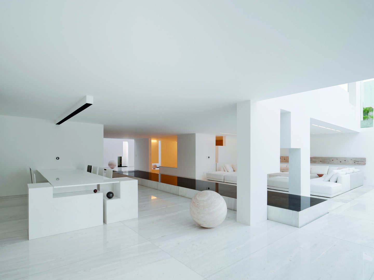Las líneas arquitectónicas depuradas y la blancura de las paredes, de los techos y del suelo, invitan a descubrir la casa-estudio de Miguel Ángel Aragonés, un espacio apacible, bañado de luz natural y con vistas hacia la vegetación, que da una sensación de paz absoluta.