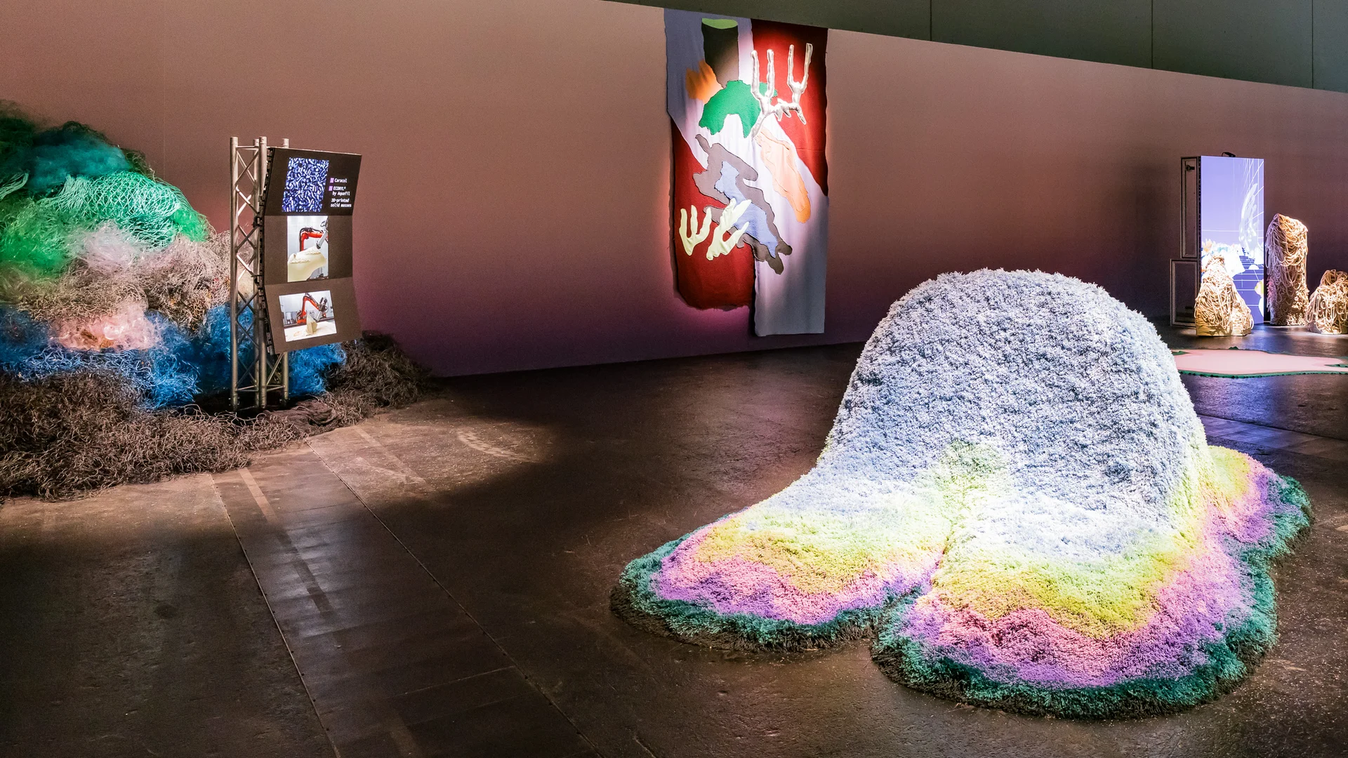 La instalación integra nylon regenerado, residuos textiles y materiales de base biológica, e invita a los visitantes a interactuar activamente con el espacio. Gracias a la IA, los movimientos del público se incorporan a la experiencia, reforzando la idea de un diseño vivo y participativo.
