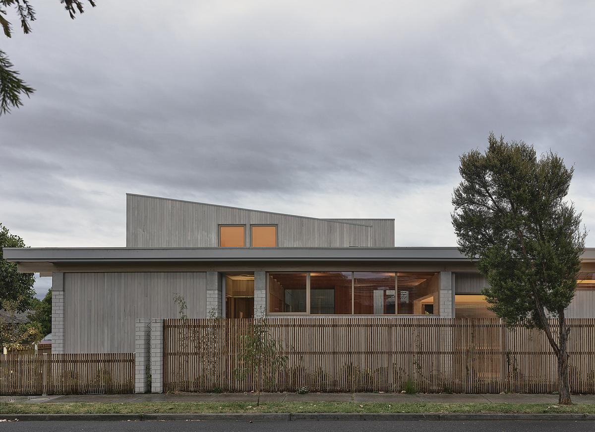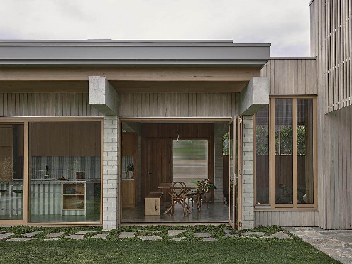Home Pavilion por MRTN Architects reinterpreta los recuerdos de infancia del cliente en una casa tipo Eichler en San Francisco. Ubicado en el barrio de Northcote, Victoria (Australia), este proyecto parte de una premisa emocional: capturar la esencia de los hogares del movimiento California Modern —caracterizados por planos abiertos, muros de cristal y estructuras post-and-beam— y trasladarla a un contexto suburbano australiano. Así, cocina, comedor y sala se articulan dentro de un pabellón central que funciona como el corazón social de la vivienda.