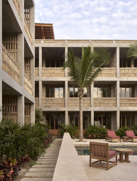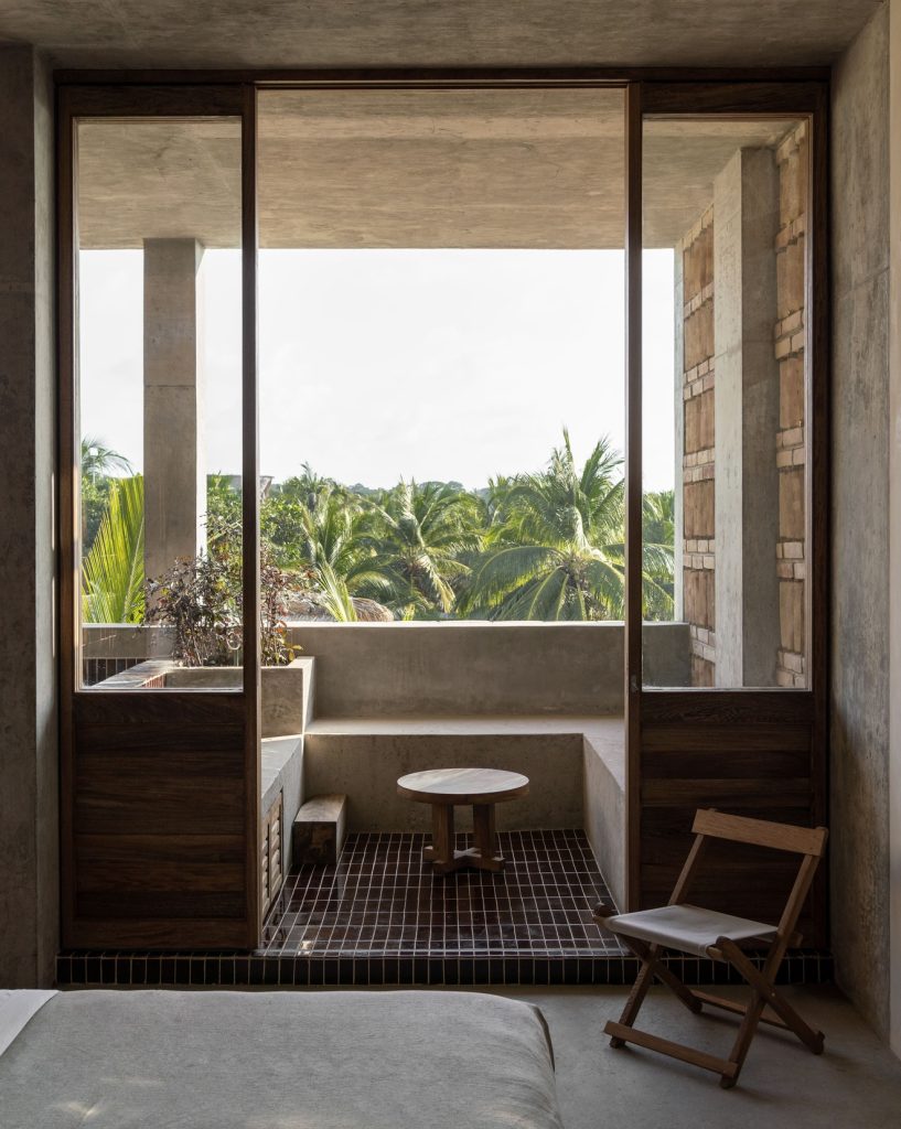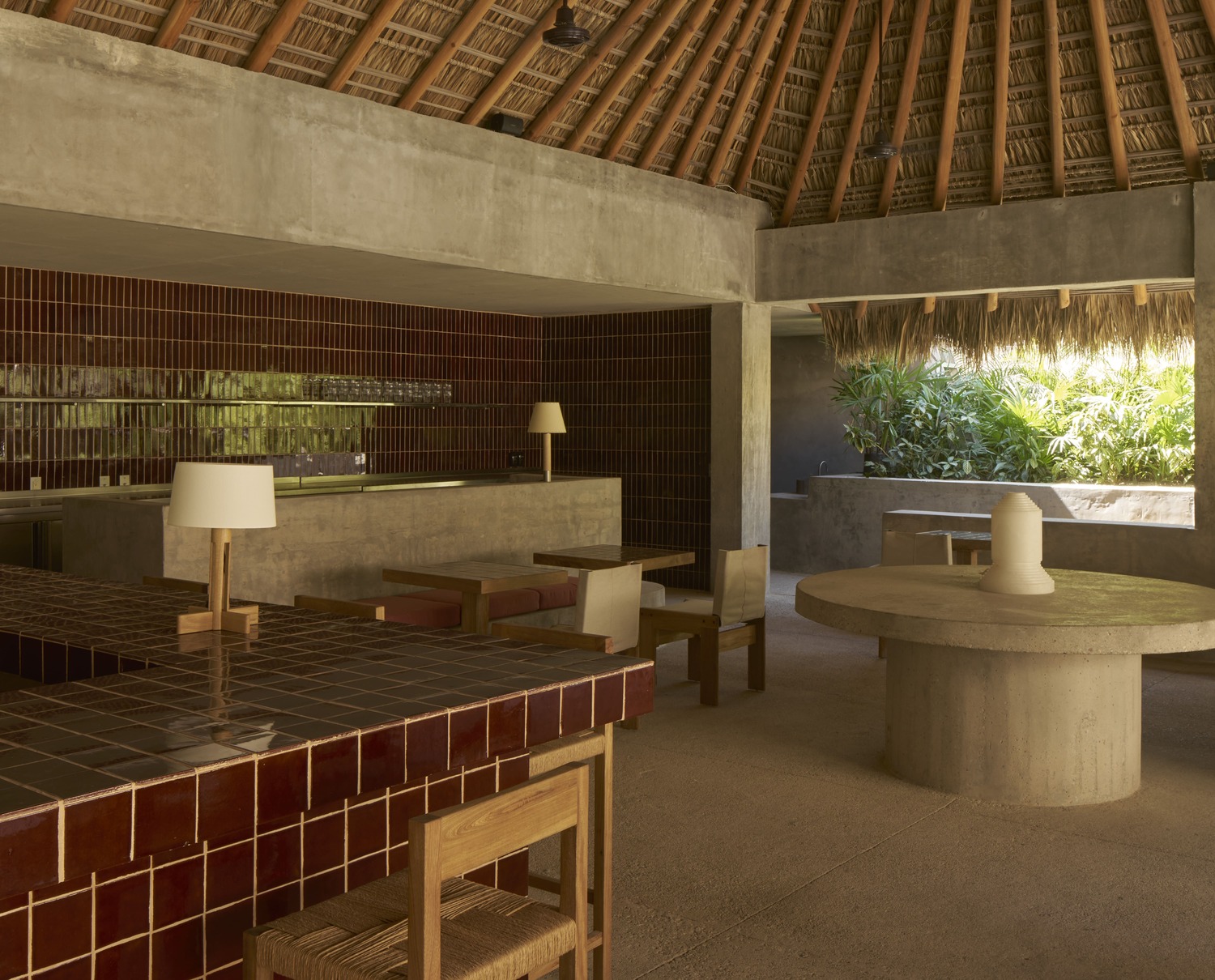 Con 39 habitaciones —incluidas 8 suites diseñadas para experiencias de lujo inmersas en la naturaleza—, el hotel combina confort contemporáneo y autenticidad artesanal. Los materiales —concreto aparente, barro blanco, cerámica y madera— evocan las construcciones vernáculas de la costa oaxaqueña, mientras que su disposición abierta favorece la ventilación cruzada y el contacto directo con el entorno.