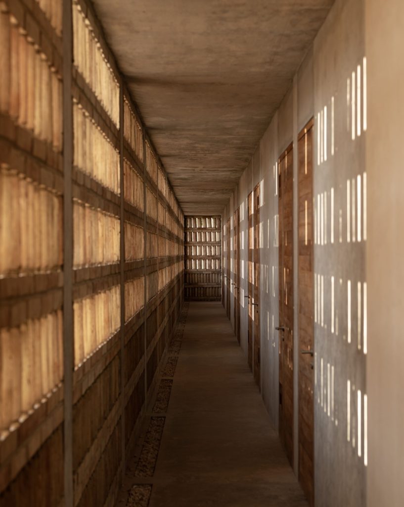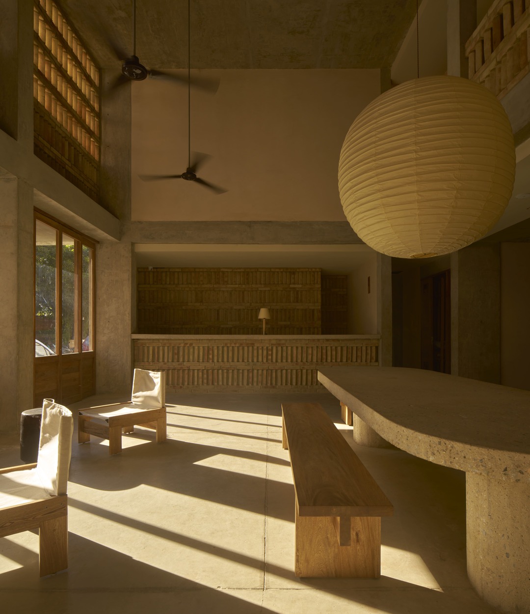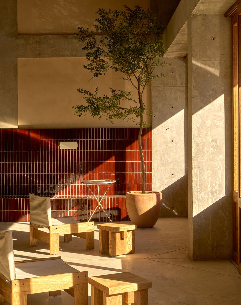 El lobby a doble altura, concebido como un espacio social y cálido, se convierte en un punto de encuentro tanto para huéspedes como para locales. Su bar y áreas de convivencia prolongan la atmósfera relajada de la playa, enmarcada por la luz cambiante que atraviesa una celosía de barro y proyecta sombras móviles sobre los muros.