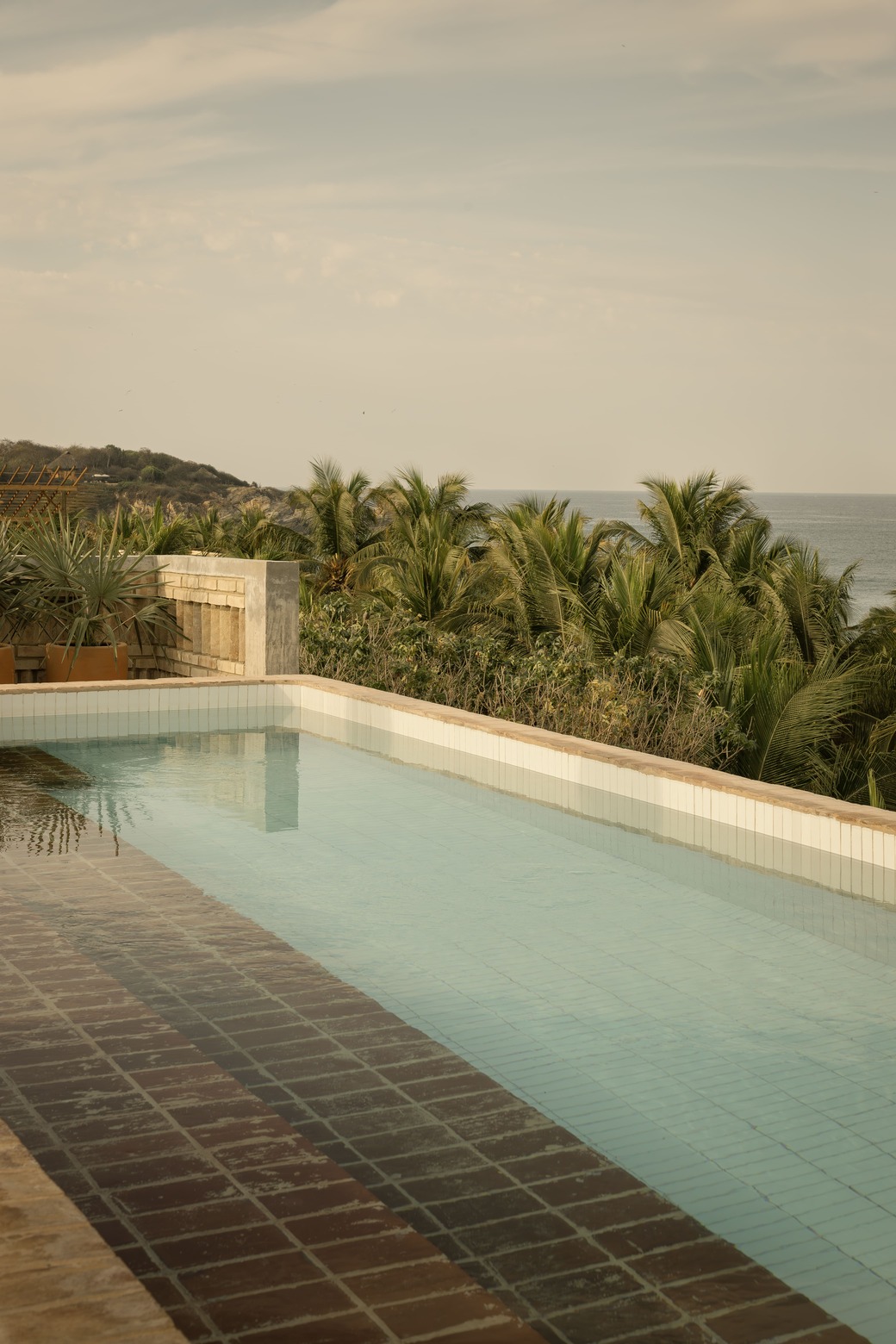 El juego de luz y aire es protagonista en todo el edificio. Durante el día, la celosía tamiza el sol y refresca el ambiente; al caer la tarde, la iluminación cálida transforma el conjunto en un refugio íntimo, donde cada textura cobra vida. Los espacios comunes —un patio central con alberca y el pool bistro— se integran orgánicamente con la vegetación nativa, invitando a disfrutar del clima y la brisa marina.