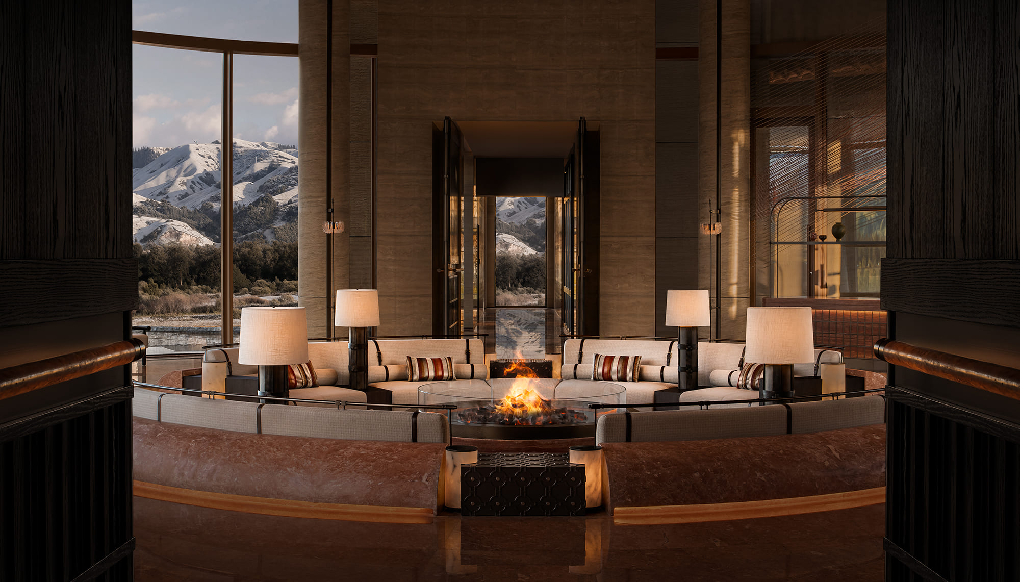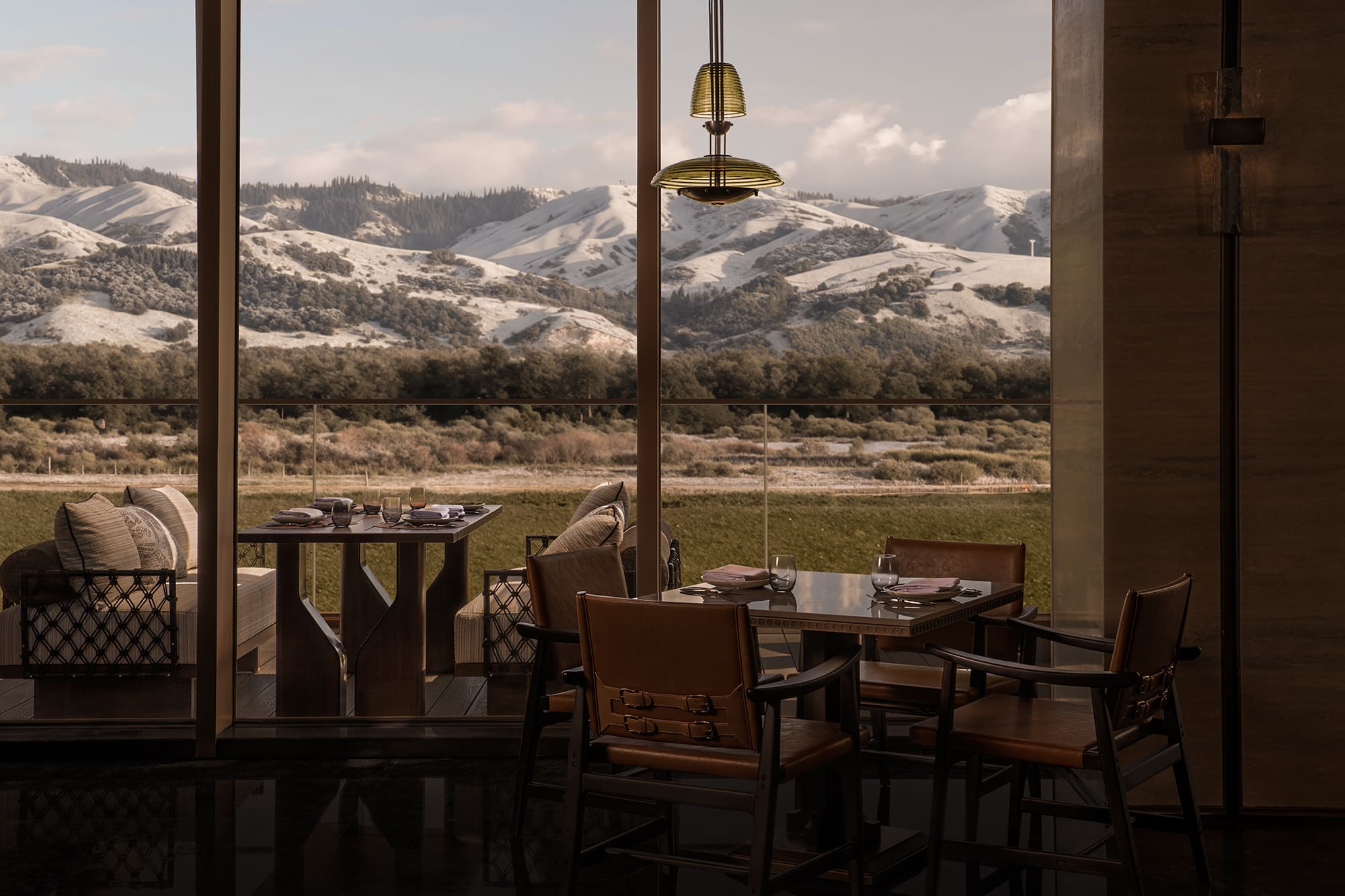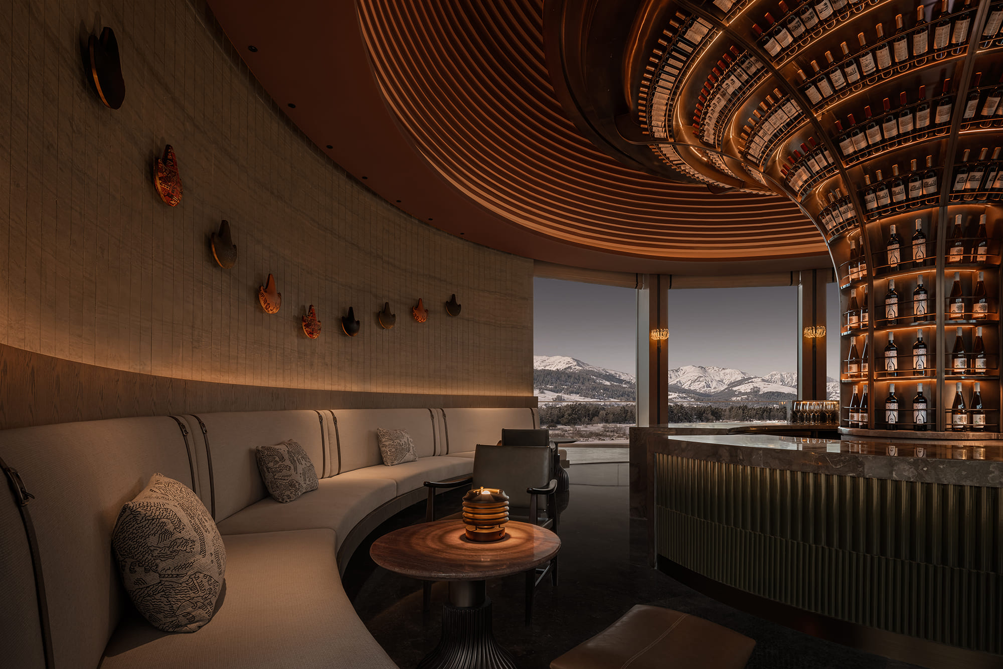 La luz natural se filtra a través de patrones superpuestos que recuerdan la tierra al deshielo, dialogando con la estructura rítmica de las columnas. Un ventanal curvo enmarca el paisaje infinito de los pastizales y las montañas Tianshan, integrando el exterior al interior.