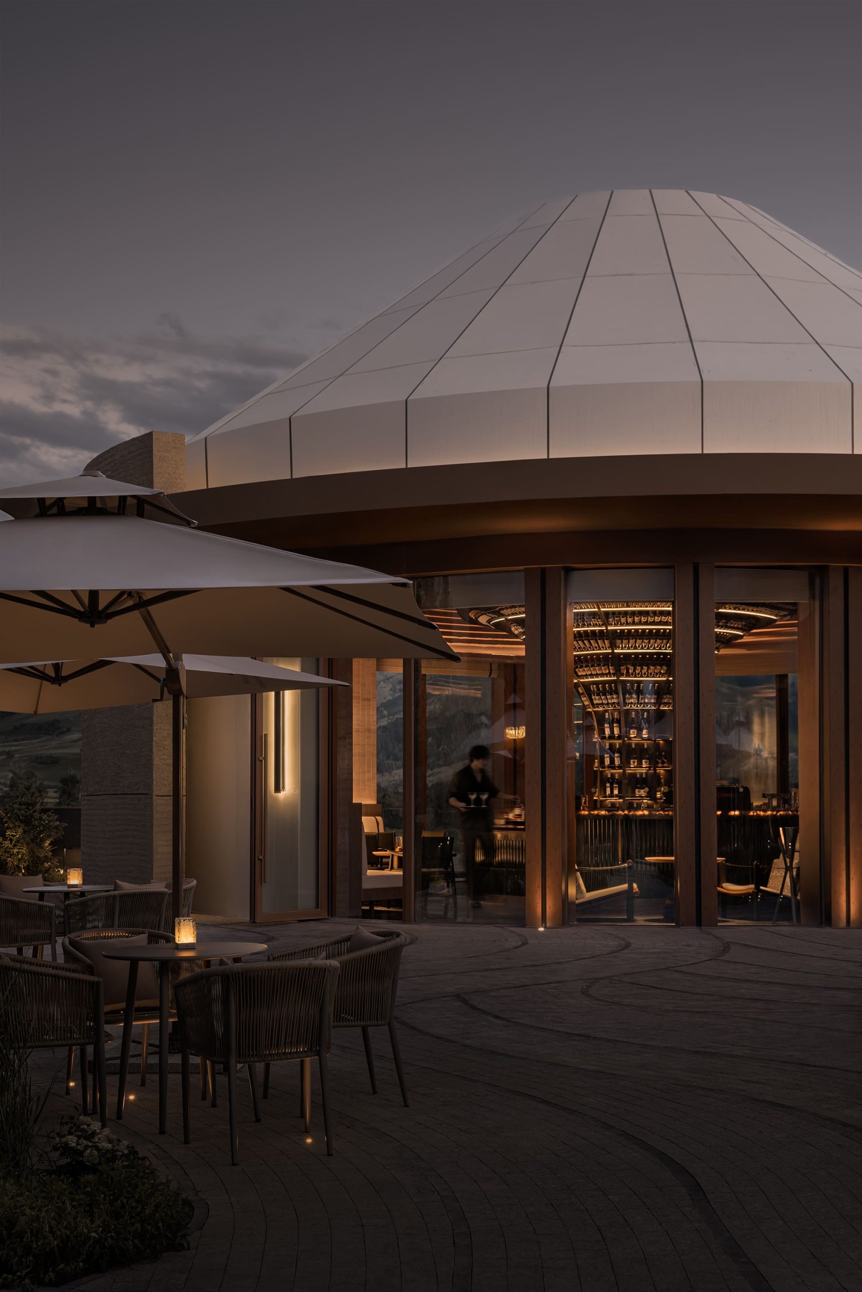 El bar circular simboliza un árbol solitario en la estepa, un punto de encuentro y refugio. Curvas, recorridos fluidos y juegos de perspectiva crean una experiencia espacial dinámica, donde interior y exterior dialogan constantemente.