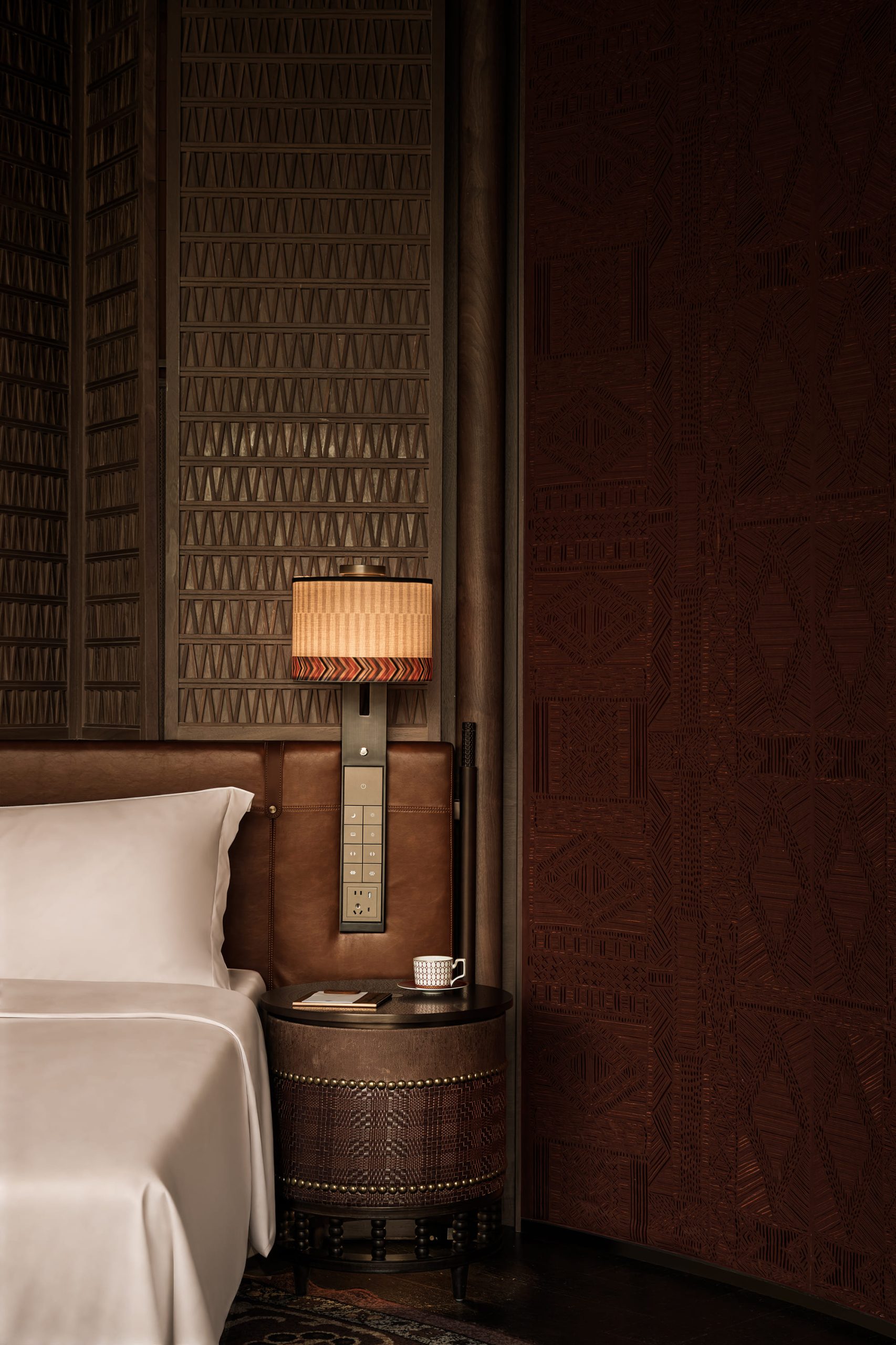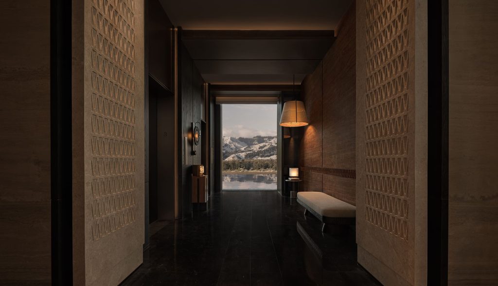 Las habitaciones reinterpretan la yurta como espacio íntimo y protector. Puertas de madera tallada, tragaluces inspirados en la arquitectura tradicional y patrones geométricos crean una atmósfera envolvente. De día, la luz proyecta sombras poéticas; de noche, el cielo estrellado se convierte en parte del descanso.