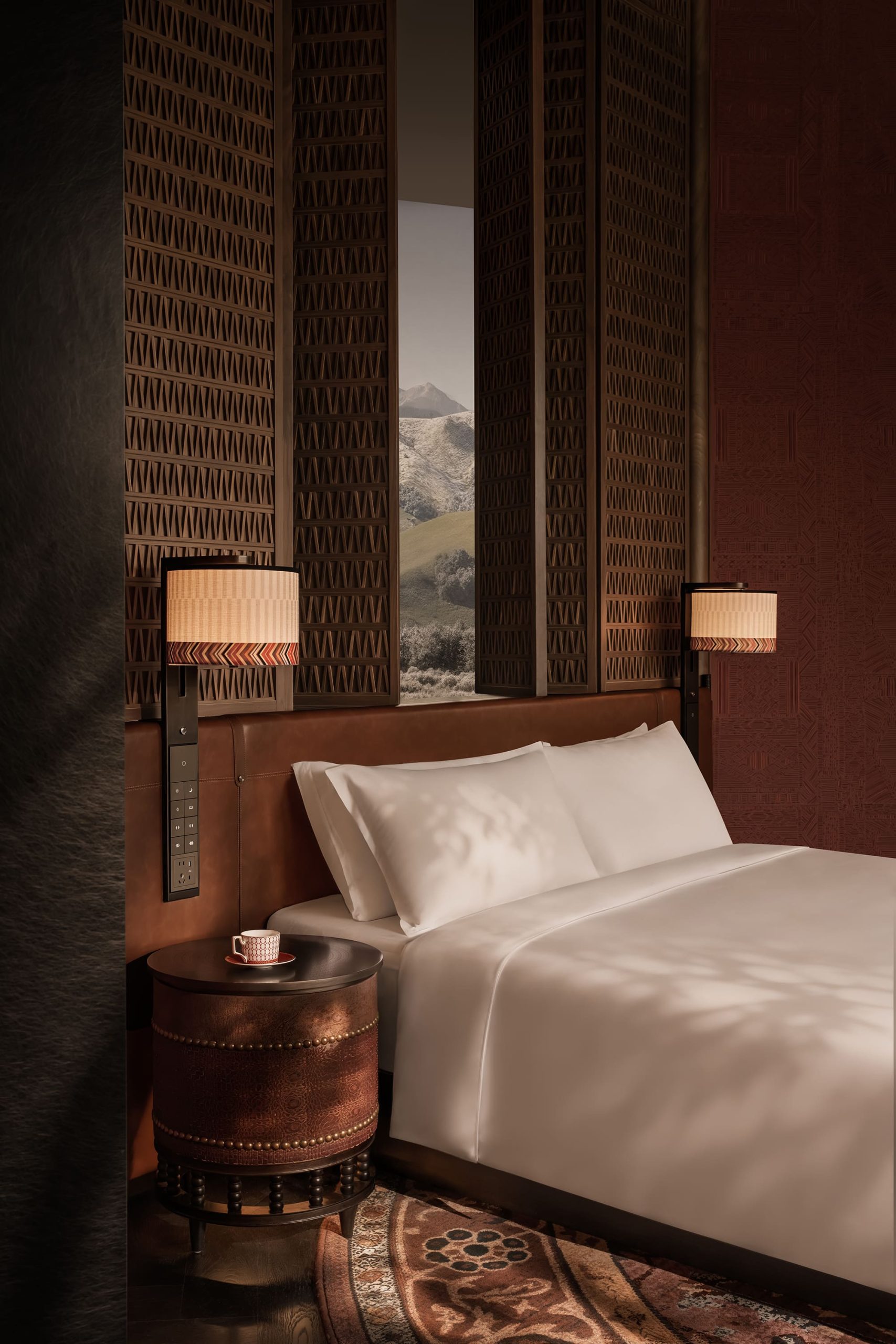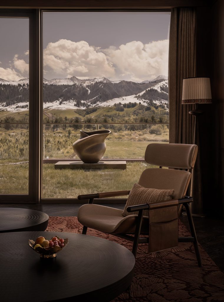 Detalles artesanales —alfombras de fieltro, motivos locales, herrajes inspirados en la equitación, referencias al pan naan y al komuz— construyen un relato sensorial que trasciende lo decorativo. Cada elemento remite a la vida nómada y a la relación profunda con el entorno.
